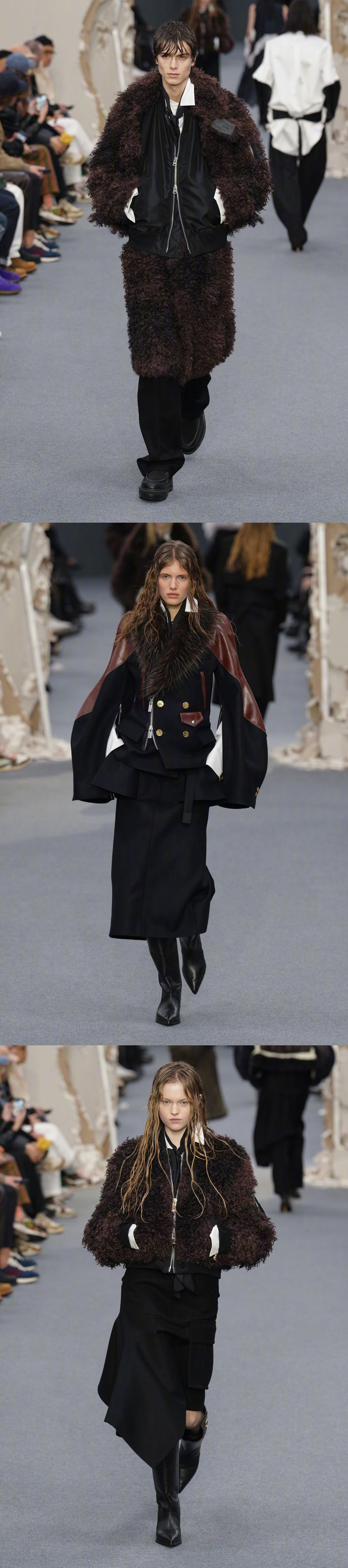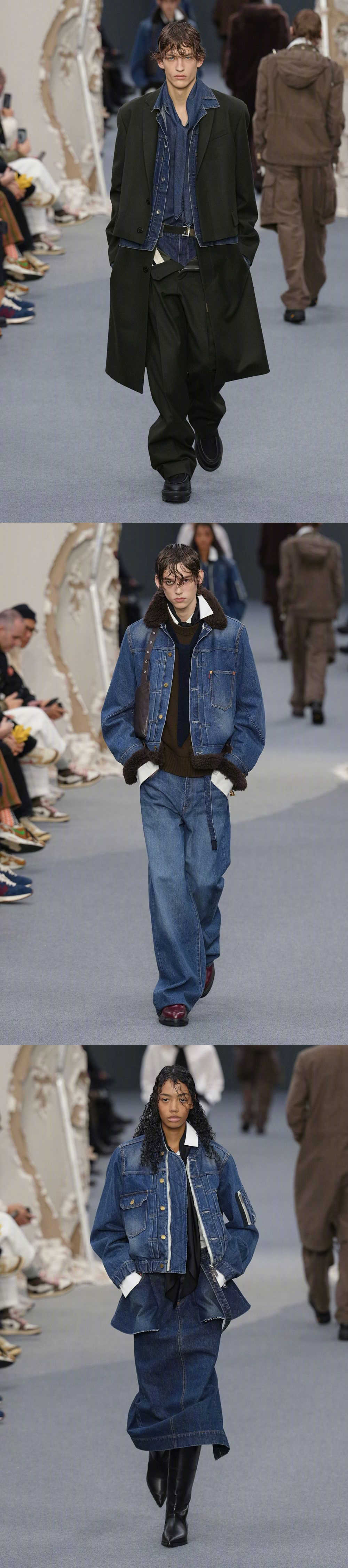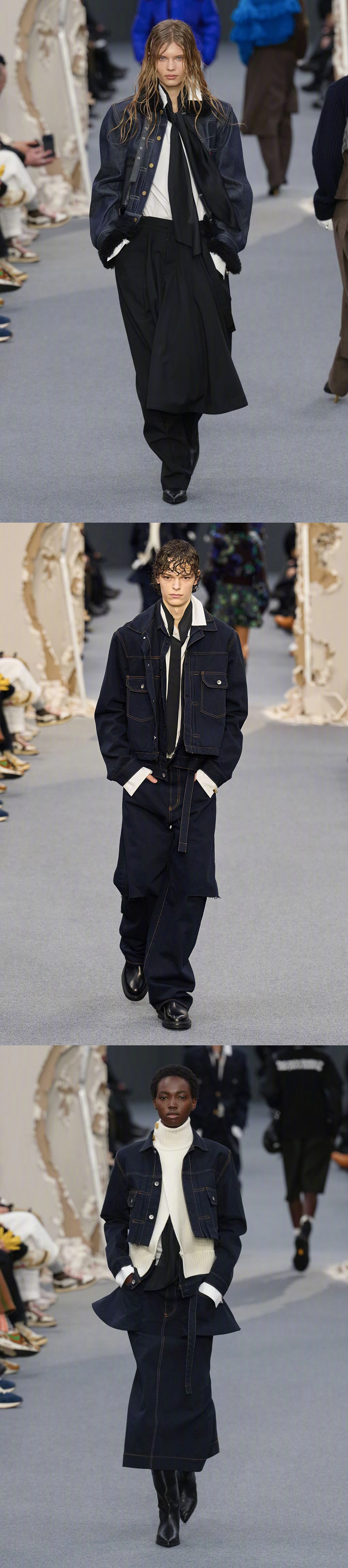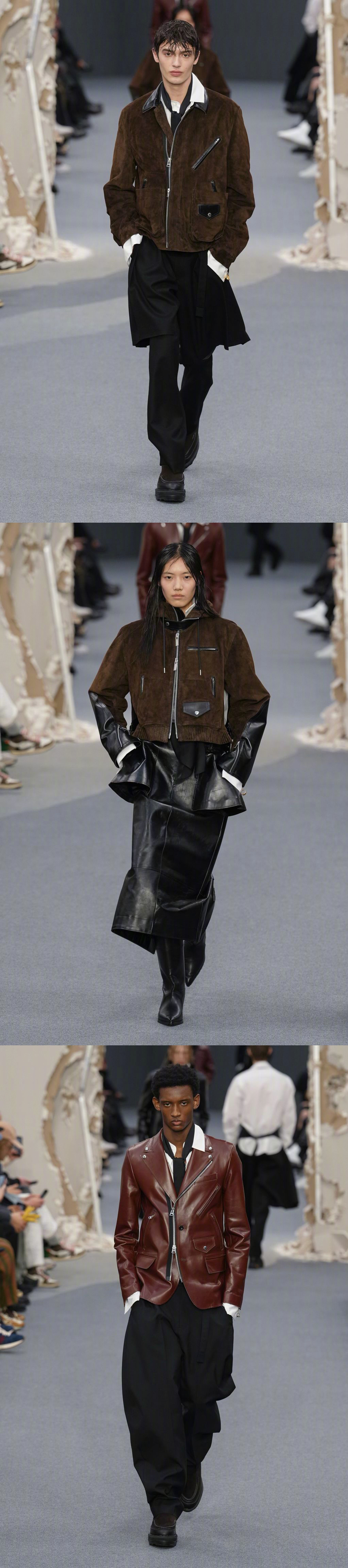 SACAI F/W 2026 巴黎男装周 秋冬男装/ 秋季女装共同发布,品牌标志性解构形式,皮革、牛仔、羊绒... 玩传统廓形和材料,融入日常的混合美学。国模贺聪、李禾佳等国模亮相~ 男装周