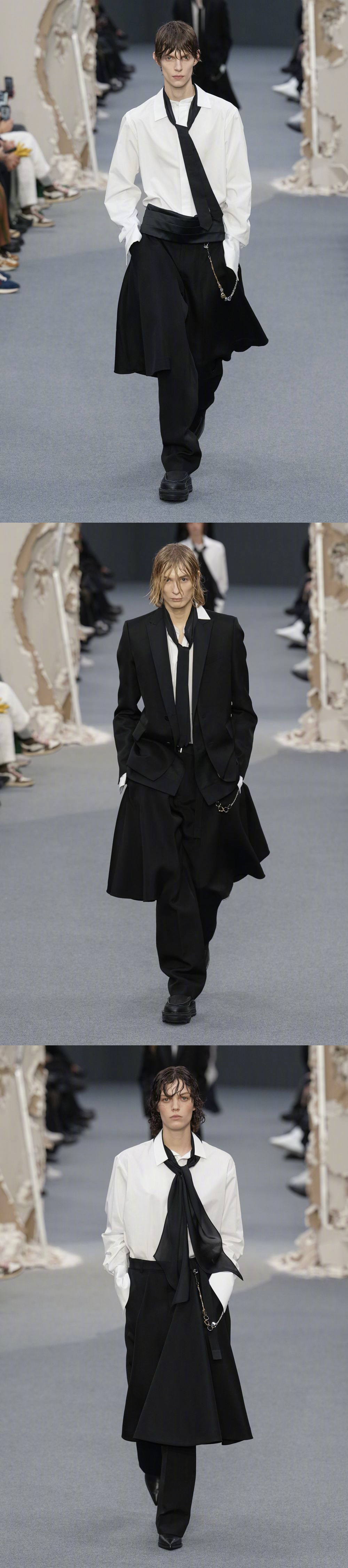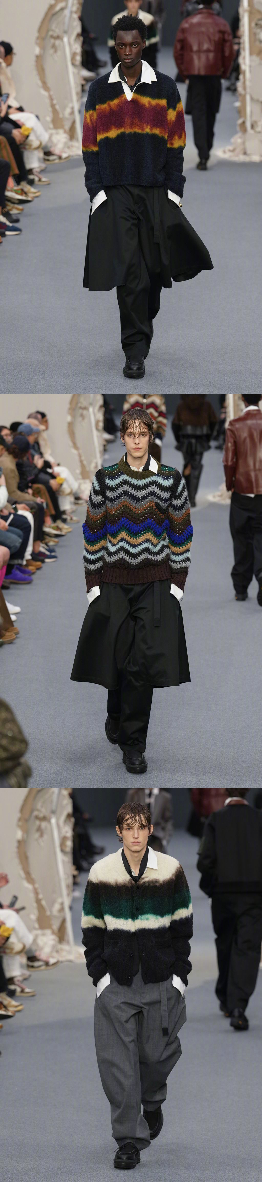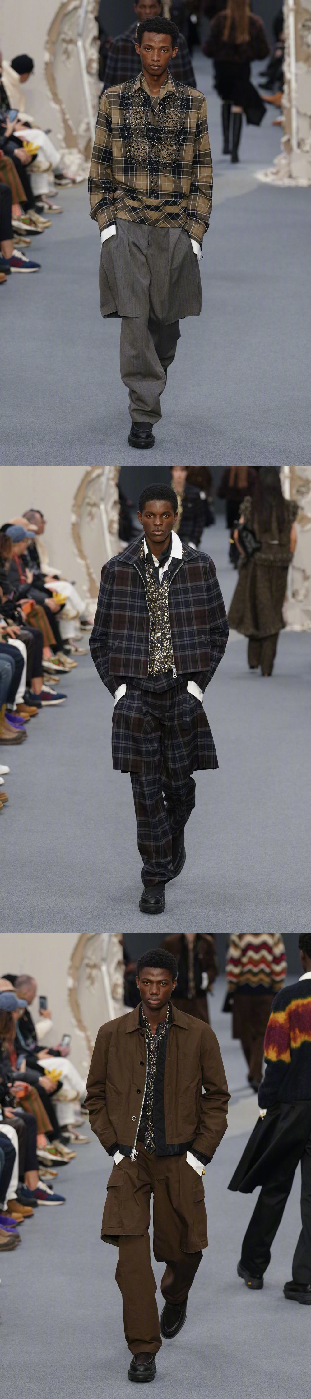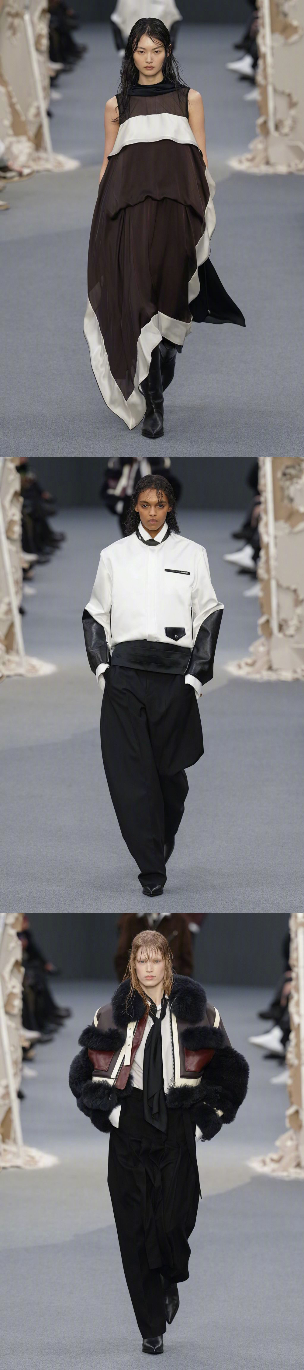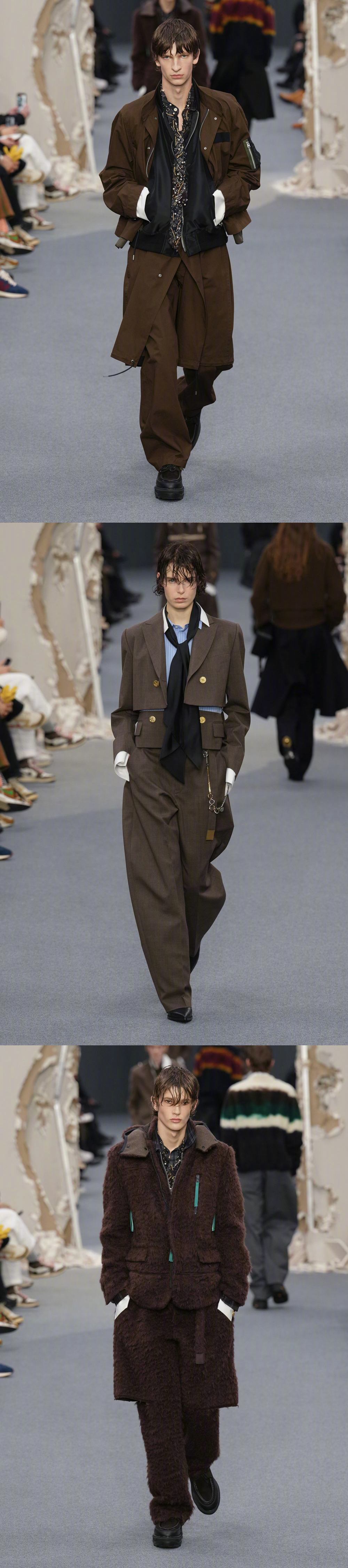 SACAI F/W 2026 巴黎男装周 秋冬男装/ 秋季女装共同发布,品牌标志性解构形式,皮革、牛仔、羊绒... 玩传统廓形和材料,融入日常的混合美学。国模贺聪、李禾佳等国模亮相~ 男装周