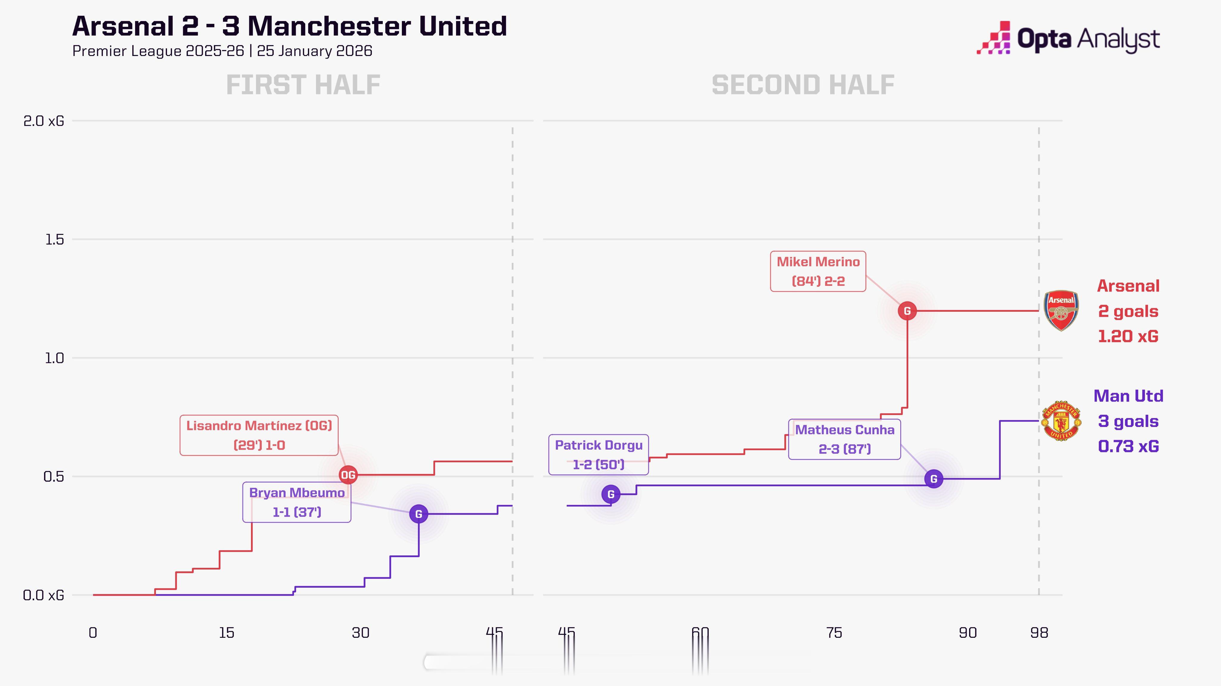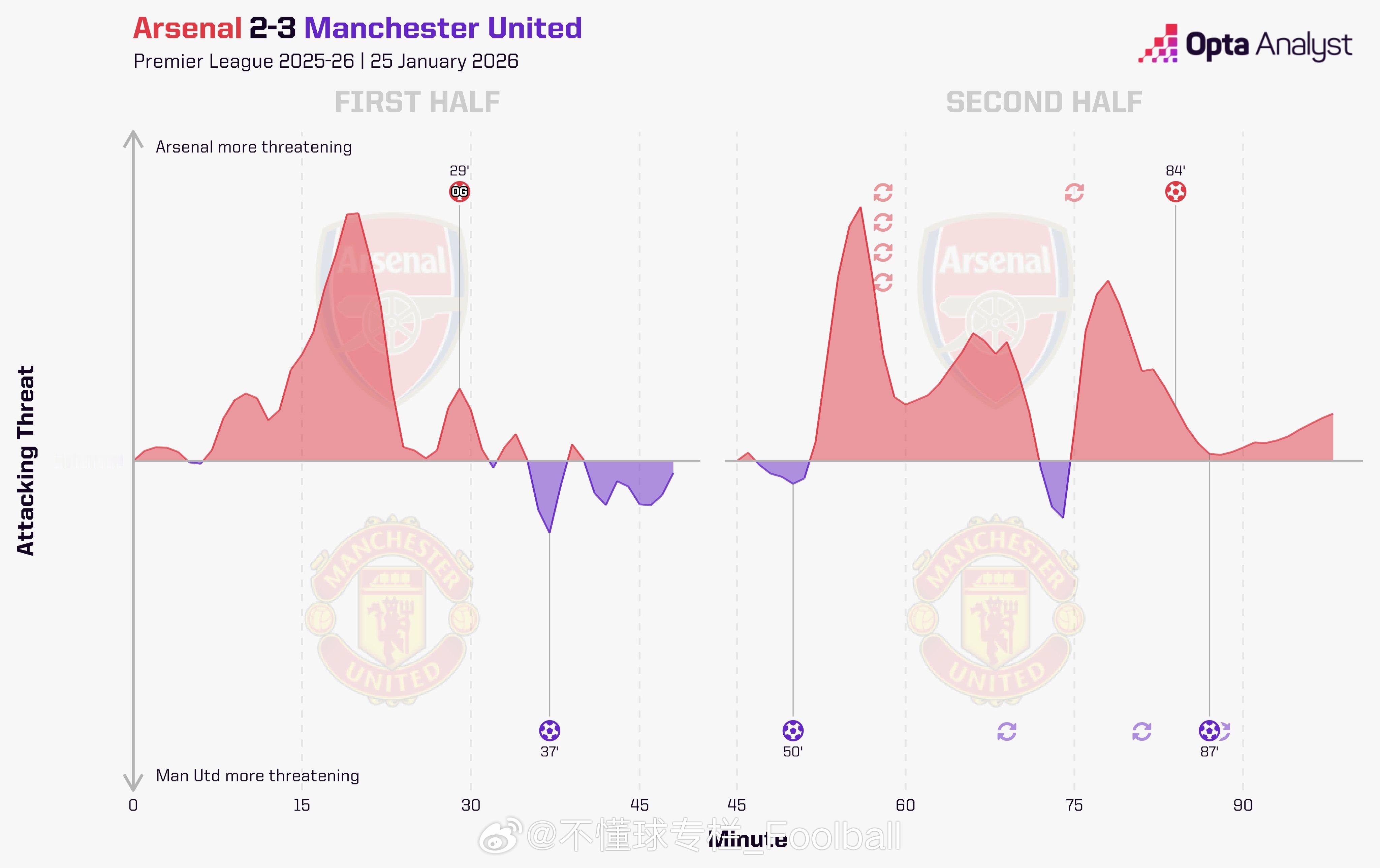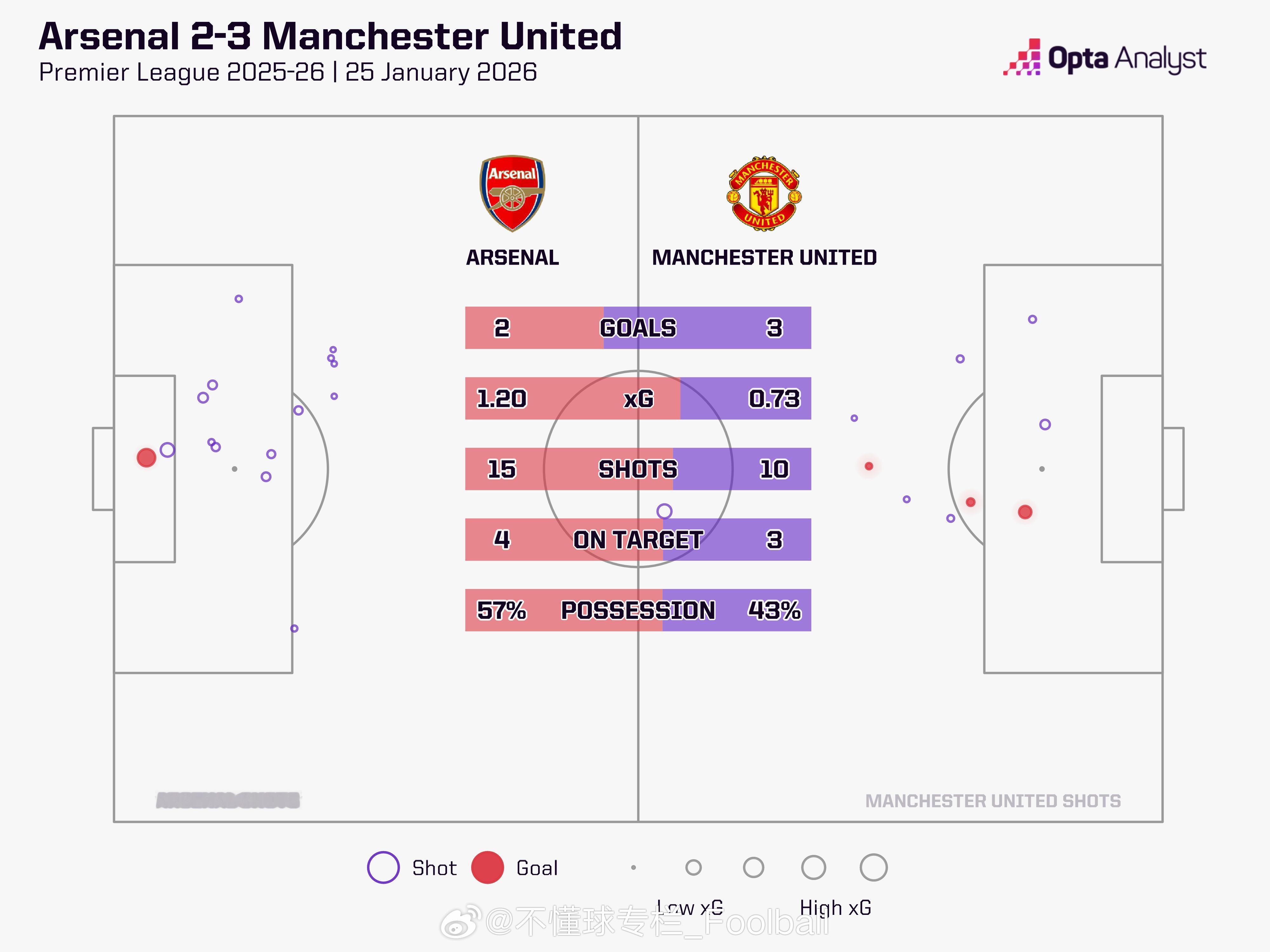 Opta的数据、预期进球图和进攻威胁波形图。一些xG的魅力时刻:布鲁诺最后时刻的吊射有0.24的xG…曼联英超联赛阿森纳2比3曼联