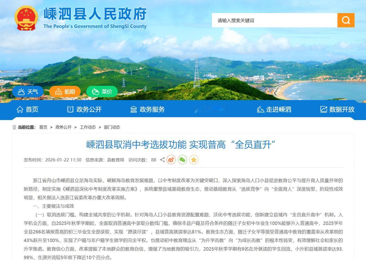 浙江省舟山市嵊泗县取消中考选拔功能 实现普高"全员直升"
