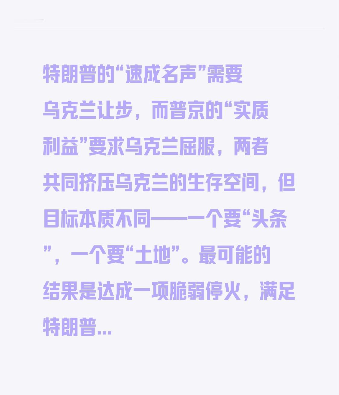 特朗普的“速成名声”需要乌克兰让步,而普京的“实质利益”要求乌克兰屈服,两者共同挤压乌克兰的生存空间,但目标本质不同——一个要“头条”,一个要“土地”。最可能的结果是达成一项脆弱停火,满足特朗普的“宣传需要”和普京的“固化现状需要”,但核心领土问题被搁置,冲突进入“冻结”状态。乌克兰可能被迫接受有限安全保障,但国家完整已遭永久损伤。