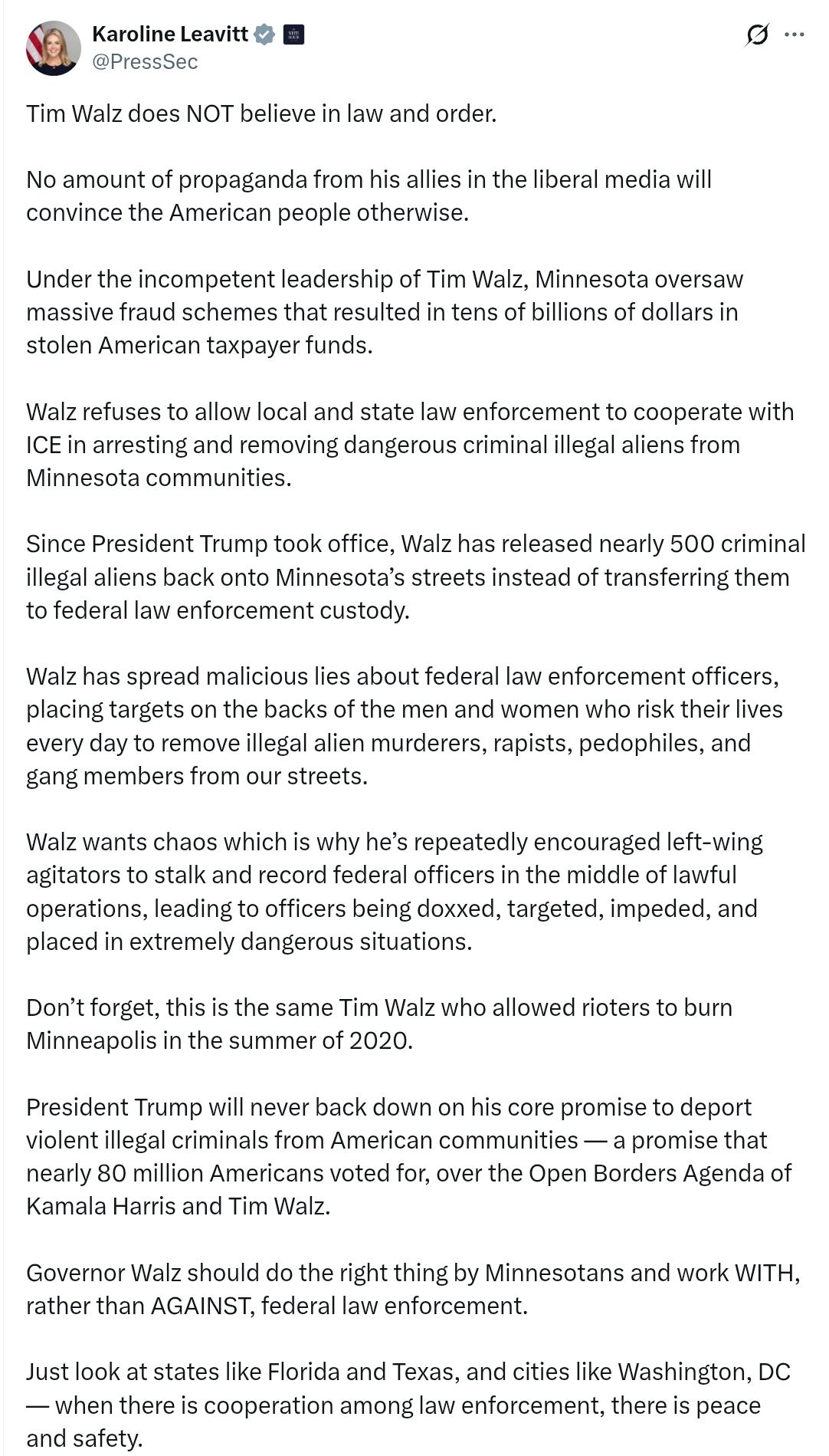 2026年1月26日 02:00:22白宫新闻秘书卡罗琳·莱维特发文对明尼苏达州州长蒂姆·沃尔兹的回应: 蒂姆·沃尔兹根本不相信法律与秩序。来自他自由派媒体盟友的任何宣传都无法说服美国人民相信相反的事实。在蒂姆·沃尔兹无能的领导下,明尼苏达州发生了大规模欺诈计划,导致数百亿美元的美国纳税人资金被盗。沃尔兹拒绝允许地方和州执法机构与ICE合作,逮捕并驱逐明尼苏达社区中危险的犯罪非法移民。自特朗普总统上任以来,沃尔兹已将近500名犯罪非法移民释放回明尼苏达街头,而不是将他们移交给联邦执法机构拘押。沃尔兹散布关于联邦执法官员的恶意谎言,给那些每天冒着生命危险、从我们街头清除非法移民凶手、强奸犯、恋童癖者和帮派成员的男女执法人员背后贴上了靶子。沃尔兹想要混乱,这就是为什么他一再鼓励左翼煽动者在合法行动中跟踪和录像联邦官员,导致官员被“人肉搜索”、被针对、被阻挠,并置于极其危险的境地。别忘了,这正是同一个蒂姆·沃尔兹,他在2020年夏天允许暴徒焚烧明尼阿波利斯。特朗普总统绝不会退缩,他对从美国社区驱逐暴力非法犯罪分子的核心承诺——近8000万美国人投票支持这一承诺,而不是支持卡玛拉·哈里斯和蒂姆·沃尔兹的开放边境议程。沃尔兹州长应该为明尼苏达人民做正确的事,与联邦执法机构合作,而不是对抗他们。看看佛罗里达州、得克萨斯州这样的州,以及华盛顿特区这样的城市——当执法机构之间存在合作时,就会有和平与安全。