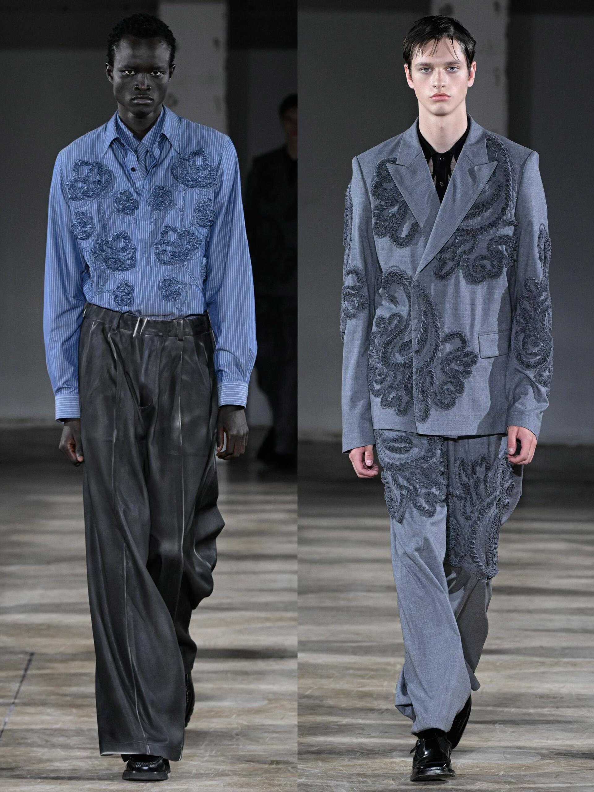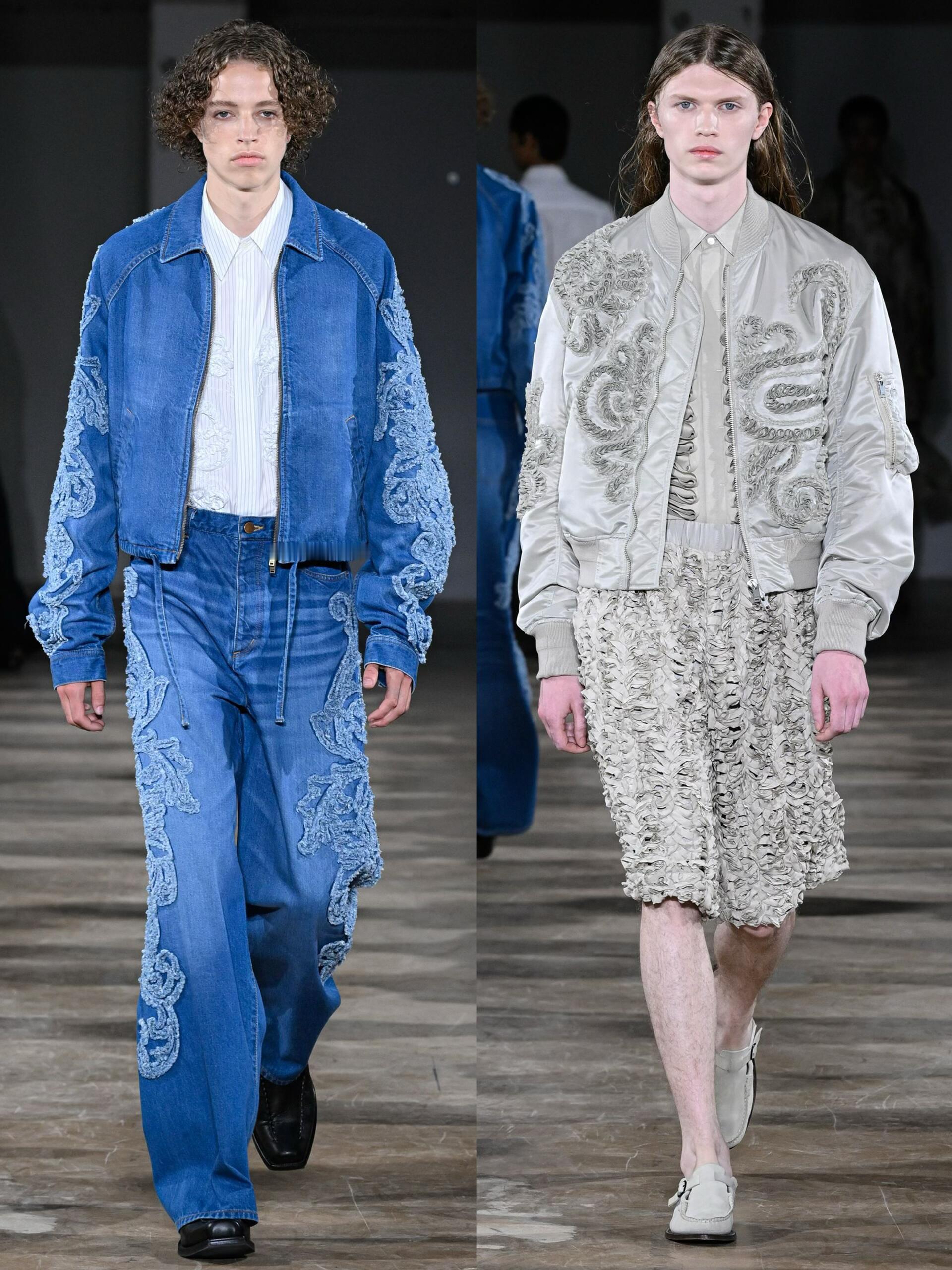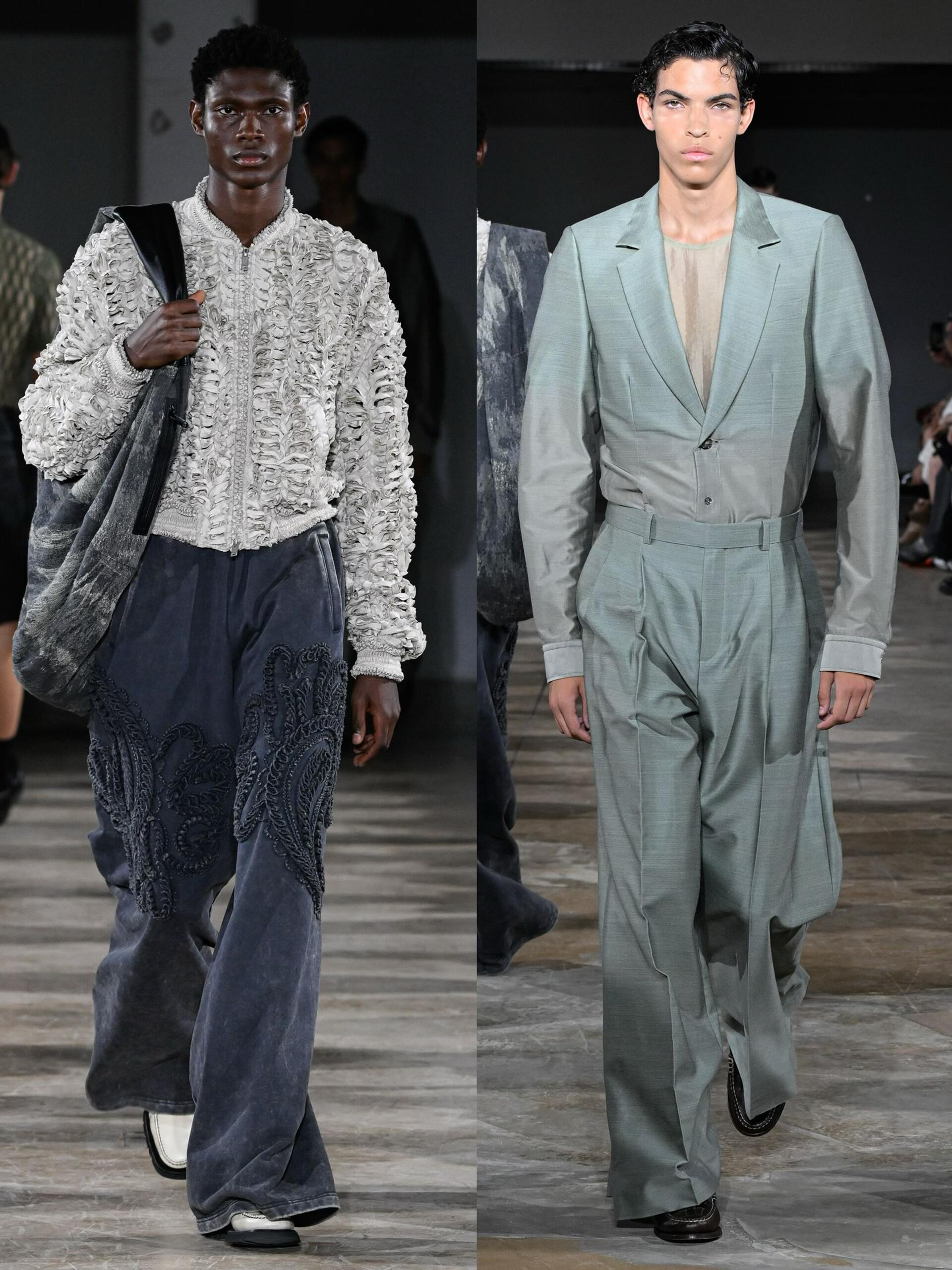 男装周巴黎男装周大秀直击 日本设计师森川正德的品牌TAAKK在SS2026男装系列中,用建筑感剪裁重构日常穿搭的想象。本季延续品牌标志性的立体廓形,加入真实褶皱纹理替代平面印花,在硬朗线条里融入蕾丝等柔美元素,模糊性别边界,诠释无性别穿搭的高级感。这种兼具未来主义与优雅质感的设计,让服装不仅是身体的容器,更成为可穿的雕塑,为追求个性的穿搭者提供了打破常规的选择。
