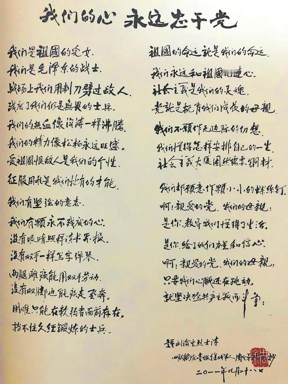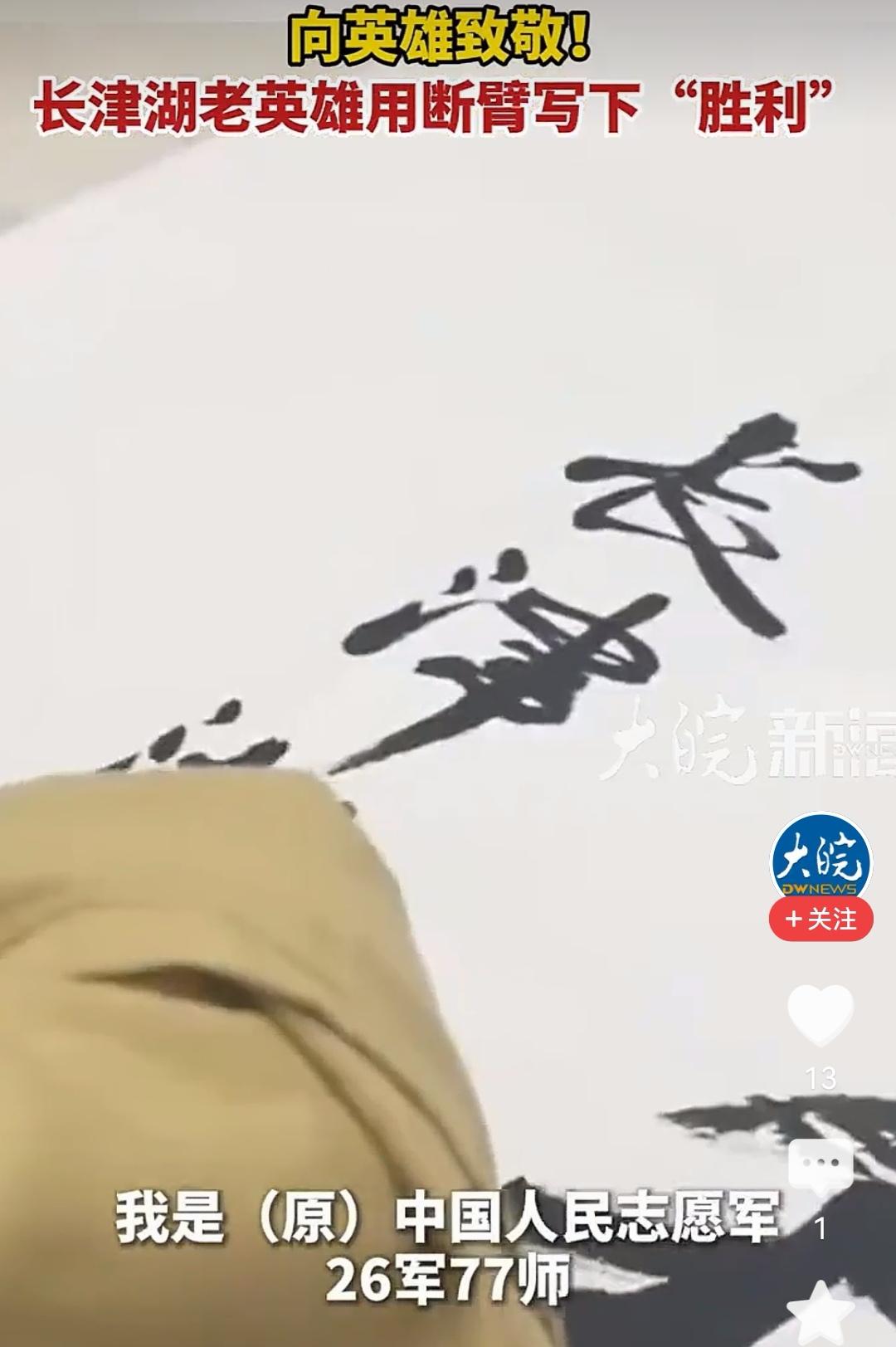 长津湖老英雄用断臂写下“胜利” 面对美国全球“长臂管辖”,日本挑起事端制造地区紧张局势,原中国人民志愿军26军77师231团一营二连战士周全弟用双残之臂写下“胜利”,同时“向祖国报到”。 向老英雄致敬!前辈周全弟,四川南部县人,一级伤残军人。1950年10月朝鲜战场上,在对抗美军王牌部队海军陆战队第一师与美第七师31团的阻击战中,身穿单薄棉衣,在零下40℃的雪地里埋伏了3天3夜,致使,双手从前臂处、双腿从大腿根部截除。 没有岁月静好,只是有人为你负重前行。70多年前的那场卫国之战,打出了新中国在美帝侵略下的威风志气,打出了中国军人顽强毅力和不畏困苦艰难,不怕牺牲,敢于拼搏的英雄豪气,不仅重重打了美国一拳,还狠狠的扇了一巴掌。特别是长津湖战役彻底扭转了朝鲜战局,全歼美军1个整团,迫使美军“最长距离撤退”,为停战谈判奠定了基础,也铸就了“冰雕连”英雄故事永远千古留芳的佳话。 如今,中国已经屹立世界东方,中国军队有绝对抵御外敌和“统一”中国的能力,借着老英雄的“胜利”,披荆斩棘勇往直前。长津湖畔祭英烈