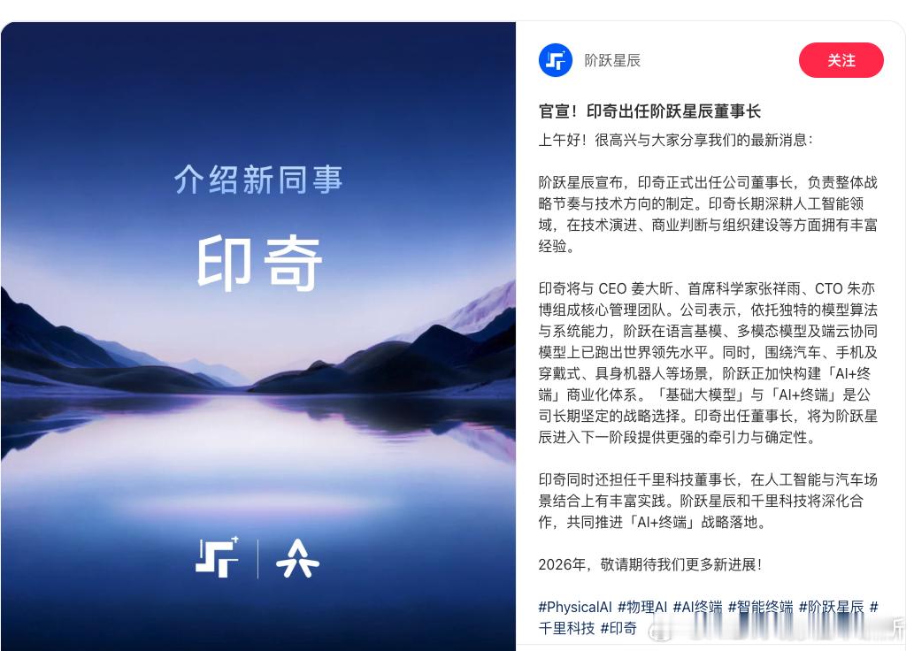 阶跃星辰官宣印奇出任董事长。印奇将与CEO姜大昕、首席科学家张祥雨、CTO朱亦博组成核心团队。「基础大模型」与「AI + 终端」是公司长期坚定的战略选择。印奇还同时担任千里科技董事长。$千里科技 sh601777$阶跃星辰吉利汽车