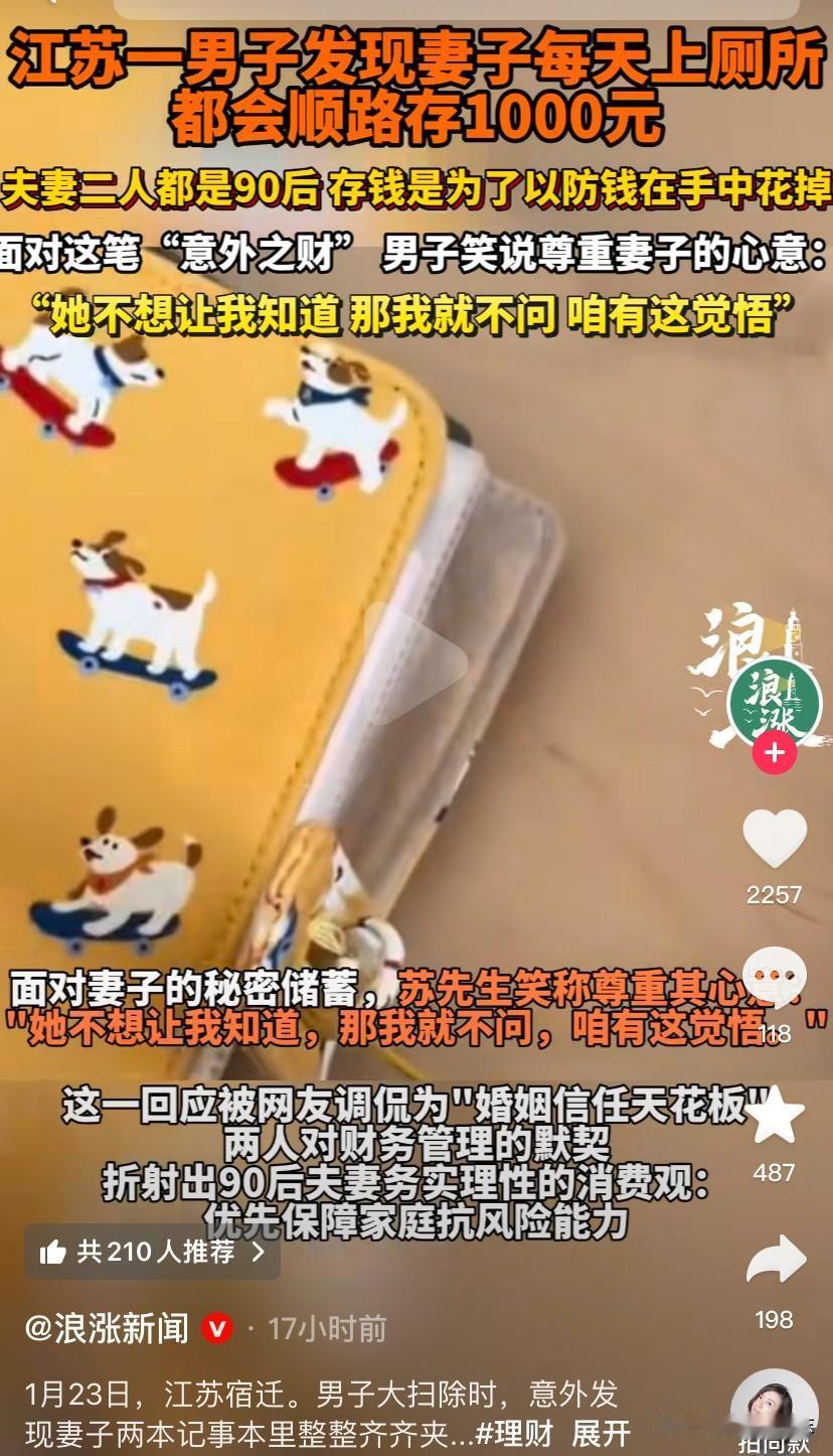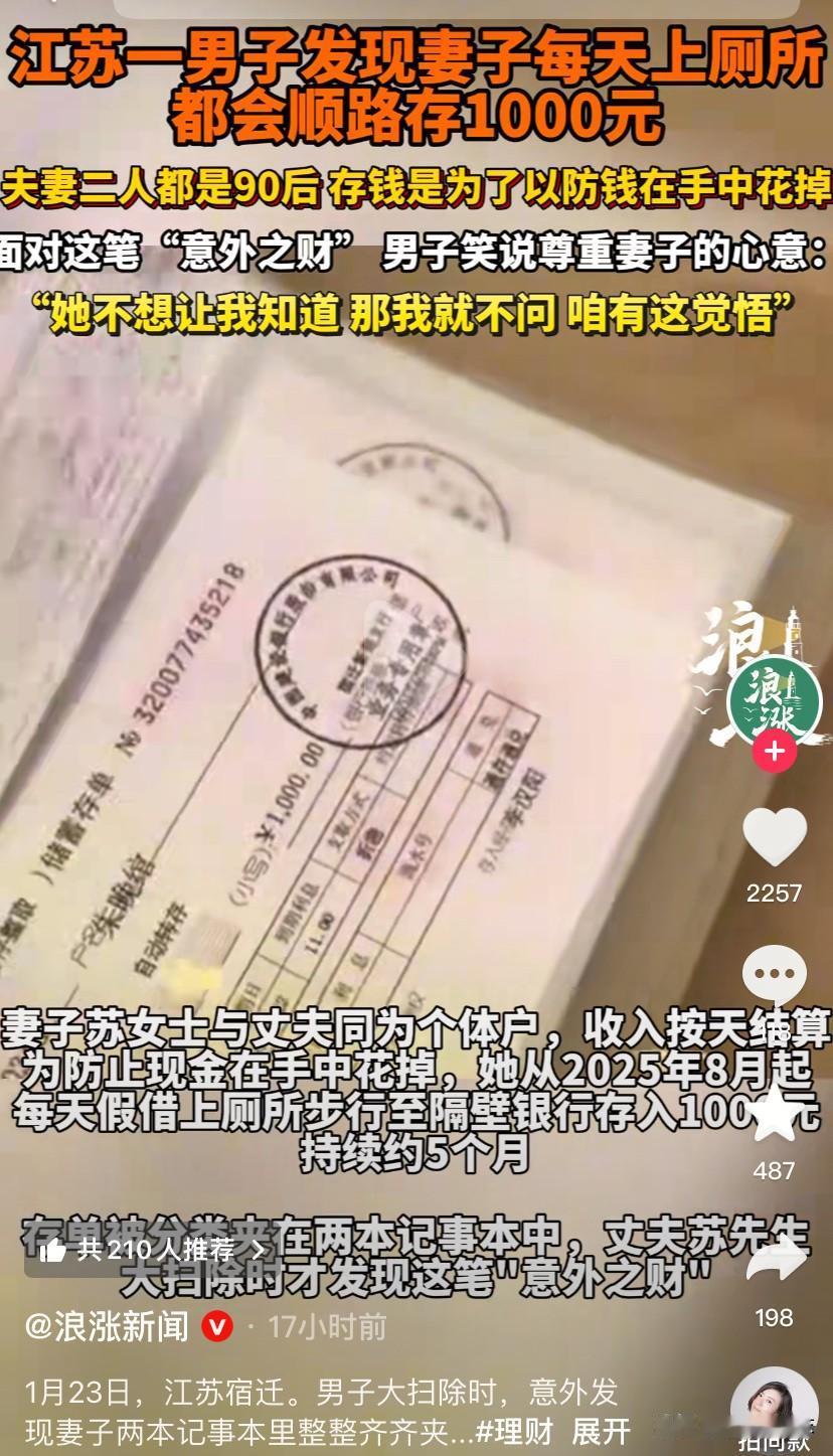 这下好了,不仅江苏人民知道了,全国人都知道了! 1月23日,江苏宿迁,一男子在打扫卫生时,意外发现妻子的两本记事本,男子以为是废弃不用的,就准备当废品卖掉,但当男子打开记事本随意翻了一下后,男子瞬间不淡定了。 只见妻子的两本记事本中整整齐齐的夹着约200张银行存单,每张都是1000元,一共差不多有20万之多。男子起初被吓了一跳,仔细翻看了存单,这些钱从去年8月就开始存了,每天都存1000元,一直存到现在。 原来男子和妻子两个人都是90后个体户,收入都是按天结算,因为生意比较好,所以妻子就想单独存下一笔钱,免得夫妻俩大手大脚把钱都花掉了。于是妻子就在每天去厕所的时候,顺便到隔壁银行去存上1000元钱,这件事妻子也没和丈夫说,说丈夫一直也不知道。 看着妻子存下的这笔“意外之财”,男子是又惊又喜,他也没有当面戳破这件事,男子笑着说尊重老婆的想法:“既然老婆不想让自己知道,那自己就不问,咱有这觉悟。” 男子真是找了个会理财的好老婆,不随便乱花钱不说,还想着从每天的收入中存下一笔钱,坚持了将近200天,真是太厉害了。 网友们纷纷羡慕夫妻俩经营的生意太好了,每天除了正常收入外,还能另外存下1000元钱,那估计每天的纯收入至少要在3000元以上,这样存钱才能不被丈夫发现。 男子也非常不错,能赚钱也很尊重妻子,妻子不想让他知道的事他也不问,只是男子虽然没问妻子,但是却把这件事让全国网友都知道了,连存折上的名字都没有打码,估计只有妻子一个人还蒙在鼓里吧!
