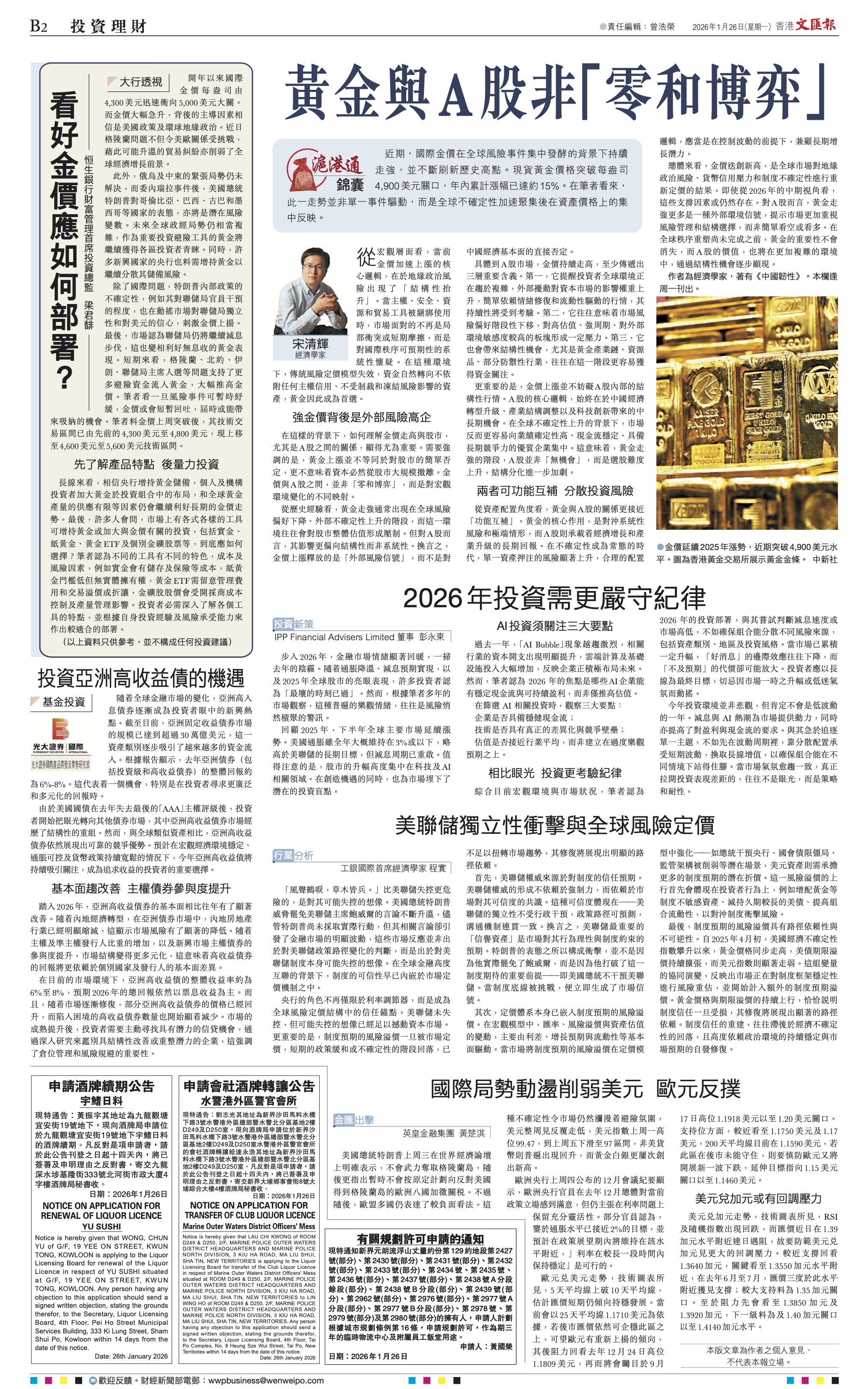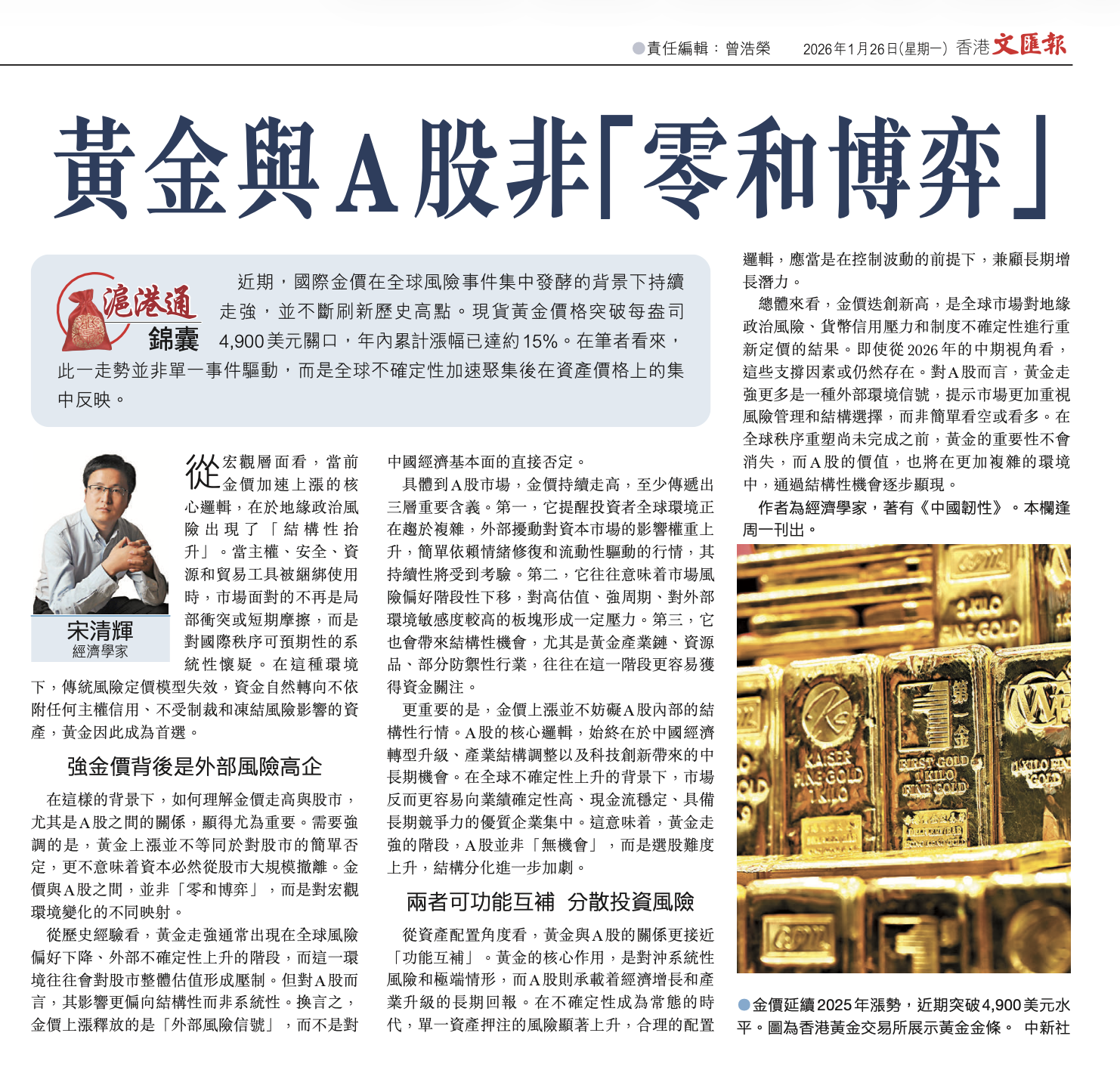 从历史经验看,黄金走强通常出现在全球风险偏好下降、外部不确定性上升的阶段,而这一环境往往会对股市整体估值形成压制。但对A股而而言,其影响更偏向结构性而非系统性。换言之,金价上涨释放的是“外部风险信号”,而不是对中国经济基本面的直接否定。详见《香港文汇报》2026年1月26日B2。#经济学家宋清辉#