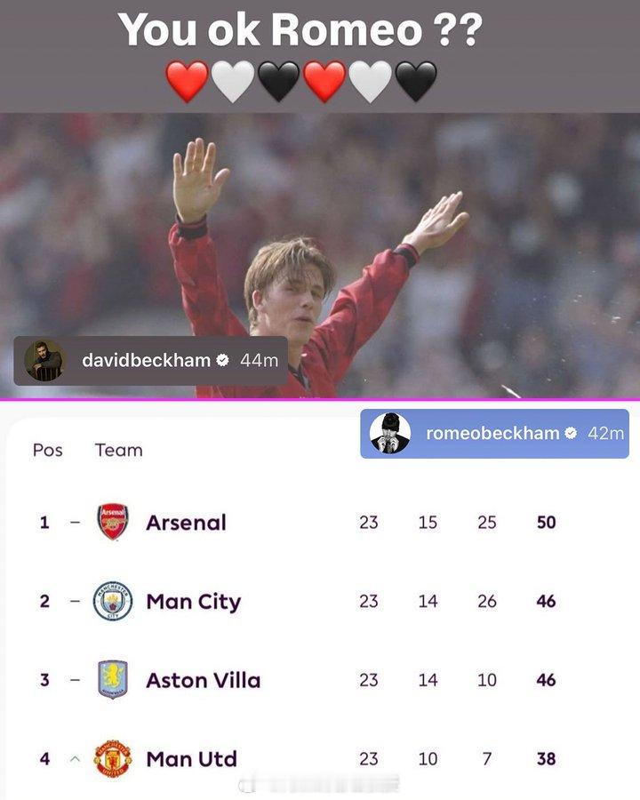阿森纳2比3曼联 曼联战胜阿森纳后,大卫·贝克汉姆在Instagram上发布了一条动态,向他的阿森纳球迷儿子罗密欧喊话。罗密欧回复了一张联赛积分榜的照片,并附上了一条“注意差距”的信息 阿森纳主场赛季首败 阿森纳著名教授