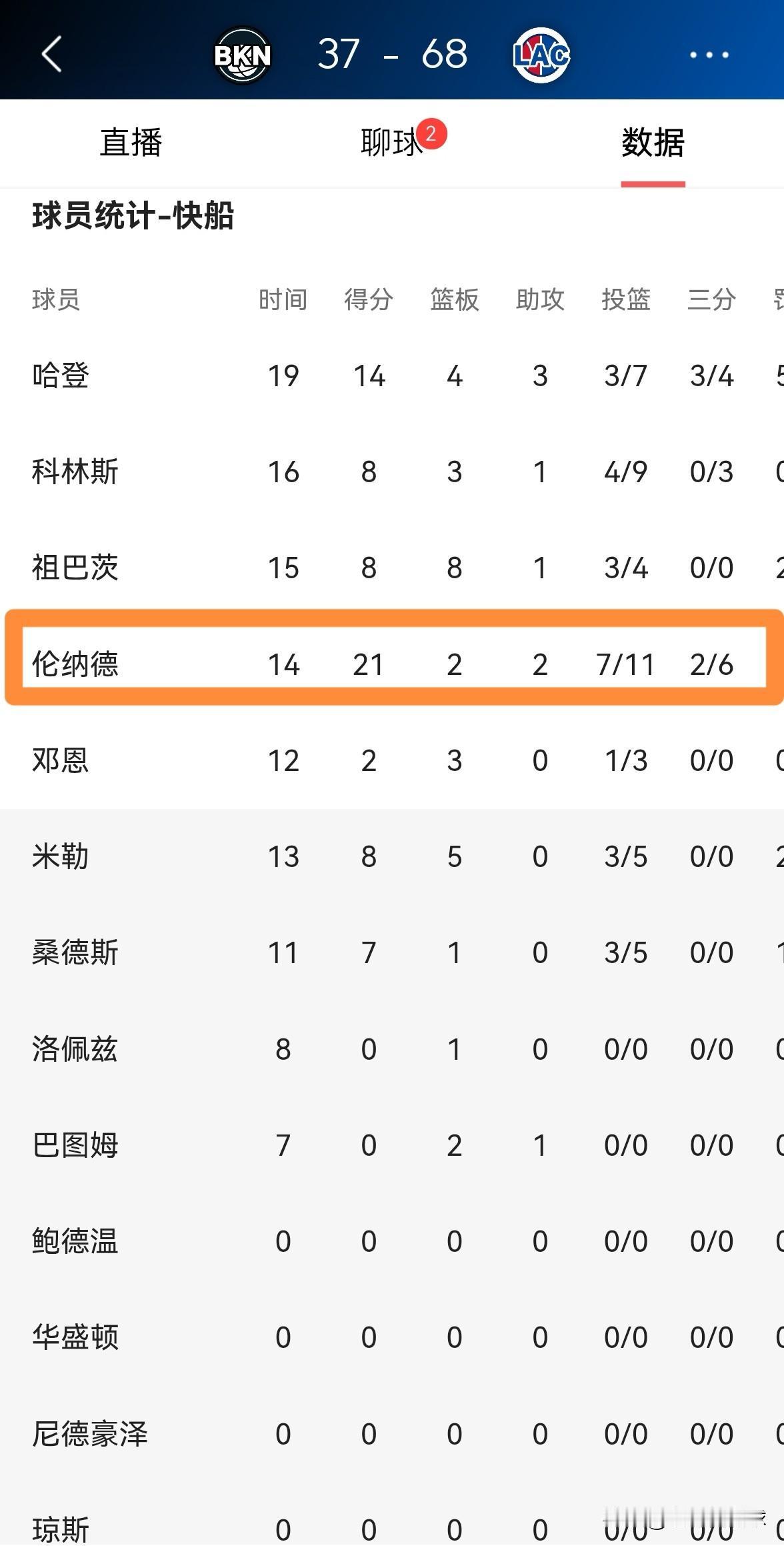 快船当家球星伦纳德真是杀红眼了!在今天快船主场迎战篮网的比赛中,目前双方半场战罢,快船以68:37领先对手。在前两节比赛中,伦纳德在进攻端真是随心所欲、予取予求,他在首发出战的14分钟里,投篮11中7,其中三分球6中2、罚球5中5轻松砍下21分,还有2篮板2助攻,没有出现任何的失误和犯规,他的场上正负值为+16。 以伦纳德在上半场比赛中的出色状态来看,本场比赛伦纳德又要砍下40+了。