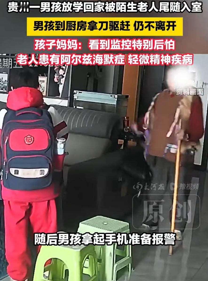 后怕!贵州,一男孩放学回家,谁知就在要关门的时候突然被一只手挡住,一名陌生老人强行拉开门进入男孩家中,男孩哪见过这场面,赶紧到厨房拿起刀,吓唬老人离开,可对方根本不再怕,反倒是把胳膊主动伸过来,事后了解到,老人患有阿尔兹海默症和轻微精神疾病 监控显示,当时男孩独自背着书包回家,虽然路上发现有老人跟着自己,但他起初并没有在意,只是以为顺路而已,可自己回到家打开房门准备关的时候,对方却伸手拦住 男孩下意识想顶住门,可力气终究比不过对方,门还是被推开了。一位穿着红马甲、拄着拐杖、手里提着黑包的老人,径直走了进来 眼看老人一步步靠近,男孩只能往后退,一直退到了厨房。而老人并没有停下,也跟着挪进了厨房区域。情急之下,男孩踮起脚,从台面上摸到了一把菜刀。他握紧刀柄,朝着老人的方向举了举,本意只是想吓退对方 可老人的反应完全出乎意料。他没有躲,反而慢慢伸出自己的左胳膊,用一种近乎平淡的语气说:你不要砍我……你砍吧,手伸这里 男孩彻底慌了。他握着刀,进退两难,只能赶紧掏出手机打电话给家人,母亲回家后报了警,得知老人有些特殊情况,但回看监控后,还是觉得害怕,并把这个事发到了网上 有网友说:大家都理解一下不是生病谁也不愿意这样做啊,在说人家又没有做出什么威胁的动作和语言,如果是坏人在要报警时肯定早就溜之大吉了 我倒是觉得,虽说理解是必要的,毕竟老人没有恶意,可问题的本质在于,孩子在面对突发情况时,感受到的威胁和不安是真实存在的 很多人评论说“如果是坏人,早就跑了”,但对孩子来说,眼前的这个老人可能是他唯一的“敌人”,即便他知道老人并没有恶意,依然会被那股危险的气氛吓到。不能因为老人没有做出威胁动作就全盘无视孩子的感受 从结果看算是虚惊一场。但那种后怕的情绪,却真实地留了下来,所以更应该理解一下这个孩子,同样的场景,就算换做大人可能都会被吓坏的 陌生老人尾随进家 男孩拿菜刀驱赶