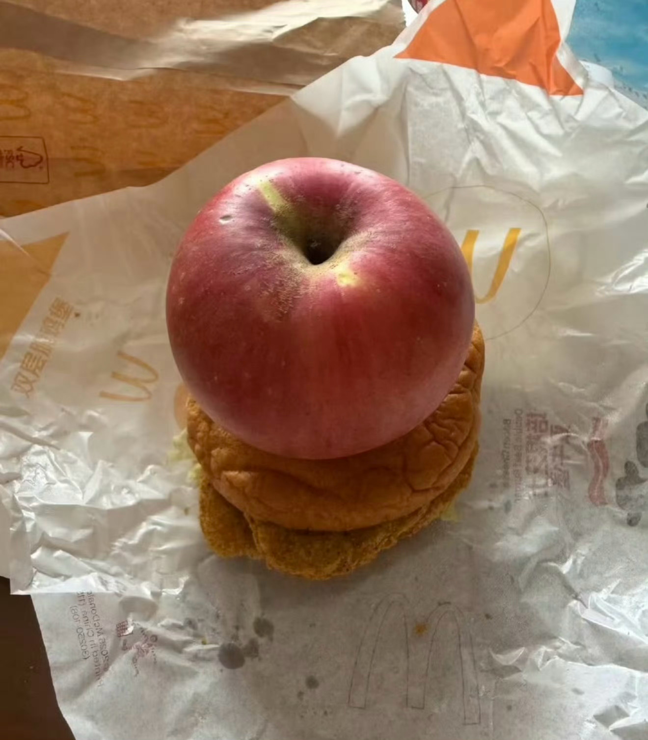 刷到吐槽,麦当劳汉堡就鸡蛋大小,不如叫马卡龙,塞牙缝都不够。麦当劳回应汉堡变小了