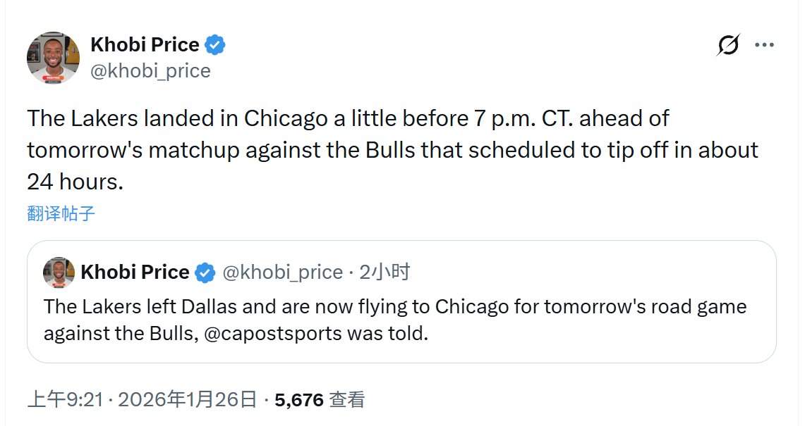 跟队记者:湖人已经在美国中部时间7点之前抵达芝加哥,准备明天的比赛。