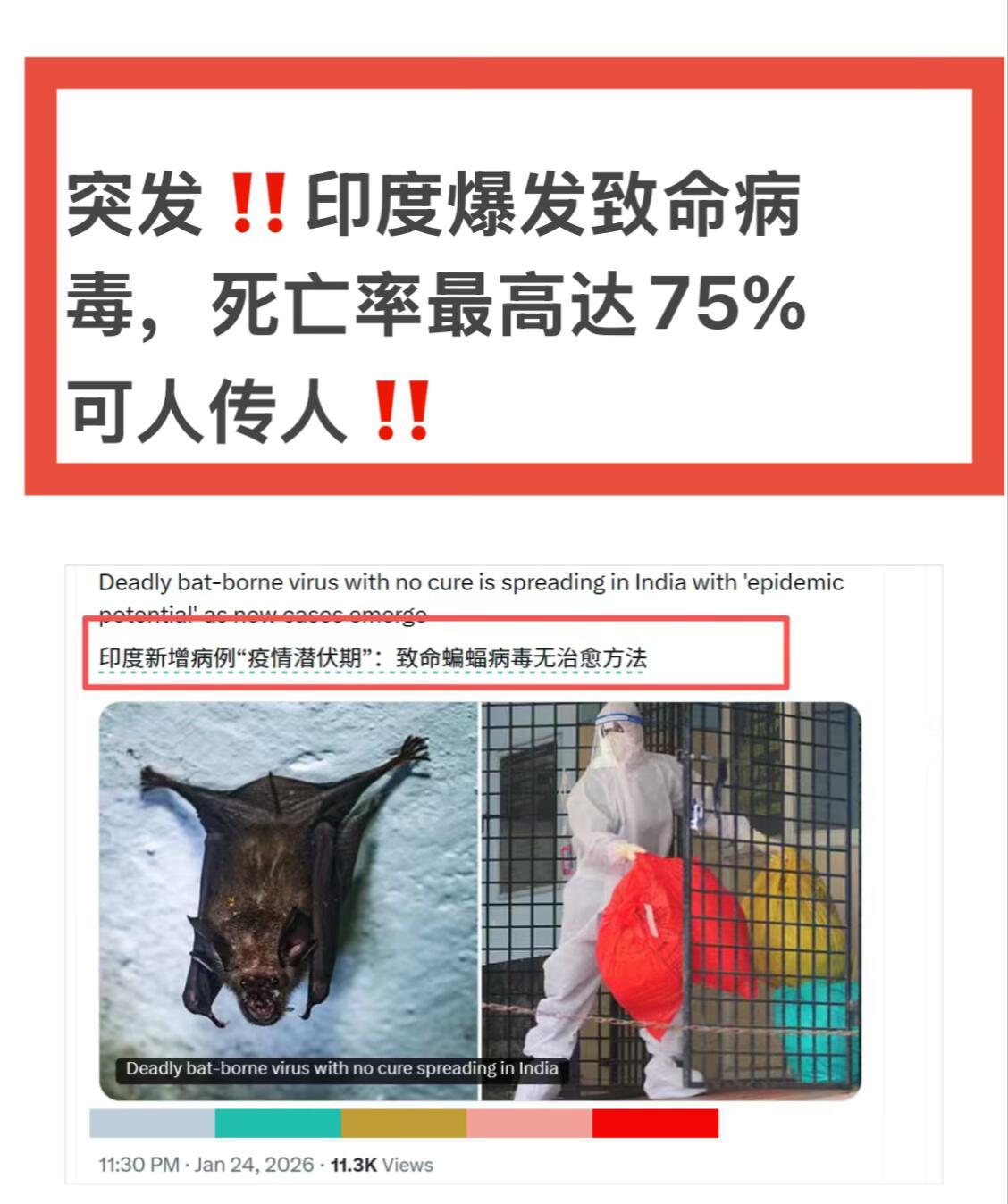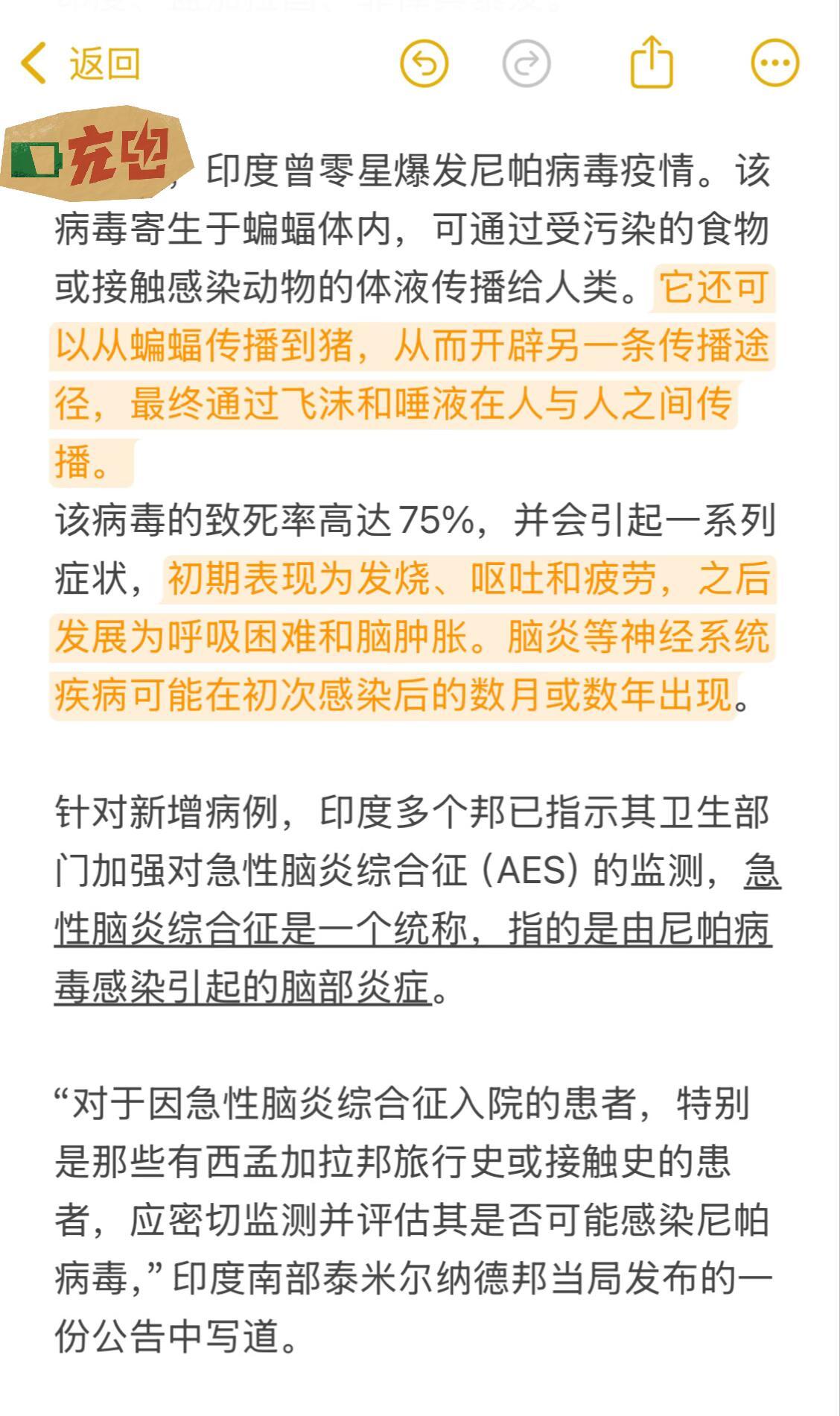 印度疫情印度爆发高致命性病毒,死亡率高达75%‼️症状:初期症状类似流感(发热、头痛、咳嗽),重症可引发急性脑炎、呼吸衰竭,24–48小时内进展至昏迷甚至死亡。具代表性的并发症是脑炎。目前尚无专门针对尼帕病毒的疫苗和有效疗法。