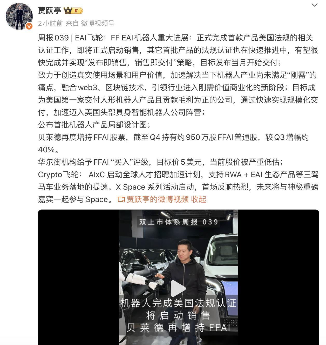 贾跃亭今天发了微博预告自家的机器人 FF EAI 在 2 月 4 日有个发布会。机器人 FF EAI 在这视频里还露了一只手给贾总递了瓶水。42mark新能源汽车