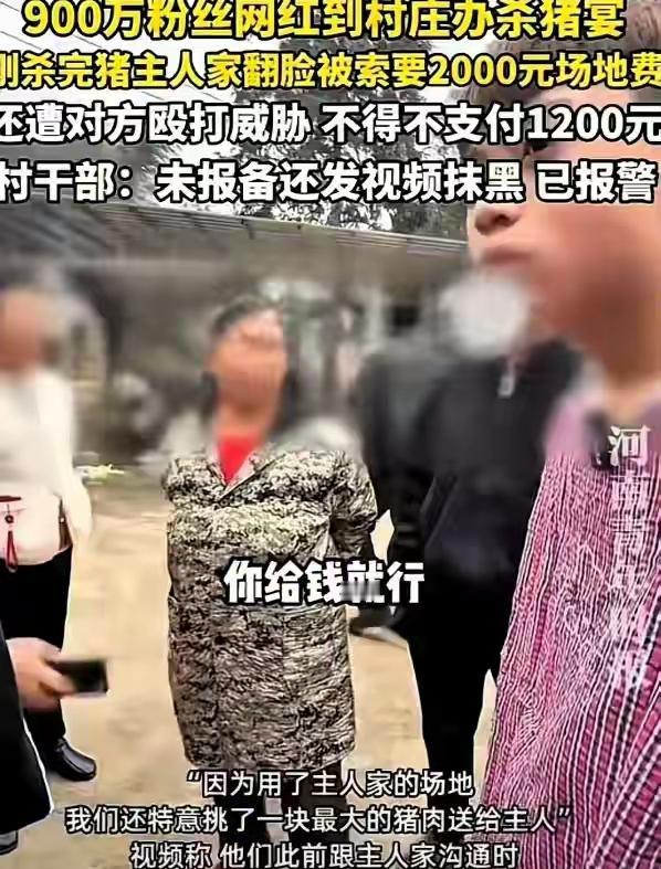 “人心真恶!”湖南株洲,一男子是900万粉丝博主,在村里花3200买了头400斤的大肥猪,准备办杀猪宴,请村里老人免费吃,刚宰完猪,村民突然翻脸,索要2000场地费,双方吵了起来,最终,男子付了1200场地费离开,杀猪宴没办成,猪肉又被村民拿走了。村子却回应说:没报备还抹黑,报警了! 一月的株洲乡村,寒意裹着湿冷的风掠过田埂,新市村吴姓人家的院子里却透着几分热闹,烟火气顺着院墙飘向村口。   九百多万粉丝的博主尹鸣,正带着团队在院子里忙活,地上的铁锅冒着热气,旁边刚杀好的肥猪被摆放在竹架上,这是他花三千二百多块从村里买的,四百多斤重,足够请村里独居老人吃顿饱饭。   在尹鸣团队的视频中,为了这场公益杀猪宴,尹鸣团队驱车一千多公里赶来,不仅租了桌椅、备齐了食材,还特意找了厨师掌勺,就连柴火都是队员们分头在村边捡的干树枝。   借院子时,他和屋主谈得很投机,屋主笑着摆手说免费用,尹鸣特意挑了块最厚实的五花肉,用干净的油纸包好递过去,屋主爽快地接了,眉眼间满是客气。   猪杀完收拾妥当,尹鸣让队员留下照看,自己带着两人去村里通知独居老人。   可等他折返回来,院子里的气氛早已变了味。   竹架上的猪肉少了大半,散落的油纸被风吹得贴在墙角,几个村民正低着头往怀里塞猪肉,神色慌张又急切。   没等尹鸣开口追问,一个穿着深色外套、满脸横肉的男人就挡在了他面前,是屋主的侄子吴应明。   吴应明双手抱胸,脸色阴沉得吓人,开口就狮子大开口,要两千块场地费,语气强硬得没有丝毫商量的余地,说水电、柴火还有耽误的工时,都得折算成钱。   尹鸣脸上的笑意瞬间僵住,眉头紧紧拧起,反复解释之前已经说好免费,还特意送了五花肉当谢礼,可吴应明根本不听,嗓门越提越高,引得周围干活的村民纷纷围了过来。   围观的人越来越多,院子里挤得水泄不通,有人跟着附和吴应明的话,有人趁机伸手去扯剩下的猪肉,场面渐渐失控。   尹鸣的队员想上前阻拦,却被几个村民死死拦住去路,现场还有人拿刀威慑,显然是不想让他们轻易离开。   寒风卷着争吵声、哄闹声在院子里回荡,尹鸣看着散落一地的食材和被哄抢的猪肉,又看看围上来的村民,知道僵持下去只会更糟,只能压下心头的火气和吴应明协商。   一番拉扯后,尹鸣最终妥协,掏出一千二百块递给吴应明,看着对方揣钱时毫不掩饰的得意神情,他心里又气又无奈。   原本准备给老人的猪肉被抢得所剩无几,铁锅凉了,食材散了,这场满怀期待的公益杀猪宴,终究是成了一场笑话。   带着满心失落离开村子后,尹鸣把现场混乱的片段整理成视频发在了网上,想说说自己的遭遇。   视频很快在网上传开,网友们起初一边倒指责村民贪心,还给新市村贴上了“抢猪村”的标签,村里一家无辜超市甚至被人在地图上恶意改名。   可没等舆论平息,新市村村委会和村民就站出来反驳。   村委会工作人员称,尹鸣团队事前没报备,属于私自行动,视频里的老人也不是独居老人,村民分肉是尹鸣自己提议的,拿刀的人是杀猪的屠夫。   吴家人也跟着发声,说事前约定好以猪头、内脏当报酬,是尹鸣事后反悔,一千二百块只是补的水电柴火钱,试图扭转舆论。   就在双方各执一词、争论不休的时候,尹鸣突然悄悄删除了原视频,这一举动让质疑声扑面而来,不少人开始怀疑视频有恶意剪辑的成分。   目前警方已经介入调查,但还没查清全部真相,只初步表示视频内容与事实存在出入,不排除恶意剪辑的可能。   尹鸣则表示,自己从未同意过分肉,事发后也没有任何部门找他核实情况,对村方的说法并不认可。   吴应明早已把社交账号设为私密,躲起来不再露面,只留下一场说不清道不明的闹剧。   如今再提起这事,只剩满地狼藉的回忆,尹鸣花了五千多块买猪、备食材,付了一千二百块费用,最后连给老人的猪肉都没保住,终究是竹篮打水一场空。