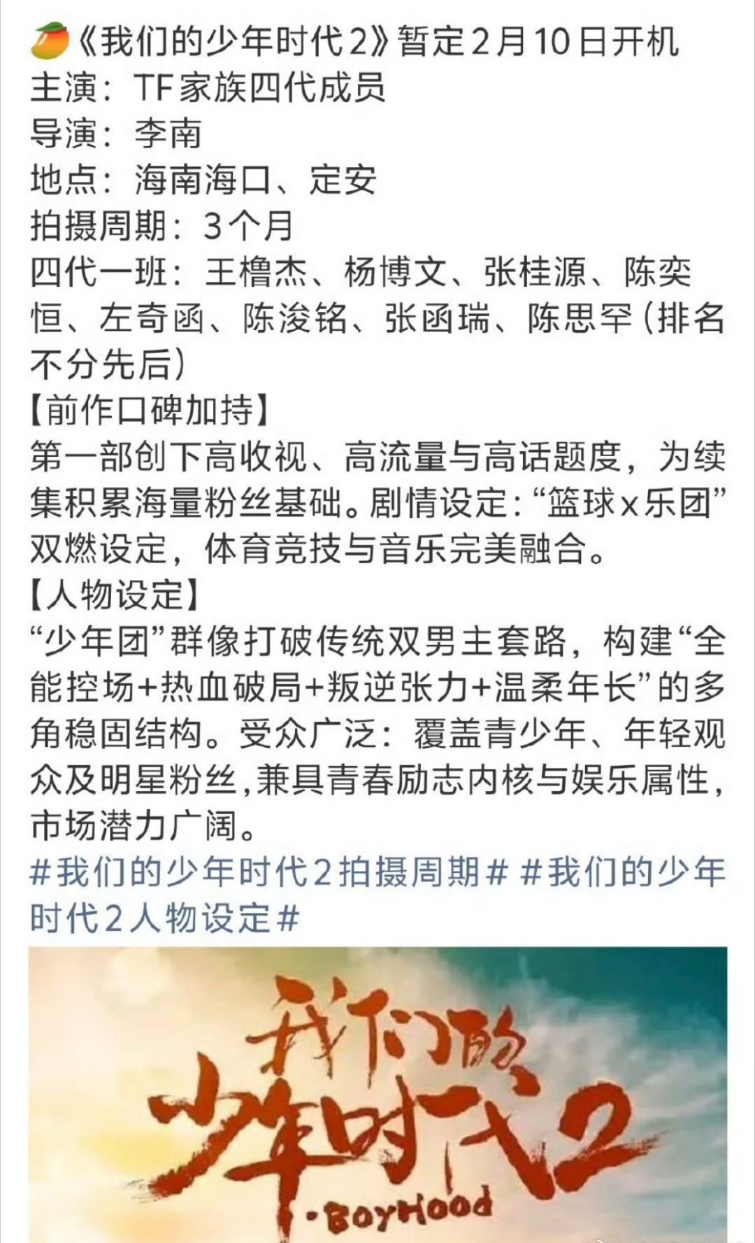 🍉🍉《我们的少年时代2》2月10日海口开机,四代也要开始闯影视圈了!参演阵容:王橹杰 张桂源 杨博文 陈奕恒 左奇函 陈浚铭 张函瑞 张奕然 陈思罕 李煜东 魏子宸 杨涵博 聂玮辰 官俊臣