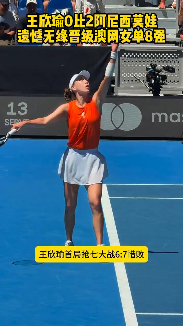 王欣瑜0比2阿尼西莫娃,遗憾无缘晋级澳网女单8强。 太遗憾,澳网女单16强,王欣瑜首局抢七大战6:7惜败,次局4:6,最终0:2不敌4号种子阿尼西莫娃,无缘澳网女单八强,不过也创下个人澳网单打最好成绩。希望王欣瑜越挫越勇,未来可期,加油。