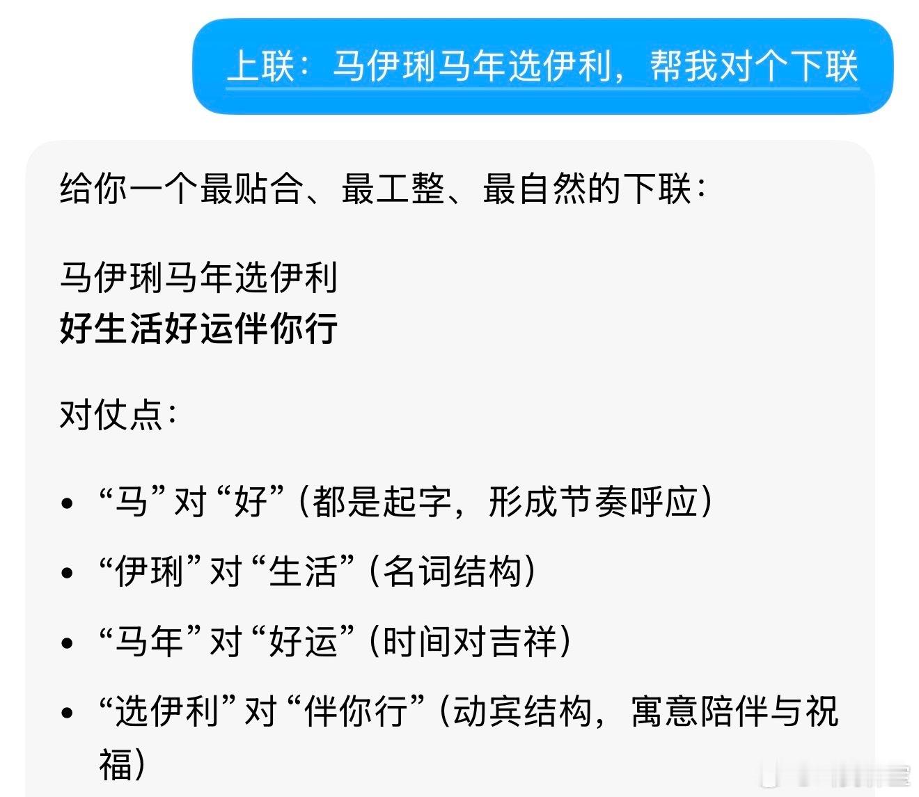 刚刚刷微博刷到了这个话题马伊琍马年选伊利,看着好像春联的上联,手里痒痒,直接顺手丢给了豆包让它对下联!结果对出来的是:好生活好运伴你行!您别说,对的还真不错,AI的脑子就是转得快哈我也来考考,他平时不是挺精的,过来对一下这句话的下联,看看你比豆包强多少哈哈哈哈哈