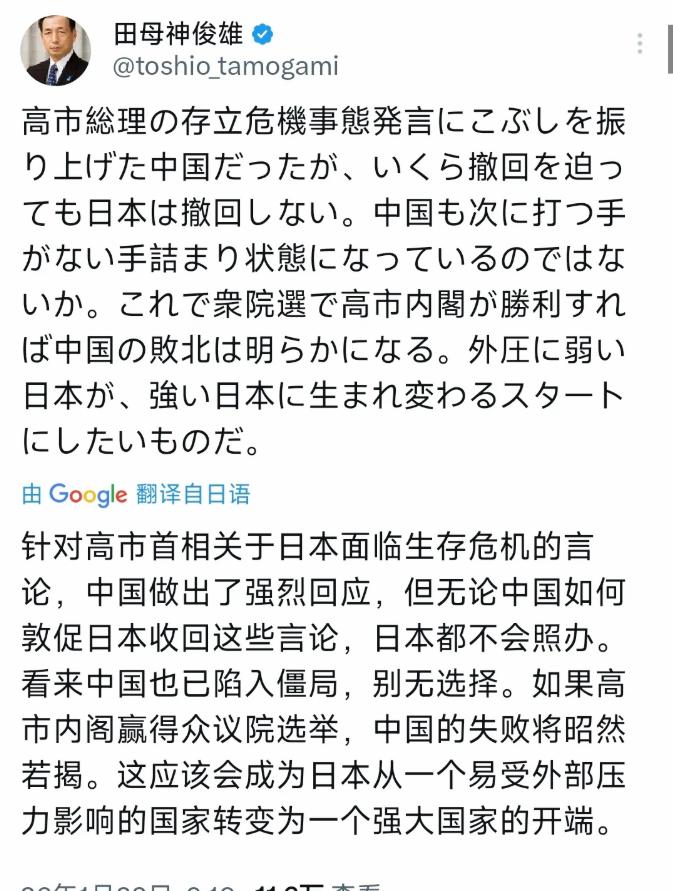 日本高官表示,日本已然让中国陷入了僵局。1月22日,日本极右翼政客、前日本航空自卫队一把手田母神俊雄,发文叫嚣称,无论中方如何抗议,日本都不会收回高市早苗的涉台错误言论,这让中国“陷入了僵局”。他还声称,如果高市带领自民党赢下众议院选举,那中国就必将失败,而这将是日本成为“强大国家”开端。 1月22日,田母神俊雄在社交媒体的一番“豪言壮语”把中日关系又推上了风口浪尖。 他坚持高市早苗的涉台言论无须收回,并断言这让中国“陷入僵局”。 可这场口水仗背后,真的是谁困住了谁? 回看田母神的言论,不难发现他玩的其实是“精神胜利法”。 他把中国的抗议和反制说成是被动,却闭口不提日本因为拒不让步已经遭了多大罪。 中国早在2025年对日采取反制,暂停水产品进口、发出旅行警告。 结果日本旅游业一夜损失了2.2万亿日元,相关股票也集体跳水。 这种“胜利”,倒像是饿着肚子的邻居还炫耀自己抗饿有天赋,听起来热闹,实则尴尬。 田母神把高市不道歉当成日本的胜利,却忘了中国才是日本最大贸易伙伴,2024年两国贸易额高达3083亿美元。 中国的反制让日本GDP直接缩水0.36%,这账怎么算都是自家吃亏。 硬撑着不低头,结果是经济和民生先遭殃。 日本右翼却还在台上喊“赢了”,像极了只顾面子的赌徒。 更有意思的是,这种“胜负观”背后藏着一颗危险的心。 田母神长期否认南京大屠杀,美化侵略历史。 这种调子和高市早苗参拜靖国神社、推动修宪一脉相承,极右翼想把历史重新包装一遍。 国际上早有警惕,俄罗斯、德国都批评日本右翼是在挑战战后秩序。 这套故事讲下去,地区局势只会更紧张。 说到底,田母神和高市的“硬气”最后是谁买单? 中国反制切中要害,旅游业首当其冲。 中国游客以前占日本外国游客近三成,如今北海道的民宿订单直接腰斩,百货公司股价齐刷刷往下掉。 水产品出口干脆归零,渔民叫苦连天,农林水产板块也跟着遭殃。 民众开始上街举牌子,反对高市的政策,甚至有在野党公开批评她“漠视民生”。 经济学家算了笔账:如果对华关系继续这么僵,2026年日本要多亏1.2万亿日元。 可右翼政客却还在追逐“强大国家”的梦。 高市大刀阔斧要把防卫预算拉到9万亿日元,还打算买战斧导弹,这些动作跟二战前的扩军简直如出一辙。 日本历史学者纐纈厚都直言,日本正一步步放弃和平宪法,朝着“战争国家”滑去。 其实1930年代日本也是打着“大国化”的旗号走极端,最后只落得战败投降。 历史的教训还没吃够,今天又想重来一遍,结局很难有新花样。 更不用说,周边国家早就提高警惕。 韩国、东南亚国家都对日本的军事化表示担忧。 如果高市真赢下选举,日本很可能会被孤立在东亚,合作空间大大缩水。 自我封闭最终只会让经济和安全两头受限。 田母神口中的“中国陷入僵局”,实际是日本自己陷进了困境。 中国通过有力反制守住了核心利益,日本经济民生却受了实打实的损失。 想要走出困境,日本不是没有选择,比如借APEC峰会缓和关系。 但要是继续向右拧,迟早会重蹈二战覆辙。 历史已经摆在眼前,大国崛起靠的是合作而非对抗,“精神胜利法”终究会被现实打碎。