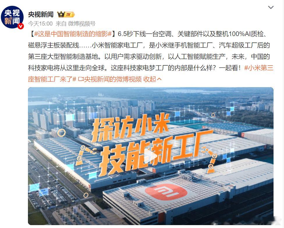 央视新闻探访了小米第三座智能工厂,排面拉满了属于是这座智能工厂坐落于武汉,主要生产大型家电产品,目前每6.5秒就可以下线一台空调,这效率放在全世界都算得上遥遥领先了吧小米第三座智能工厂来了