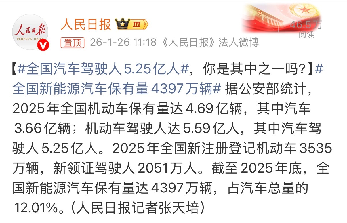 全国汽车驾驶人5.25亿人重点:新能源汽车保有量4397万台,占比12%未来增量还很大吧~