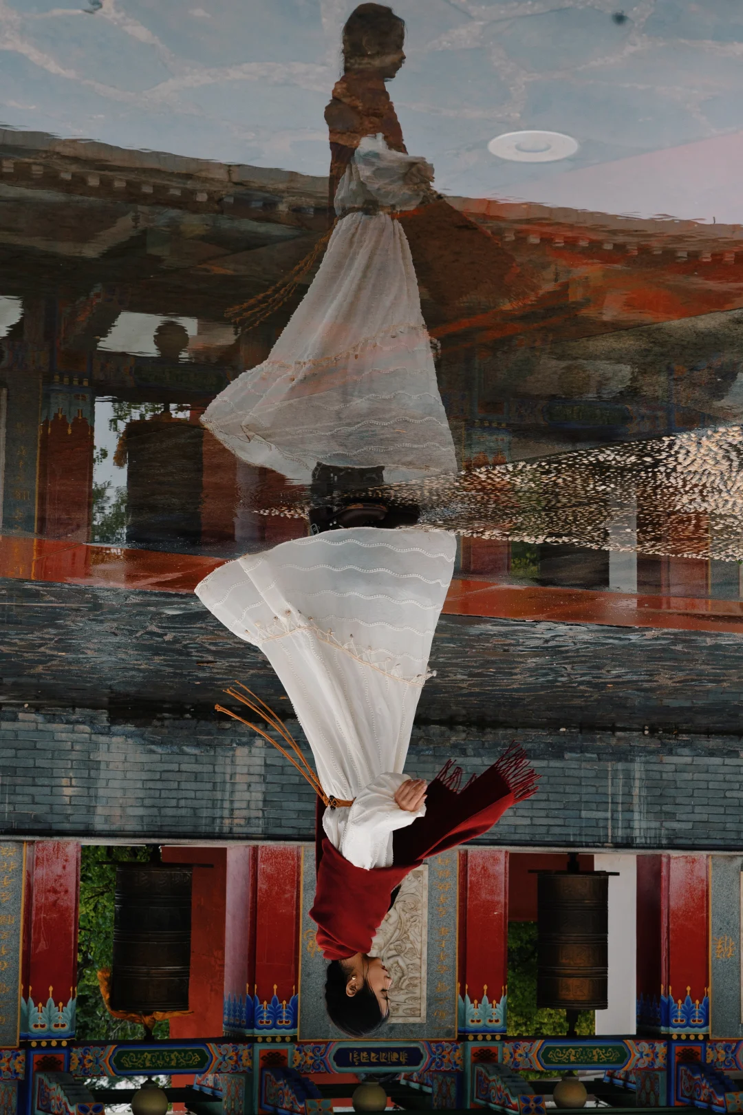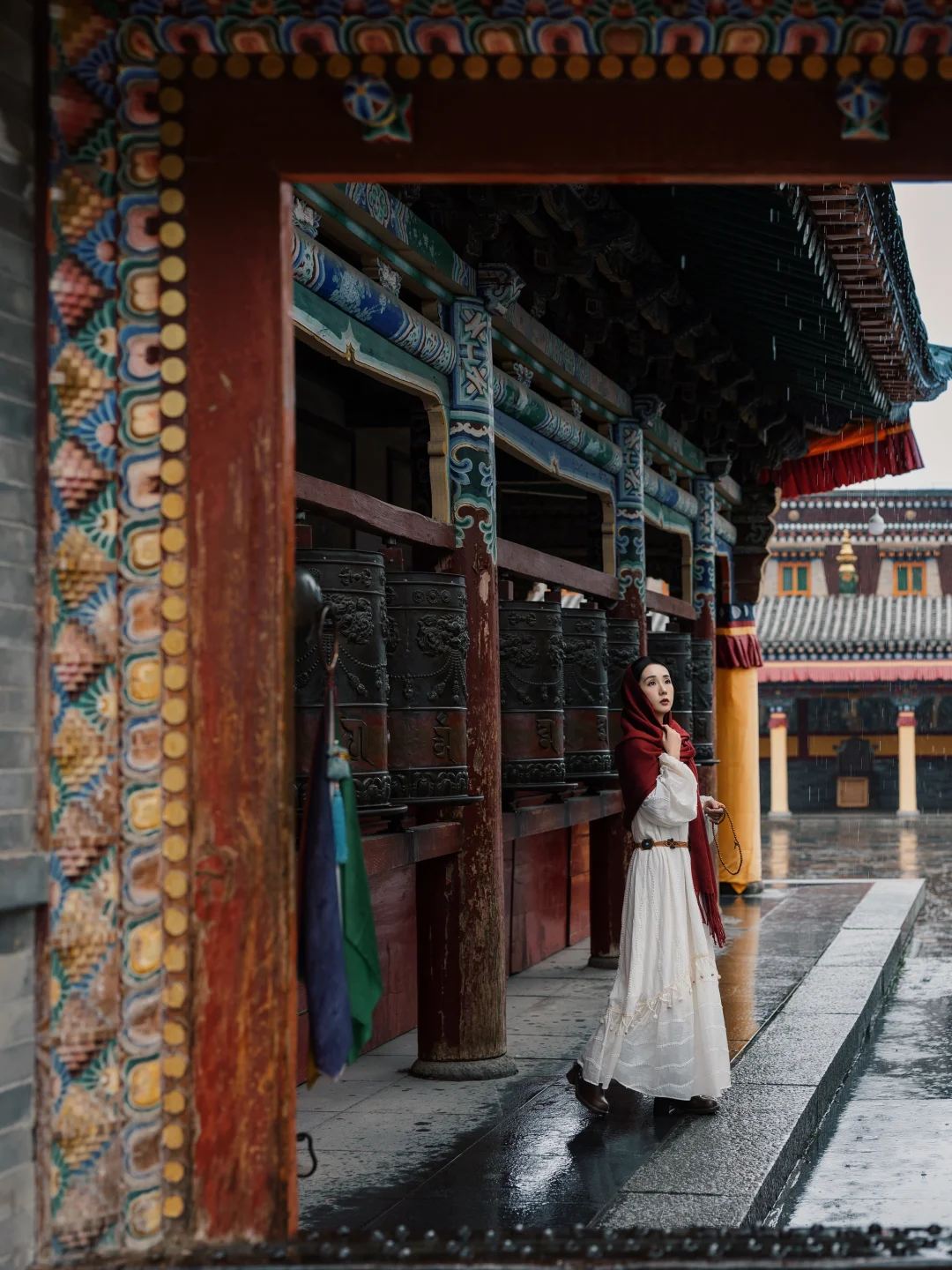 赶上降温,一夜一日的雨,空气里是散不去的寒气。雨从屋檐滚落连成雨帘,帘后,虔诚的信徒依旧在磕长头。
