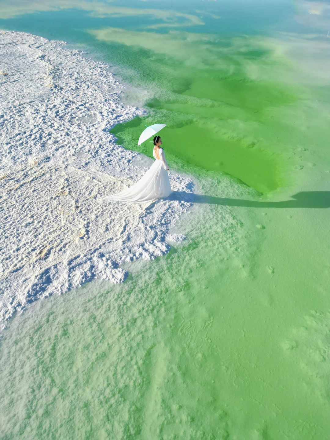 ❶很大片的湖水,有蓝色和苹果绿2种,蓝色像天空之镜,平替茶卡盐湖