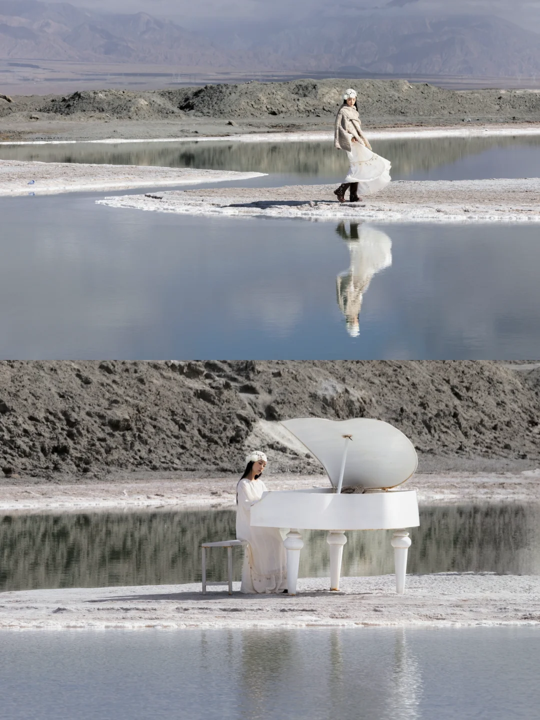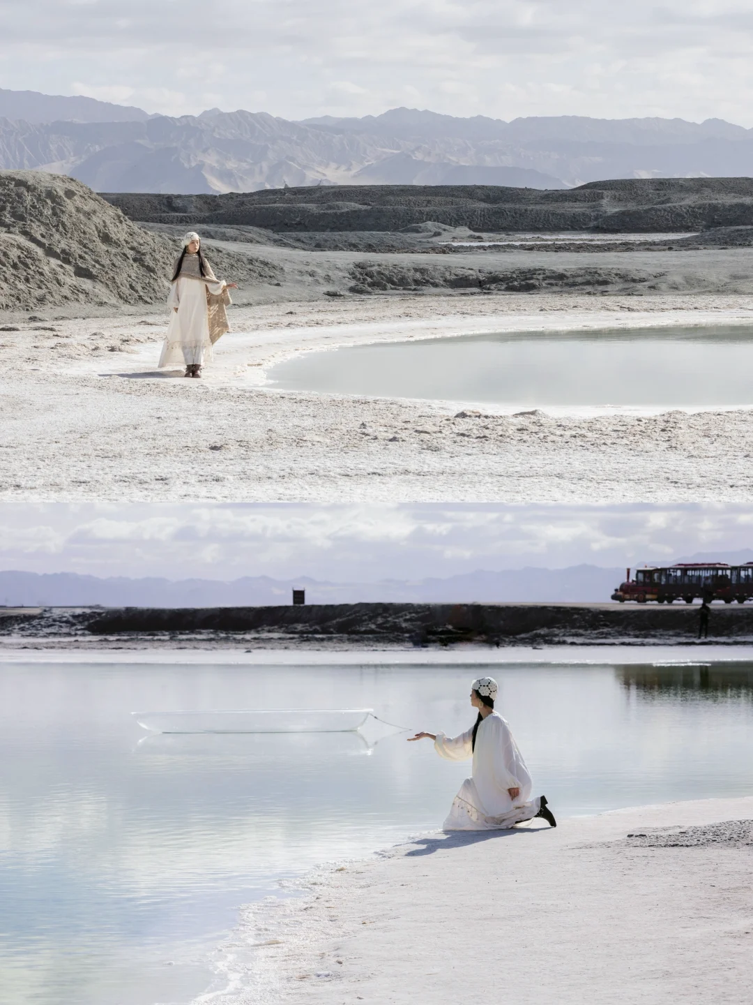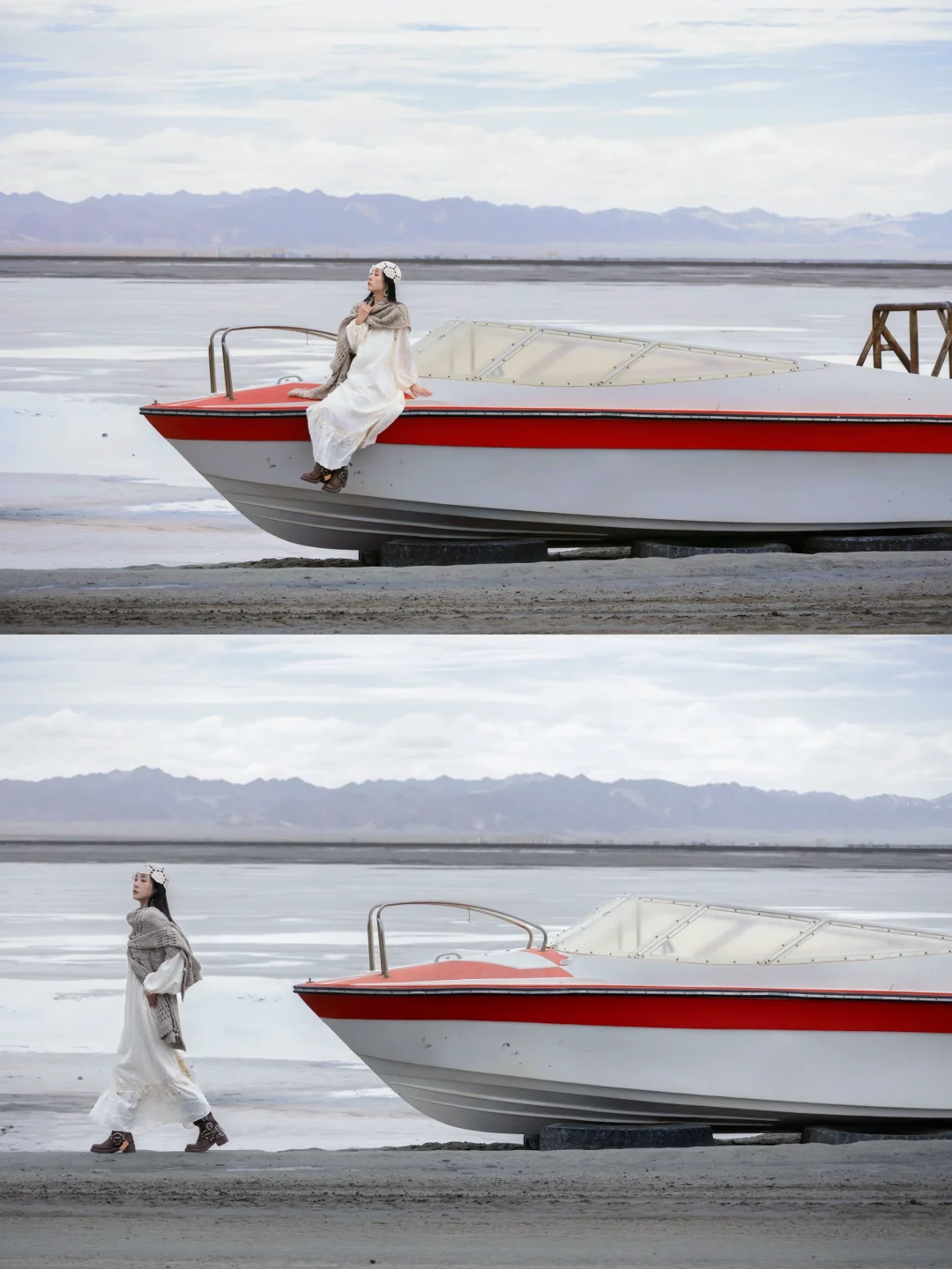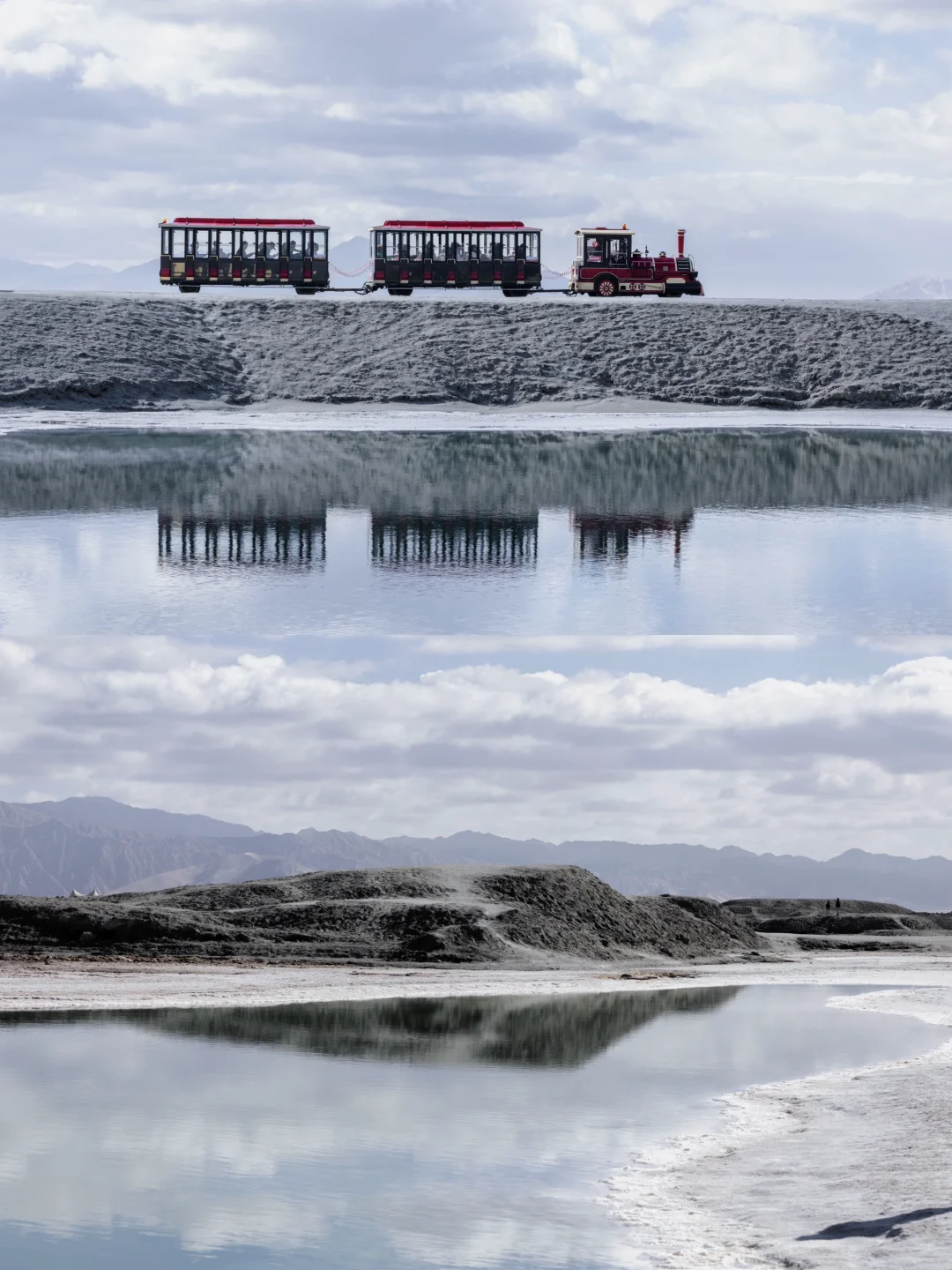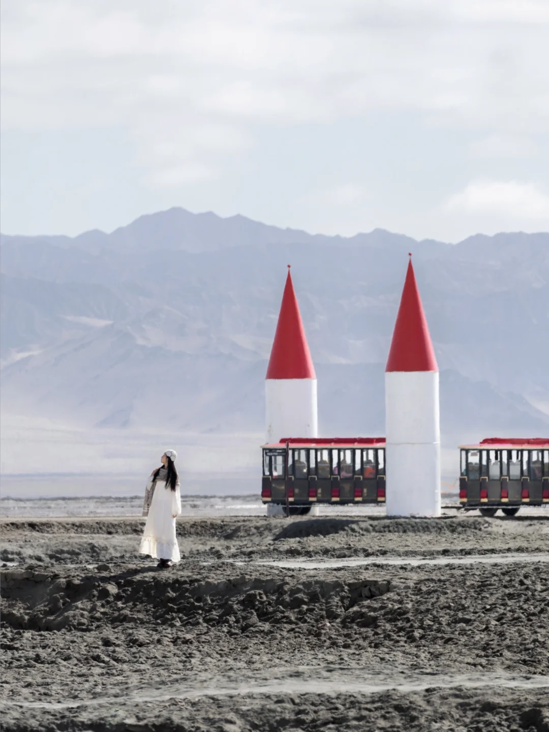 ❷红色尖顶的柱子、船舶、小火车都是北欧风格,一望无际的灰白色干涸盐湖仿佛雪境