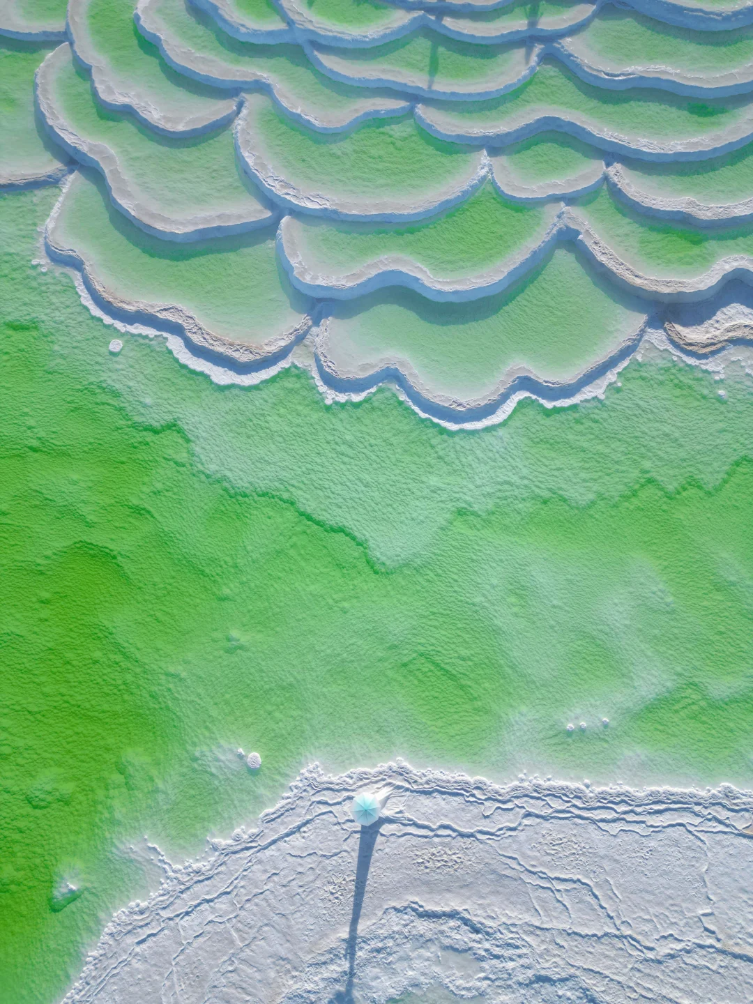 ❶是一个个不同色彩的小型盐湖,青苹果绿、黄绿、深浅不一的蓝