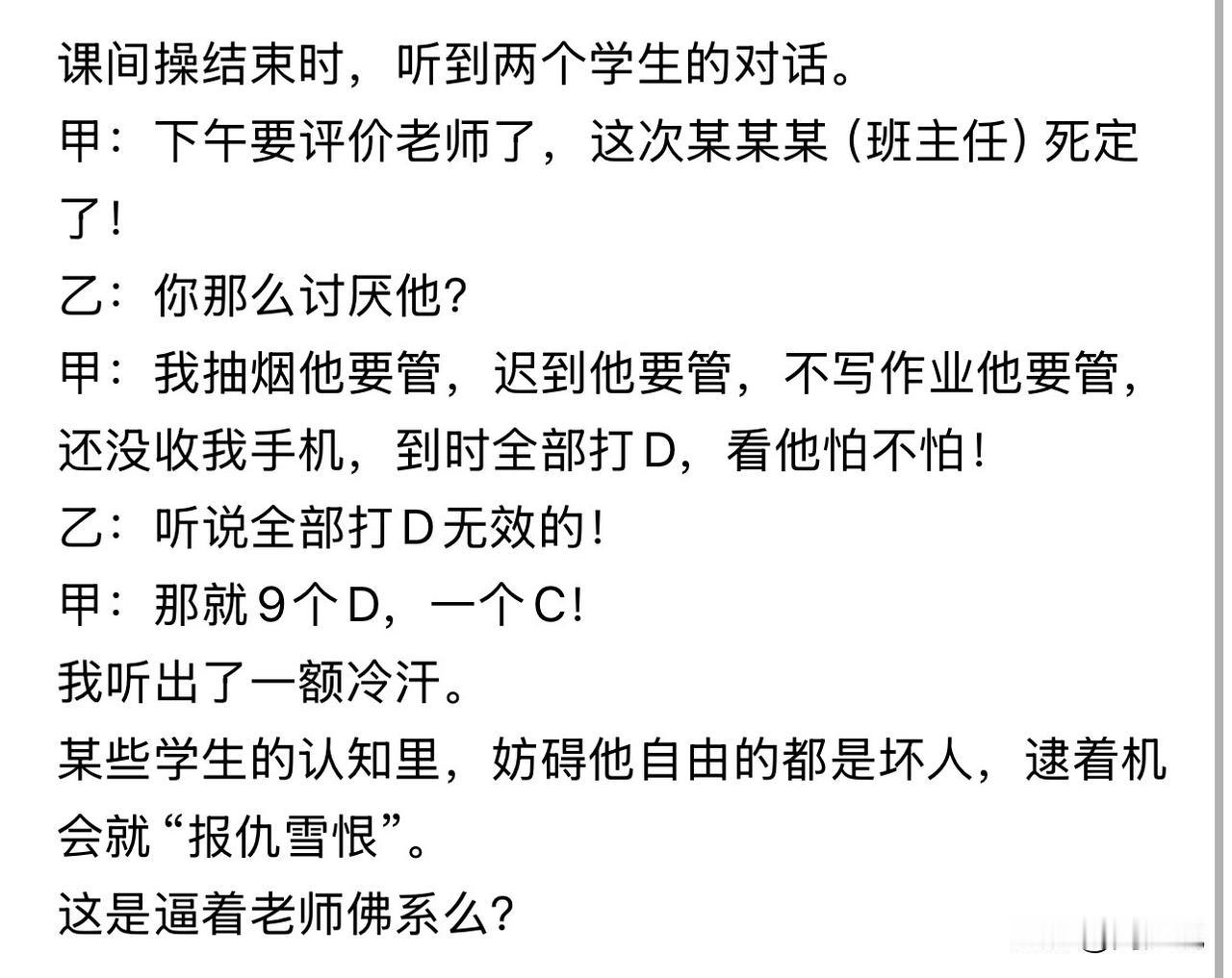 一位老师课间操结束听到俩学生的对话,看完之后,不得不说真是让人后背发凉。班主任只是管了他们抽烟、迟到、不写作业,而他们就要报复老师,评价直接给予“D”,恶心班主任。 这番对话,让不少网友直呼揪心。有人说:“现在的孩子咋这么叛逆?老师管是负责任,咋就成仇人了?” 也有人感慨:“当老师太难了,管严了遭报复,管松了又失职。” 在周少看来,这俩学生把对老师的评价当成报复手段,暴露的是部分学生扭曲的价值观,在他们眼里,约束自己的都是“敌人”。 老师的管教,本是为了帮孩子走正路,却反倒成了“结仇”的导火索。如此来看,这不仅是师生关系的小裂痕,更是家庭教育和学校教育的大课题。 从另一个角度来说,这种学生评价不能直接作为班主任的评比,里面太多复杂的因素了..#寻美三湘# #长沙新朋友#