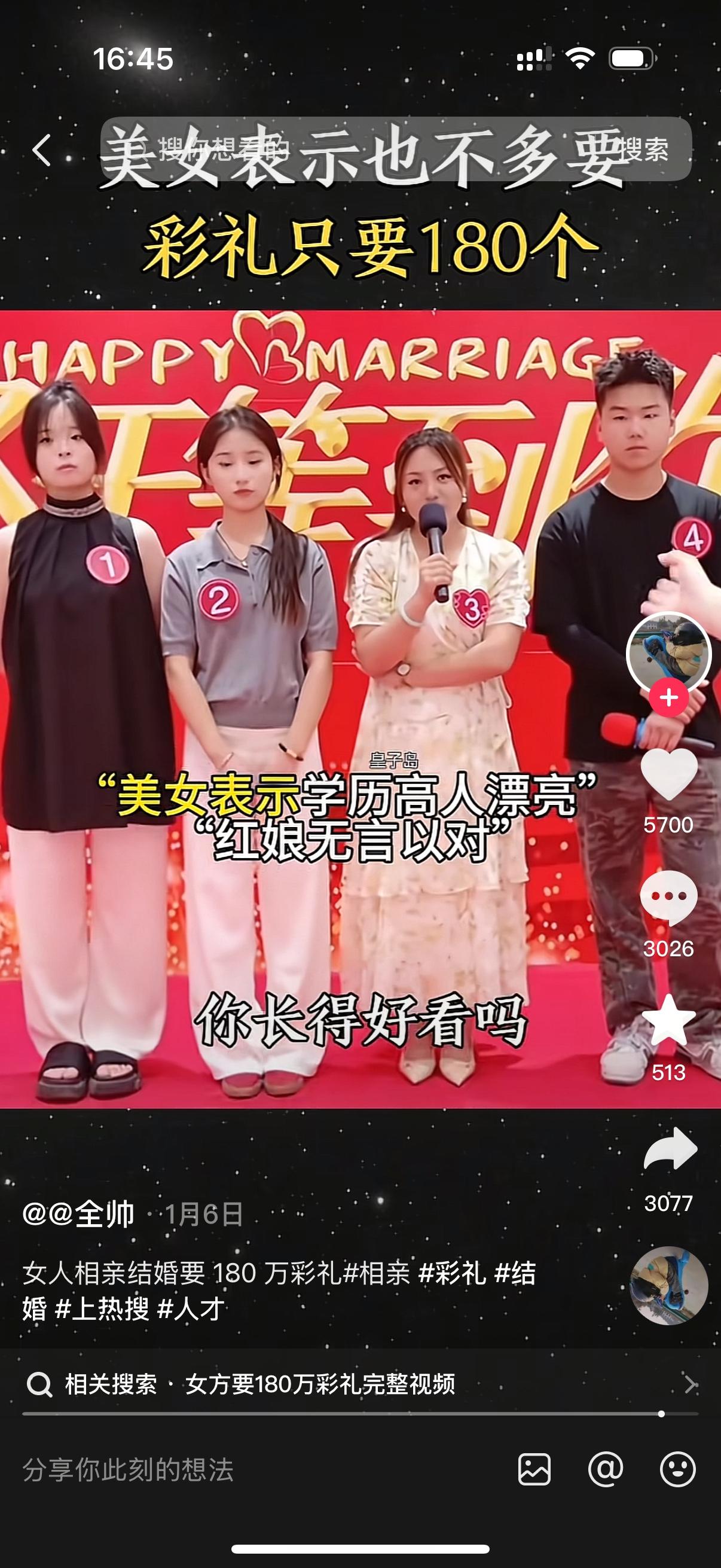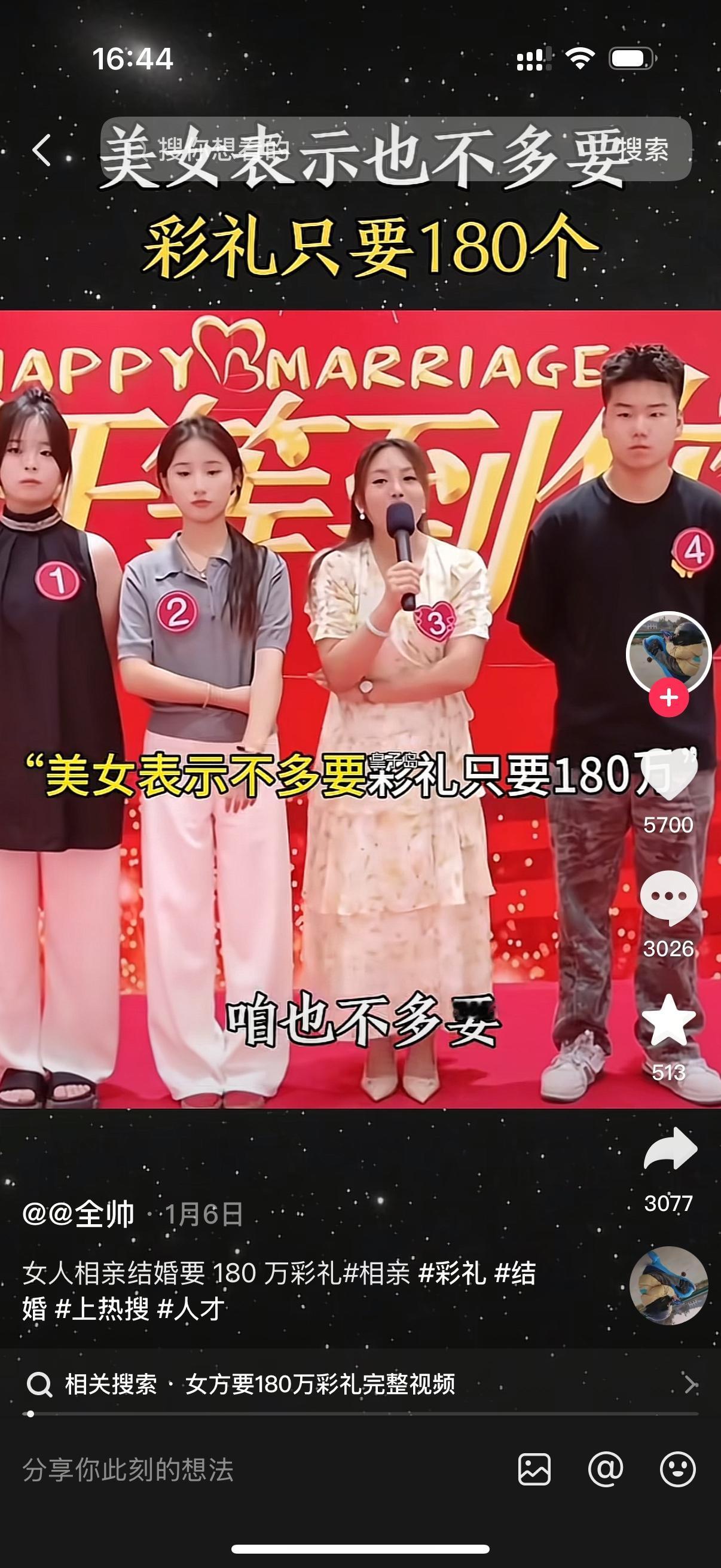 美女张口就来,我也不多要,彩礼就180万。180万还不到你一年的这个收入。男子没说什么,媒婆已经不淡定了。媒婆上下打量了一番美女,说你浑身上下我看了一眼,你哪个位置值180万的聘礼呢?美女傲娇地问,我哪不值了?媒婆说,八抬大轿抬的是大家闺秀。明媒正娶娶的是贤妻良母。高薪聘娶娶的是清白之身。我想问一下,你符合这三条中的哪一条?美女自信的说,我学历高啊,我长得好看啊。媒婆问,你长的好看吗?家人们。台下一片哗然。美女恨不得找个地洞钻进去。