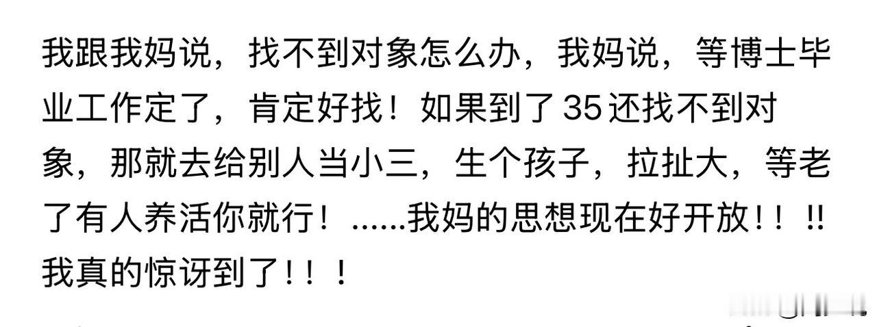 三观炸裂!现在的家长思想这么开放了吗?虽然是安慰女儿好好读完博士毕业,但这教育理念有问题啊,道德底线不能破,教唆女儿万一将来找不到对象,就去给别人当小三,生个孩子,拉扯大防老,这观点我是万万不支持啊…….#寻美三湘# #长沙新朋友#