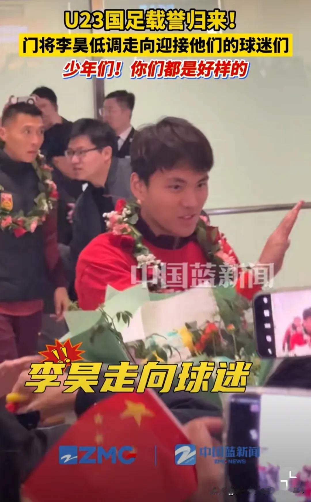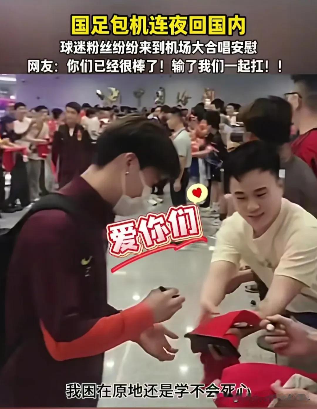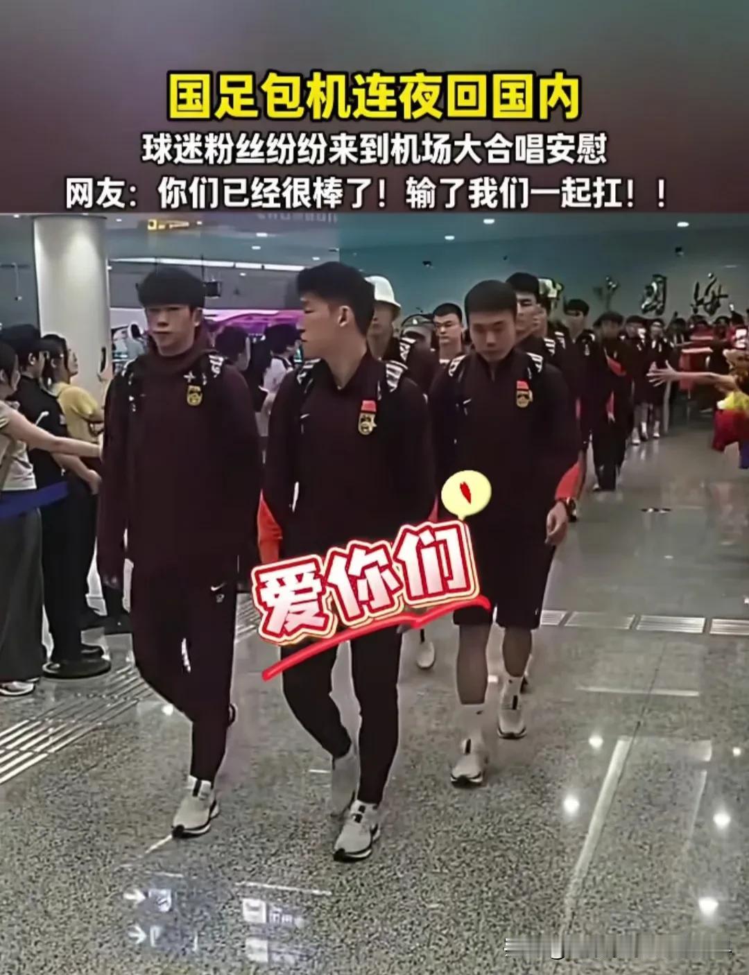 这一幕真是看哭了! U23男足包机回国,刚出来时还有点垂头丧气,可看到大批球迷合唱安慰,他们渐渐挺起了头,同球迷互动。赛场上的门神李昊,在面对球迷的热情时,竟还有些腼腆、有些手足无措! 不管输赢,这样男足值得! 就算在冬天,除了教练几人拉了行李箱,其他队员基本就是一个背包,说明他们把精力放在了足球上;其次,他们打破了22年来国足无缘决赛的记录,可面对0:4输于日本,他们还是感觉沮丧和羞愧。知耻而后勇! 他们的努力拼搏,是两代人的足球希望传承! 安东尼奥继续执教,球队建制完整保留。李昊、王钰栋等入选国家队考察名单,未来将兼顾U23国足与国家队赛事。国足有你们就有希望! 网友:“我也曾像个傻子拼命的爱你,现在又像个疯子拼命的忘记,我困在原地还是学不会死心”——爱你们!