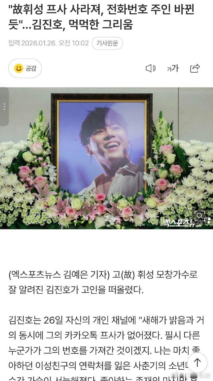 好友长文悼念辉星 据报道,歌手金振浩近日发文追忆已故好友辉星。文中提到,辉星的KakaoTalk账号头像近期被更换为系统默认头像,推测其电话号码可能已被他人接手使用。金振浩描述了由此产生的复杂感受,并表示自己尚未能删除该联系人。据悉,辉星于去年3月离世,享年43岁。