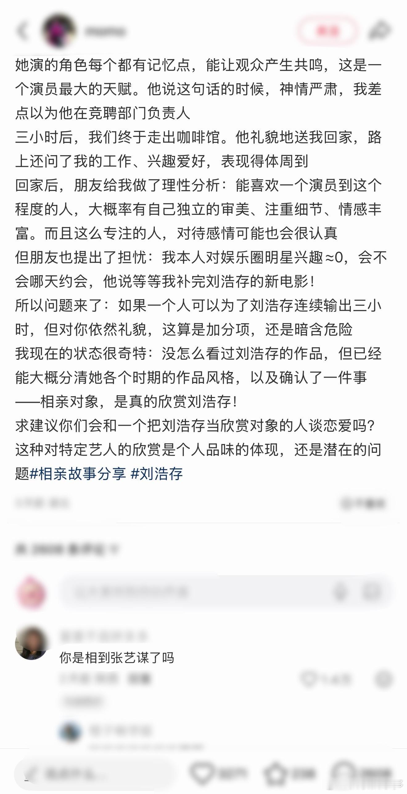 去相亲被安利三小时刘浩存刷到一篇帖子女生去相亲,被男方安利了三个小时刘浩存,从浩存学舞蹈蹈演员的历程全给介绍的清清楚楚,整整三个小时,网友也是开玩笑到:你是相到张艺谋了吗00后新生代热点捕捉计划