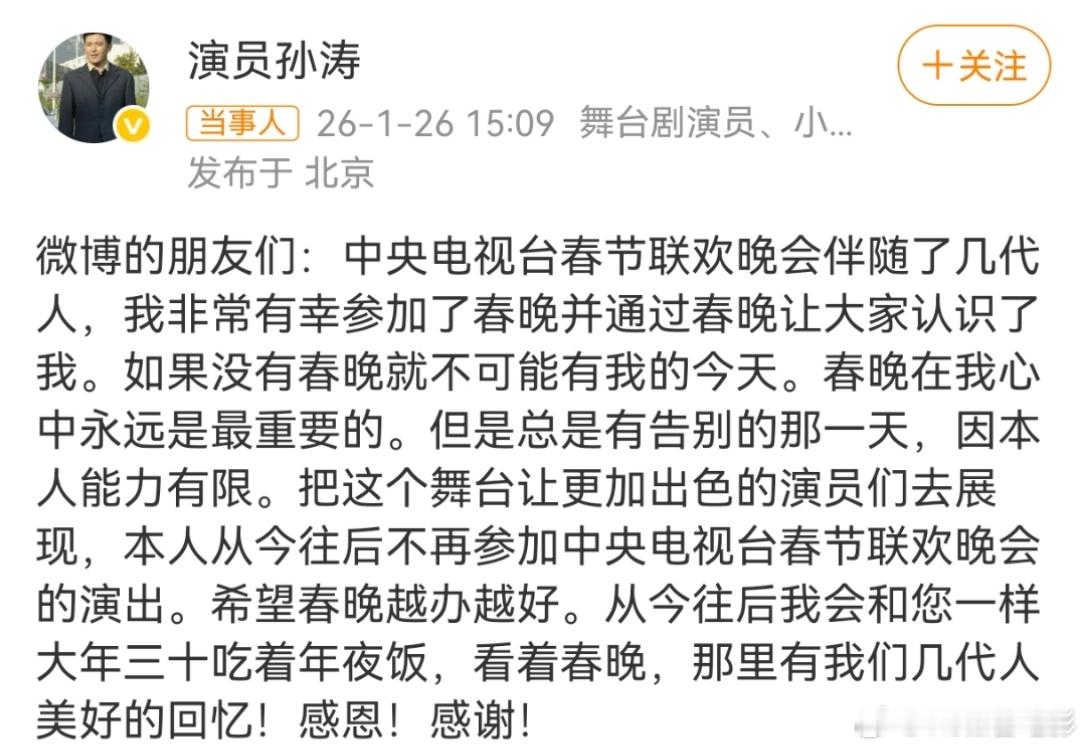 参与了18届春晚的孙涛官宣退出以后春晚…是因为最近的网络舆论吗?演员孙涛宣布告别春晚