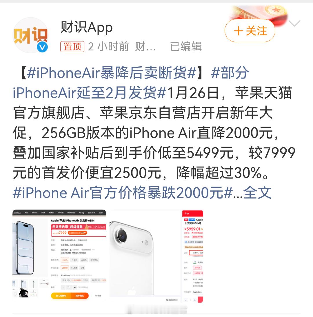 荣耀林林谈iPhoneAir降价【iPhoneAir暴跌2000元】苹果天猫官方