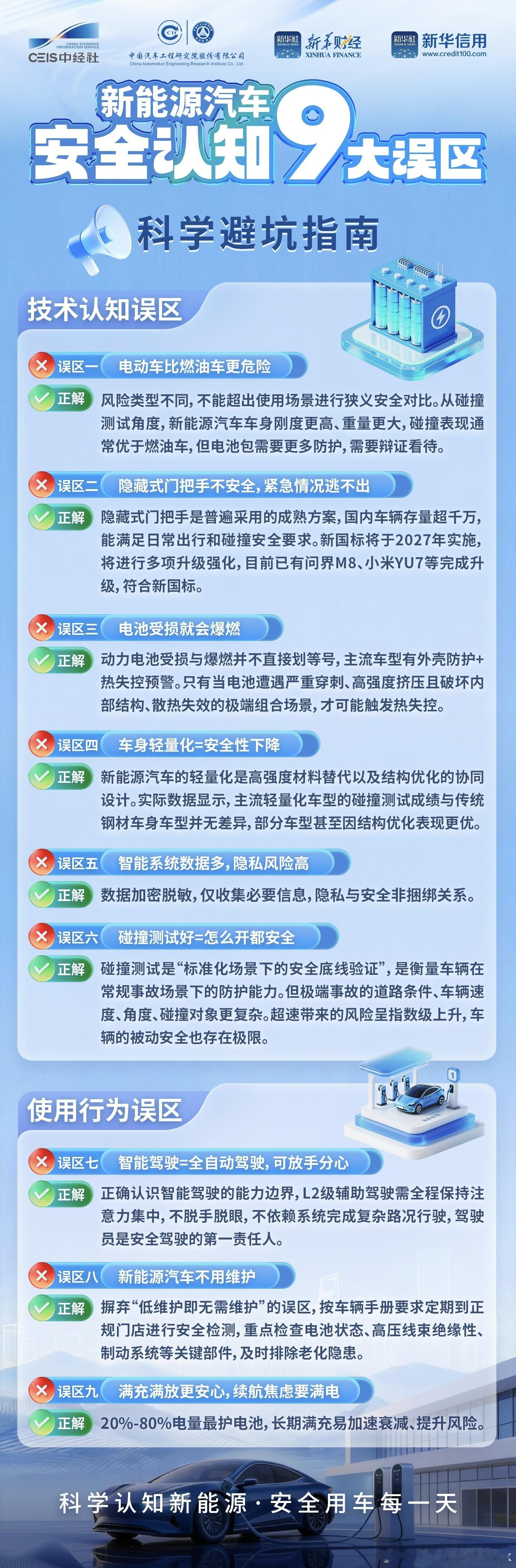 澄清9大新能源车安全误区 看了下里面的内容讲得很好,现在市面上各种乱科普和张口就来的假消息满天飞,就需要这种权威机构和媒体出来将一些明显的技术认知误区和驾驶行为误区给讲透和辟谣。拿电动车对比燃油车危险性来说,这个就是很片面的看法,还是要看具体的车身刚度和综合安全性,从这方面角度来看主流新能源在被动安全和主动安全上都要比同档的燃油车要强。主流车型现在都有外壳防护+热失控预警,还有电池新国标加持。只要不是极端的挤压穿刺或者超高速碰撞场景,即使电池受损都能够相对安全。还有一个误区就是车身强度高,碰撞测试好就能随便开,其实这些测试都是在正常驾驶状态下的场景,安全的前提是速度。要是飙车超速或者高速开智驾睡觉这些极端用车环境,说实话不管你开啥车都是神仙难救。不超速不飙车开辅助驾驶也要专心看路准备接管,这样的情况下安全风险会降低很多,我们看到的很多严重人伤亡事故,基本都是开快车以及不安全驾驶导致。最后就是隐藏门把手不安全的误区, 汽车隐藏式门把手存量超千万,特斯拉在中国就卖了300万辆隐藏式的门把手。事实上很多隐藏门把手方案在正常事故情况下都能够弹出拉动,能满足日常出行和碰撞安全要求。就算在车门挤压变形的这种极端情况下,看了很多事故即使是机械门把手也不能保证能够拉动车门。2027年的新国标也进一步规范了车门把手的要求,要求有外把手有机械结构。目前小米YU7和问界M8就符合新国标的要求。大家看到刷到新能源起火和事故多,其实很多都是关注度高,有话题性。实际上燃油车的车祸和起火事件数量和比例都更多,只是大家习以为常不去讨论罢了。不管开什么车,还是那句话自己是驾驶安全的责任人,不超速不飙车,开辅助驾驶也要专心手握方向盘。十次事故九次快,不要挑战车辆和自己生命的极限。