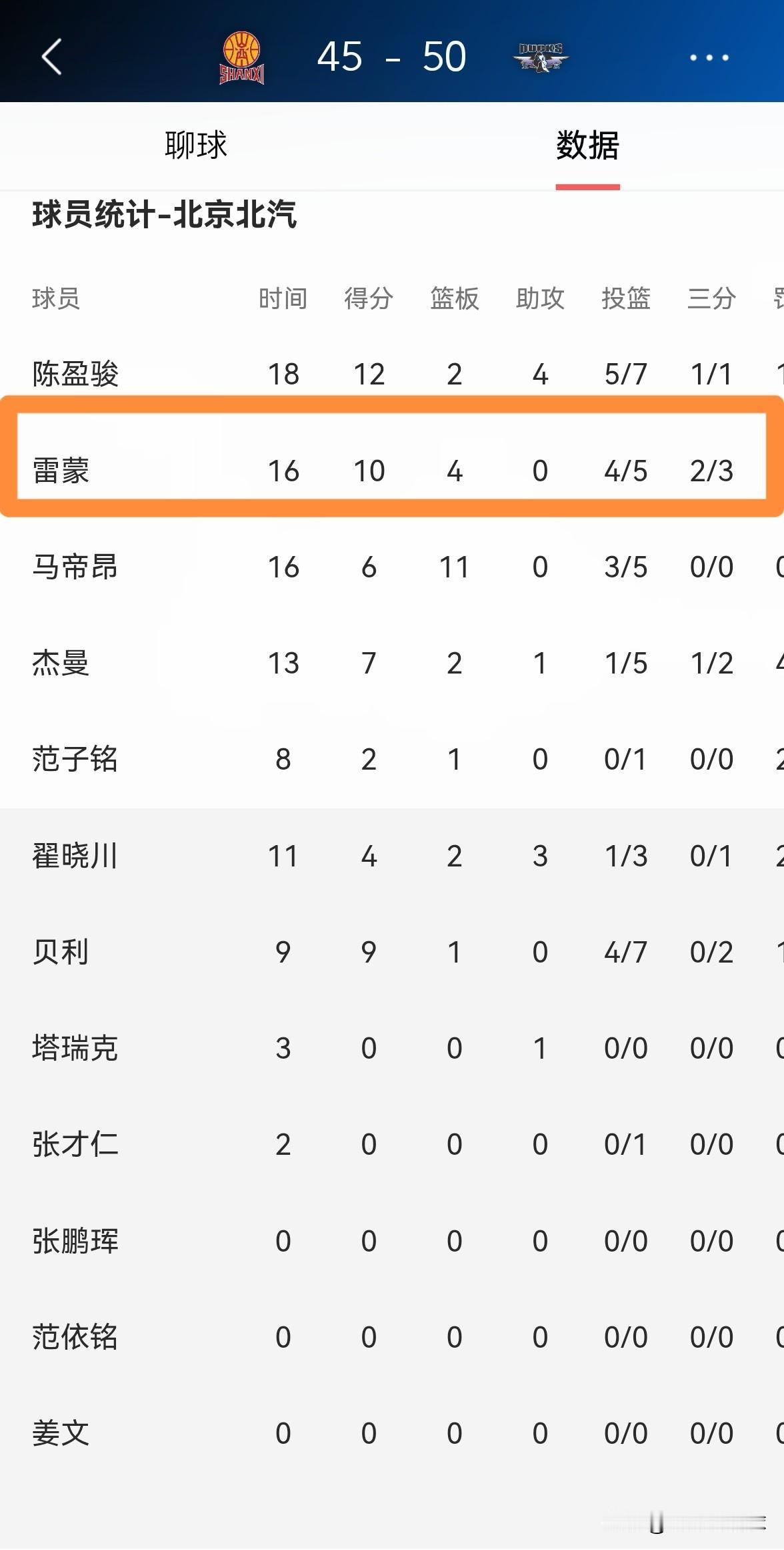北京北汽大将雷蒙真是让人吃惊不已!在今天北京北汽客场挑战山西汾酒的比赛中,目前双方的上半场比赛已经结束,北京北汽以50:45领先对手5分。在前两节比赛中,雷蒙化身为了球队的主要得分手,他在首发出战的16分钟里,投篮5中4,其中三分球3中2非常高效的得到10分,还有4篮板,他的场上正负值为+2。 在上半场比赛中,雷蒙最让我感到惊讶的是,他不仅能够命中空位三分,而且可以持球强杀篮下,我万万没有想到雷蒙的进攻手段竟然如此丰富。