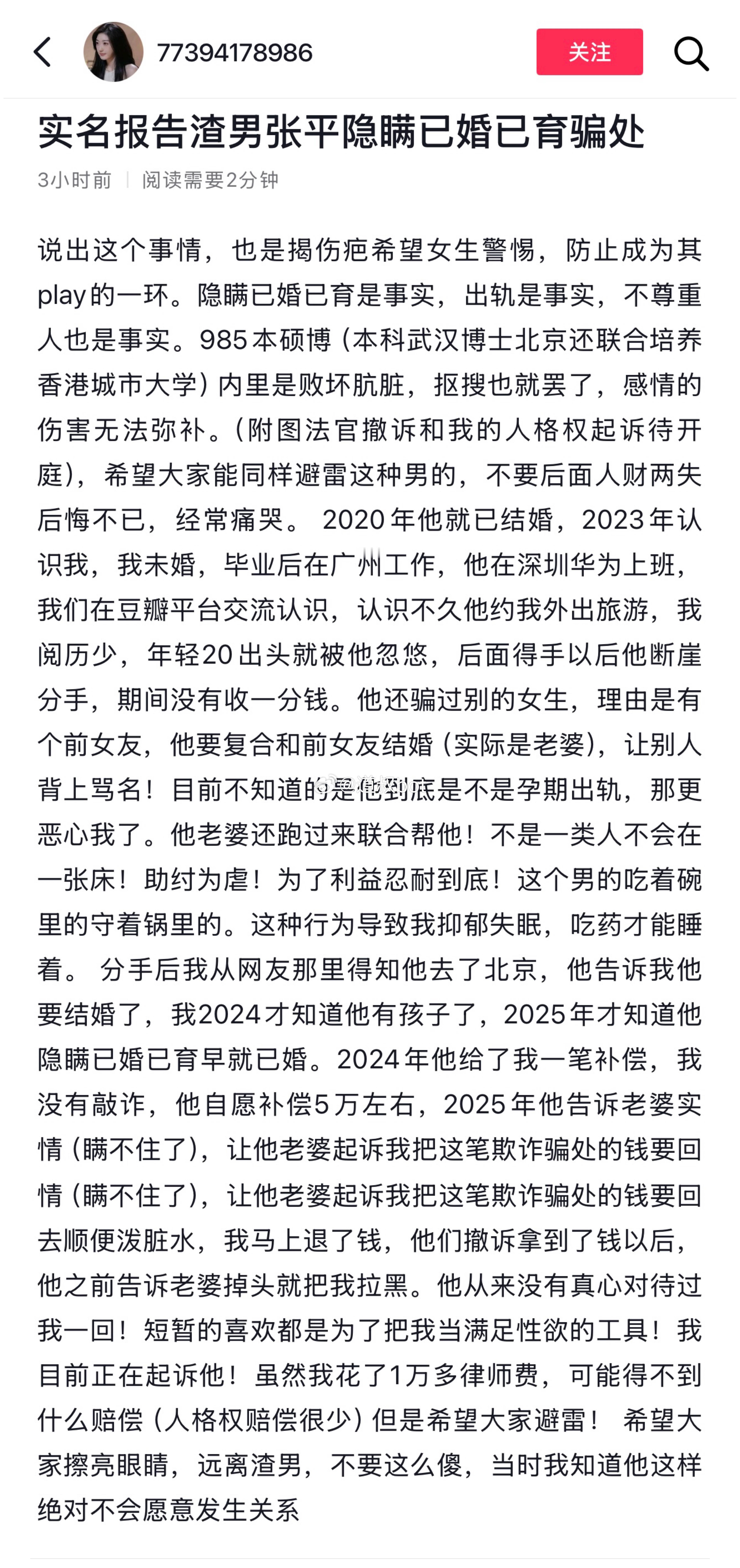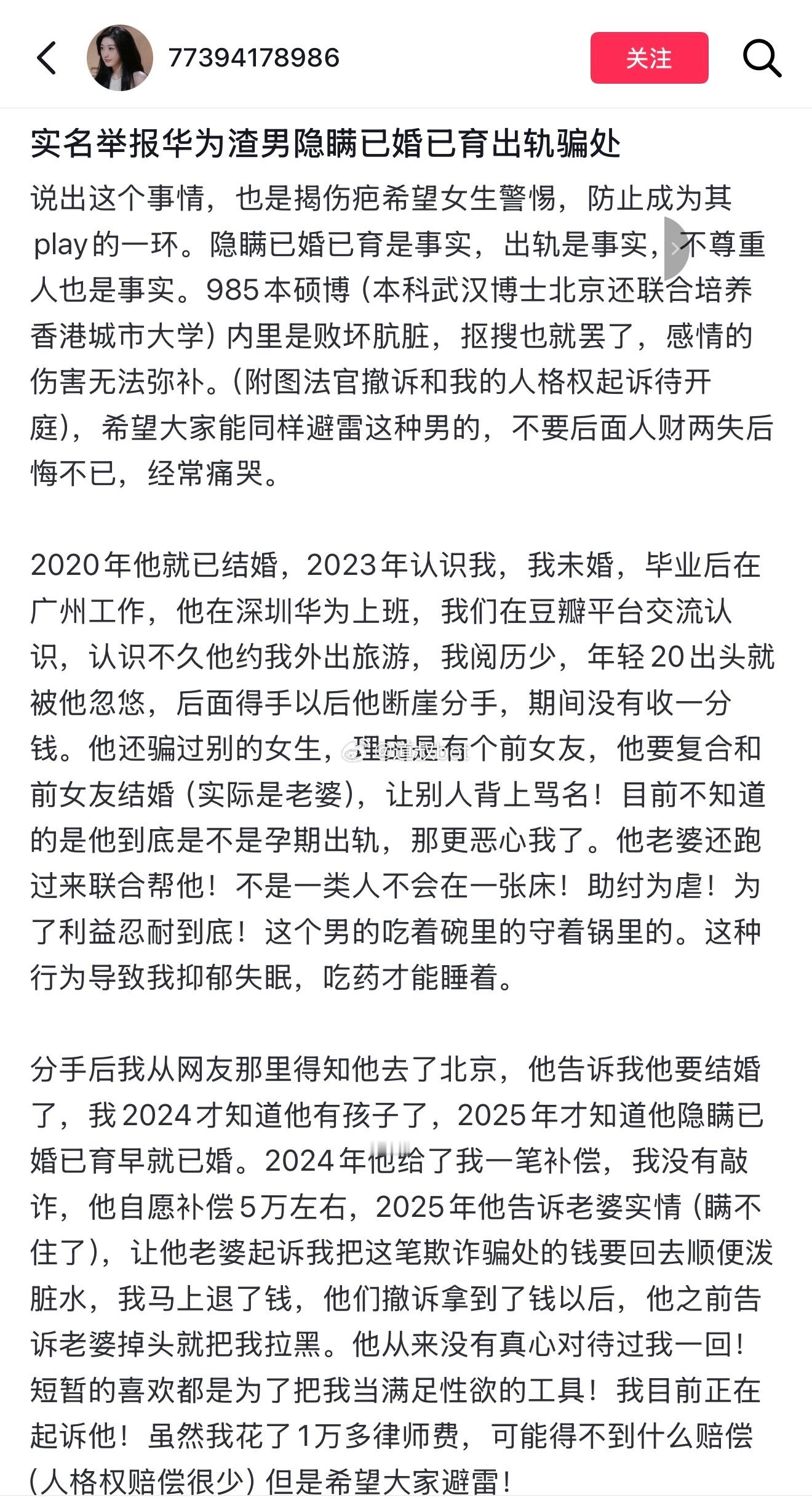 网友爆料,华为渣男隐瞒已婚已育,还被骗处。