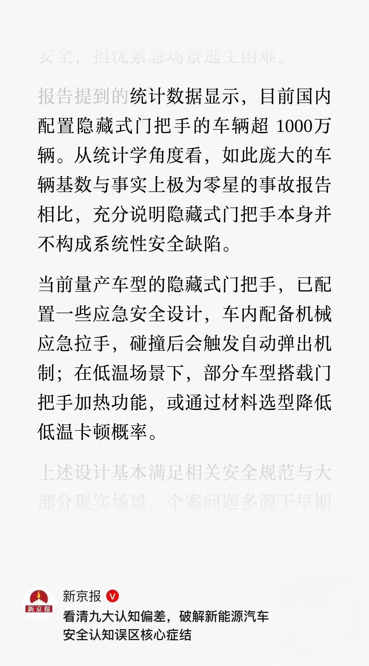 汽车隐藏式门把手存量超千万澄清9大新能源车安全误区现在很多人在用新能源汽车,其中隐藏式车门经常是讨论的焦点。统计数据显示,目前国内配置隐藏式门把手的车辆超 1000万辆。从统计学角度看,如此庞大的车辆基数与事实上极为零星的事故报告相比,充分说明隐藏式门把手本身并不构成系统性安全缺陷。所以,不用担心隐藏式车门的安全问题。