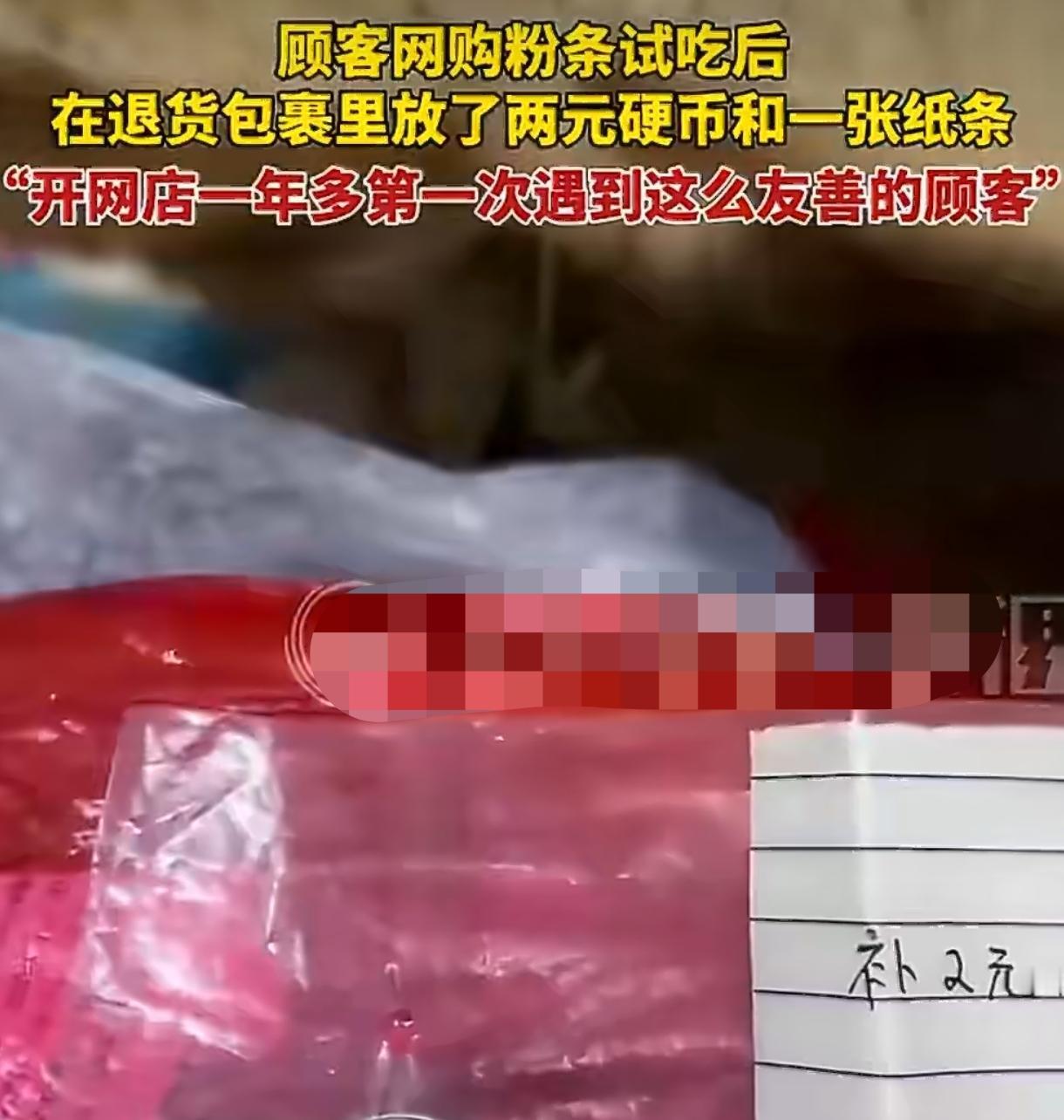 顾客试吃粉条退货塞2元补偿,这波温柔操作暖哭店主 真的被这位网购顾客的细节暖到了!安徽一位店主拆退货包裹,发现顾客试吃一点粉条后,特意塞了2元硬币还附纸条补偿,开店一年多头回遇这暖心事儿。 顾客网购粉条后应该是尝了一点觉得不合适,选择退货的同时,没有理所当然,反而记挂着试吃的部分,特意准备了2元硬币装在小塑封袋里。 还手写了纸条说明是补试吃的钱,全程没在店铺线上留言,默默做完这一切就寄出了退货,这份自觉和真诚,让店主拆开包裹时满是惊喜和感动。 店主直言开网店一年多,遇到过各种退货情况,有蛮不讲理的,也有默默退货的,但这样会为试吃部分主动补偿的顾客,还是第一次碰到。 小小的2元钱,钱数不多,却藏着最珍贵的分寸感,顾客没有因为网购的距离感就忽视商家的利益,反而用细节守住了人与人之间的相处边界。 网上购物难免有试吃试用的情况,不少人会觉得“试一下没关系”,殊不知商家背后要承担相应的成本,这份看似微小的补偿,实则是对他人劳动的尊重。 店主把这份暖心经历分享出来后,网友们纷纷为这位顾客点赞,有人说这是刻在骨子里的善良,也有人感慨细节见人品,小小的举动太戳人了。 其实网购的本质也是人与人的交往,一方用心经营,一方真诚相待,哪怕是退货这样的小事,也能因为彼此的体谅,让冰冷的网络多一份温度。 有网友调侃说,这2元钱比很多人的千言万语都管用,不仅让店主感受到了尊重,也让大家看到了网购中最美好的样子,真诚永远是必杀技。 也有人说,这样的顾客真的太难得,看似简单的一个举动,却体现了良好的修养,知道换位思考,懂得为自己的行为负责,这份素养格外珍贵。 善良从不是惊天动地的大事,而是藏在举手投足的细节里,一分钱的分寸感,抵得过千万句的客套。 在这个快节奏的网购时代,我们见过太多因为退货、售后产生的矛盾,而这位顾客的举动,像一束光,照亮了人与人之间最本真的善意。 店主的感动,不仅是因为那2元钱,更是因为感受到了被理解、被尊重,这份双向的温柔,才是网购中最该有的模样。 网络从来都不是法外之地,更不是不讲道理的地方,多一份体谅,多一份分寸,就能让彼此的相处都变得舒服又温暖。 人与人之间的信任,往往就藏在这些小事里,你守分寸,我懂珍惜,简单的美好,才最动人。每天跟我涨知识 创作者推广计划 @DOU+小助手