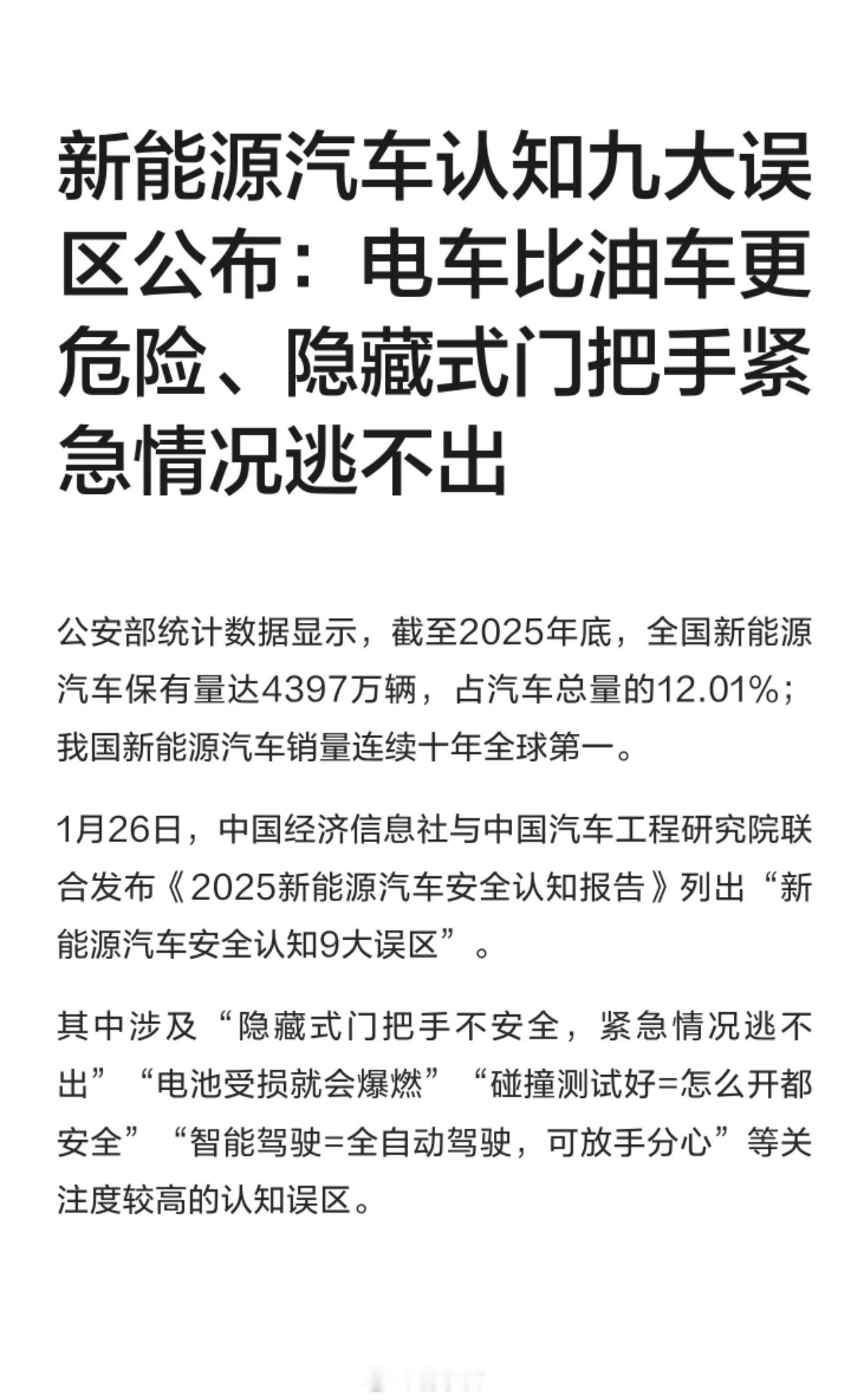 中国经济信息社与中国汽车工程研究院联合发布的《2025 新能源汽车安全认知报告》,澄清9大新能源车安全误区,也让市场看到新能源车安全体系的真实发展水平。汽车隐藏式门把手存量超千万 隐藏式门把手的安全性争议一直存在,却被忽视了其技术迭代与标准规范的双重保障。当前量产车型均配备车内机械应急拉手、碰撞自动弹出机制,小米YU7、问界M8 等车型更提前落地外部机械解锁的安全冗余设计;而即将实施的新国标,不仅禁止全电子控制设计,还对机械解锁装置、高低温适应性、静态拉力等提出严苛要求,从法规层面筑牢“生命通道”的安全底线。千万存量的背后,是技术成熟度的印证,更是行业对安全设计的持续优化。动力电池并非受损即爆燃,高强度外壳防护、电芯隔热设计、BMS 实时监测形成多层级防护,仅极端组合场景才可能触发热失控,且 2025 年新能源车起火事故率已降至万分之 0.5 以下,首次低于燃油车的万分之 0.7。碰撞测试是标准化场景的安全底线验证,却无法覆盖所有极端路况,超速和违规才是事故主因,时速超 160 公里的碰撞事故死亡率近乎 100%,绝非车辆安全设计能弥补。当下的智能驾驶均为辅助级别,再高阶的系统也无法替代人为判断,驾驶人始终是行车安全的第一责任人。此外,车身轻量化 ≠ 安全性下降、满充满放并非护电池、新能源车并非无需维护等误区,也被报告逐一厘清。新能源汽车的安全,从来不是单一技术的比拼,而是法规、技术、监管、使用的协同结果。产业发展的同时,车企需坚守技术创新底线、规范宣传口径,避免过度营销。而我们也更需理性看待新能源技术,摒弃固有认知偏差,坚守安全驾驶准则。