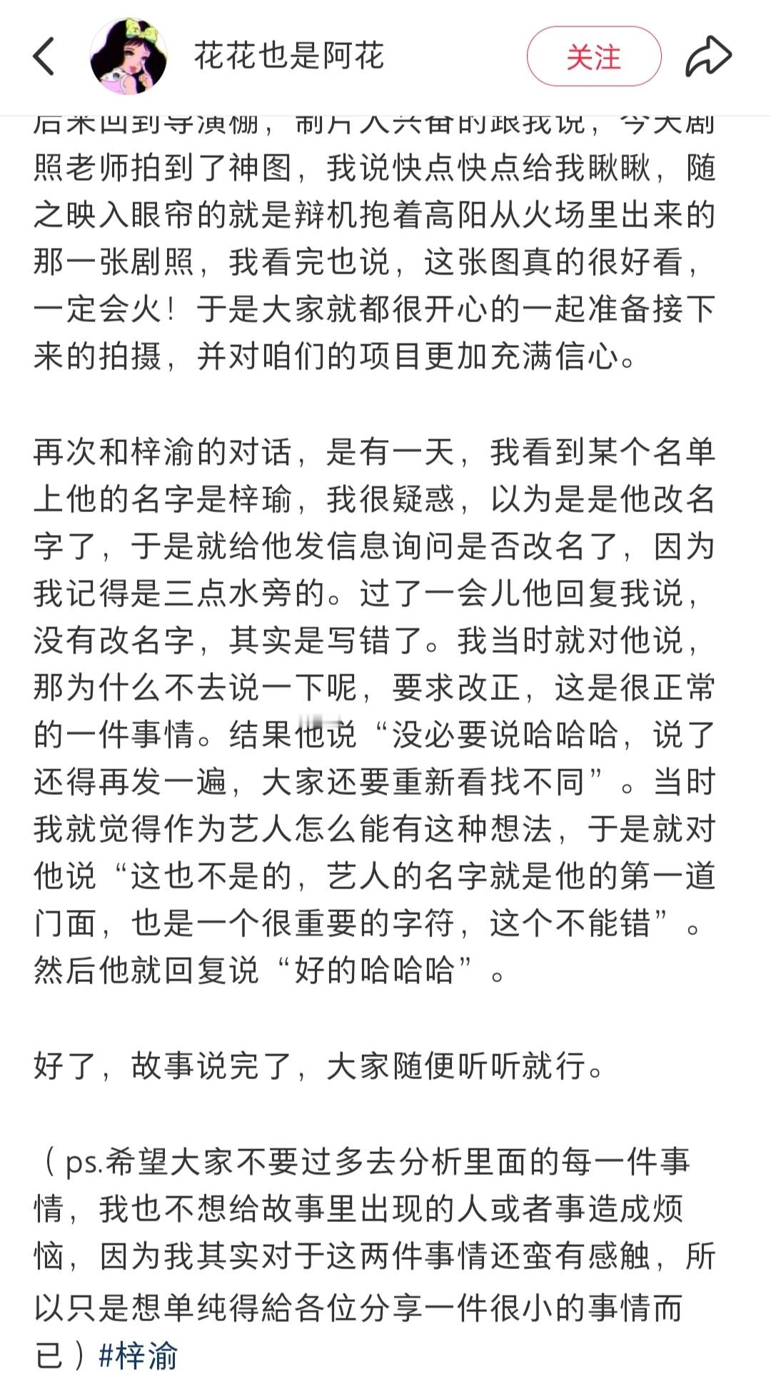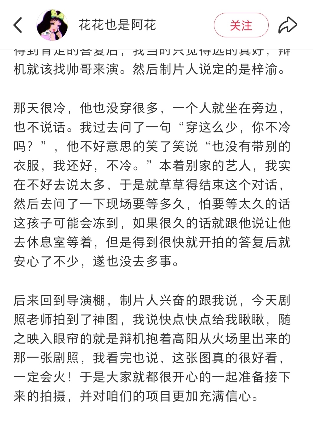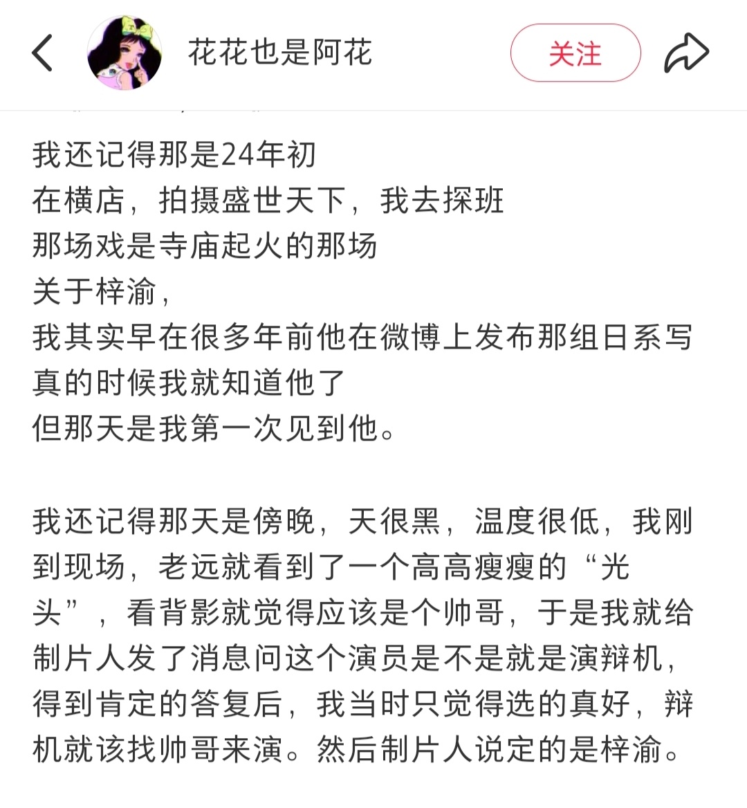 圈内经纪人分享关于梓渝的故事 一位圈内经纪人分享了「关于梓渝的小故事」我还记得那是24年初在横店,拍摄盛世天下,我去探班 那场戏是寺庙起火的那场关于梓渝,我其实早在很多年前他在微博上发布那组日系写真的时候我就知道他了但那天是我第一次见到他。我还记得那天是傍晚,天很黑,温度很低,我刚到现场,老远就看到了一个高高瘦瘦的“光头”,看背影就觉得应该是个帅哥,于是我就给制片人发了消息问这个演员是不是就是演辩机,得到肯定的答复后,我当时只觉得选的真好,辩机就该找帅哥来演。然后制片人说定的是梓渝。那天很冷,他也没穿很多,一个人就坐在旁边,也不说话。我过去问了一句“穿这么少,你不冷吗?”,他不好意思的笑了笑说“也没有带别的衣服,我还好,不冷。”本着别家的艺人,我实在不好去说太多,于是就草草得结束这个对话,然后去问了一下现场要等多久,怕要等太久的话这孩子可能会冻到,如果很久的话就跟他说让他去休息室等着,但是得到很快就开拍的答复后就安心了不少,遂也没去多事。后来回到导演棚,制片人兴奋的跟我说,今天剧照老师拍到了神图,我说快点快点给我瞅瞅,随之映入眼帘的就是辩机抱着高阳从火场里出来的那一张剧照,我看完也说,这张图真的很好看,一定会火!于是大家就都很开心的一起准备接下来的拍摄,并对咱们的项目更加充满信心。再次和梓渝的对话,是有一天,我看到某个名单上他的名字是梓瑜,我很疑惑,以为是是他改名字了,于是就给他发信息询问是否改名了,因为我记得是三点水旁的。过了一会儿他回复我说,没有改名字,其实是写错了。我当时就对他说,那为什么不去说一下呢,要求改正,这是很正常的一件事情。结果他说“没必要说哈哈哈,说了还得再发一遍,大家还要重新看找不同”。当时我就觉得作为艺人怎么能有这种想法,于是就对他说“这也不是的,艺人的名字就是他的第一道门面,也是一个很重要的字符,这个不能错”。然后他就回复说“好的哈哈哈”。好了,故事说完了,大家随便听听就行(ps.希望大家不要过多去分析里面的每一件事情,我也不想给故事里出现的人或者事造成烦恼,因为我其实对于这两件事情还蛮有感触,所以只是想单纯得給各位分享一件很小的事情而已)cr:花花也是阿花 郑朋梦女