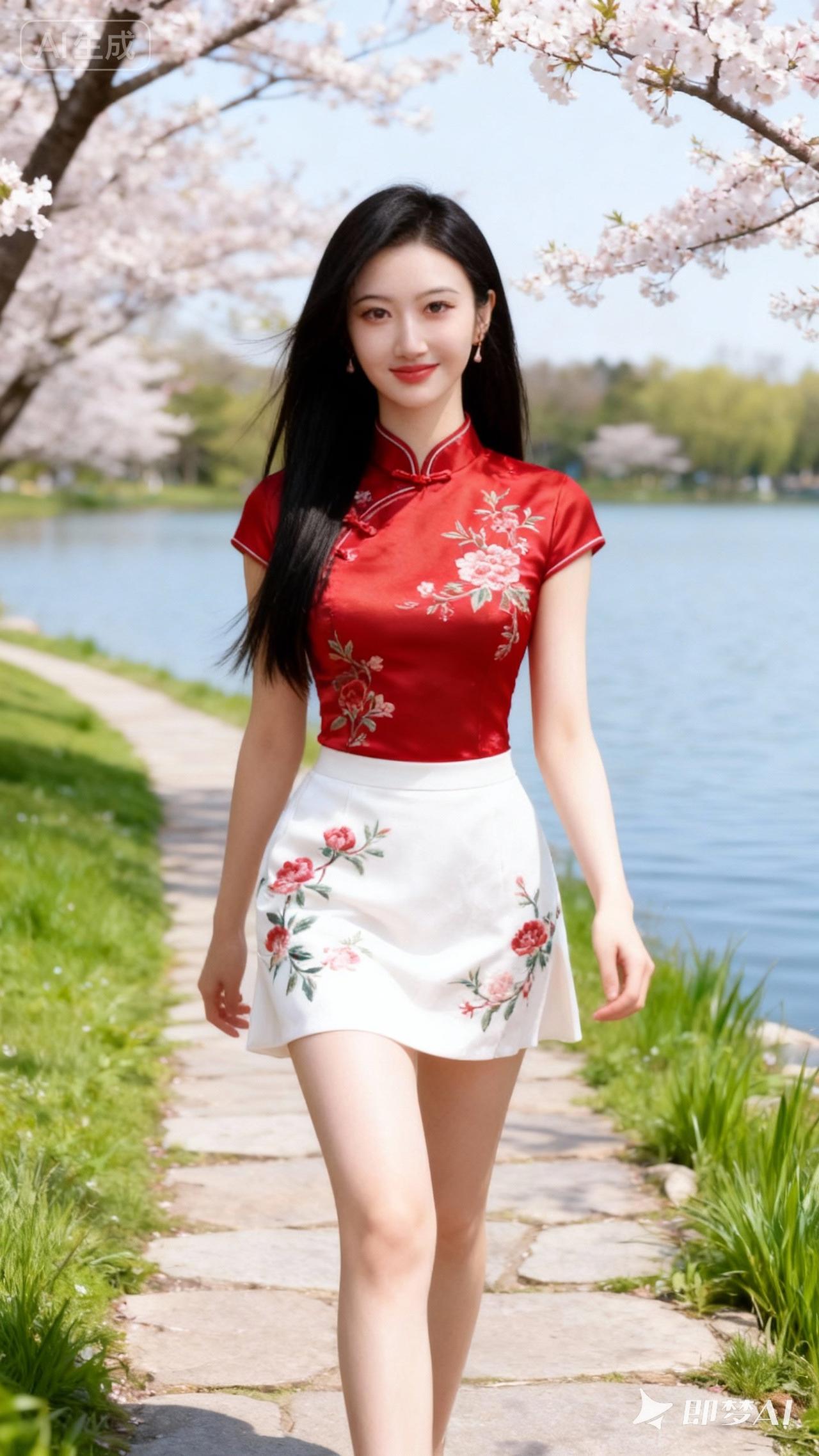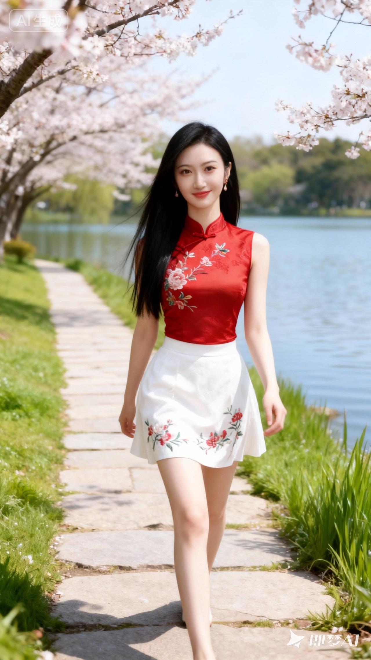 樱花树下,红衣少女漫步,春日气息扑面而来。