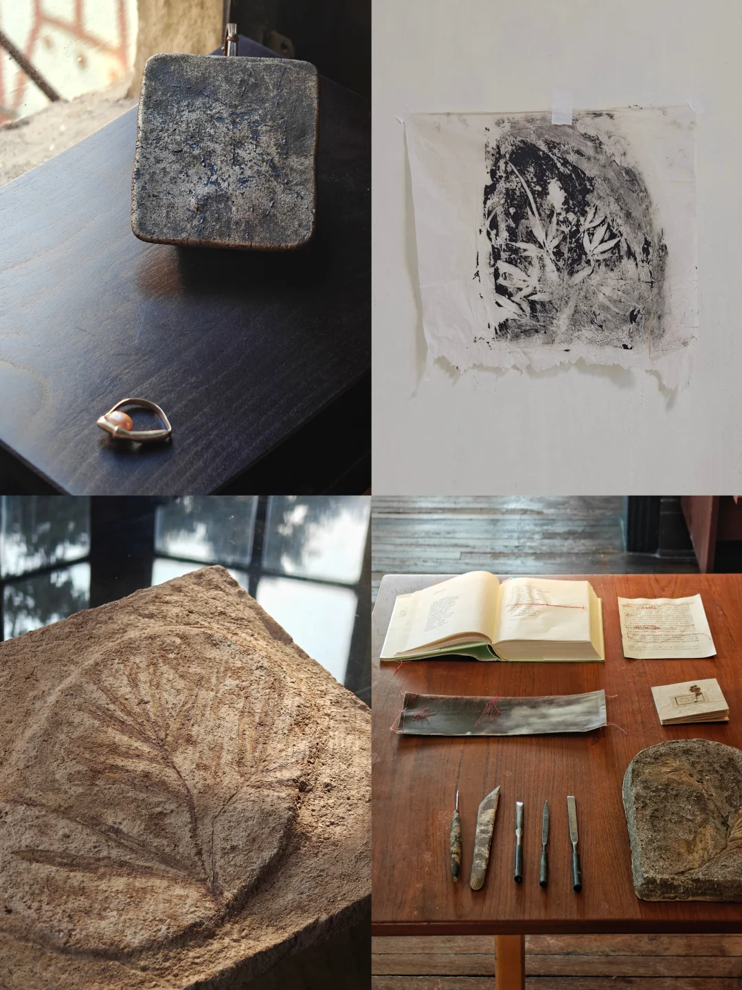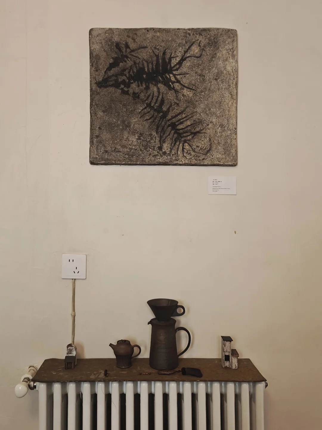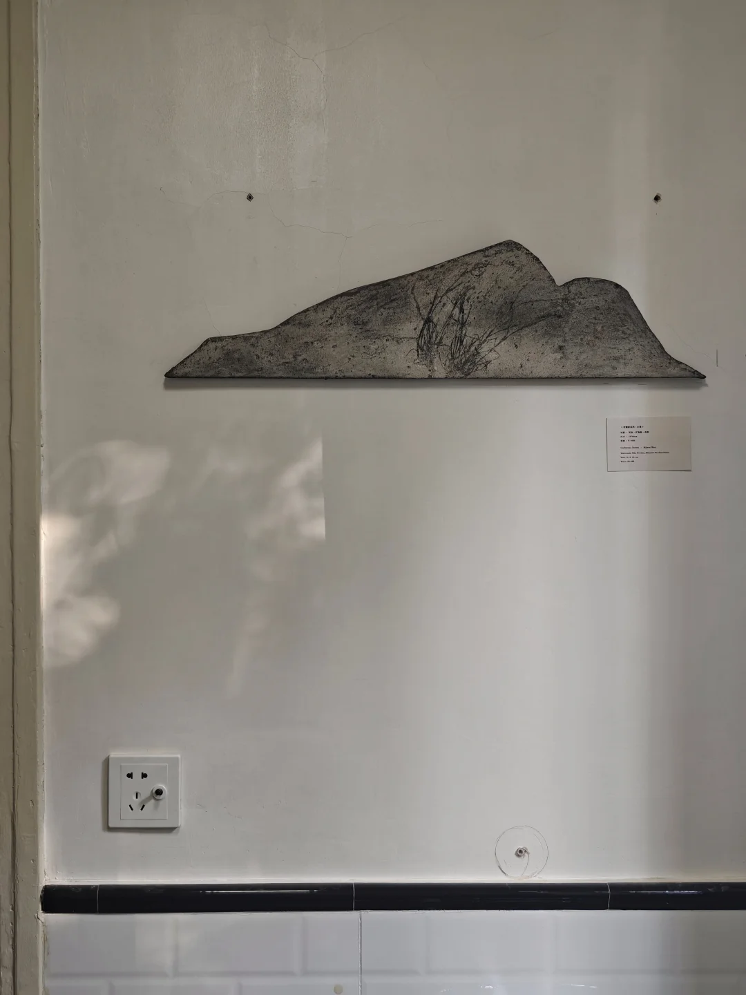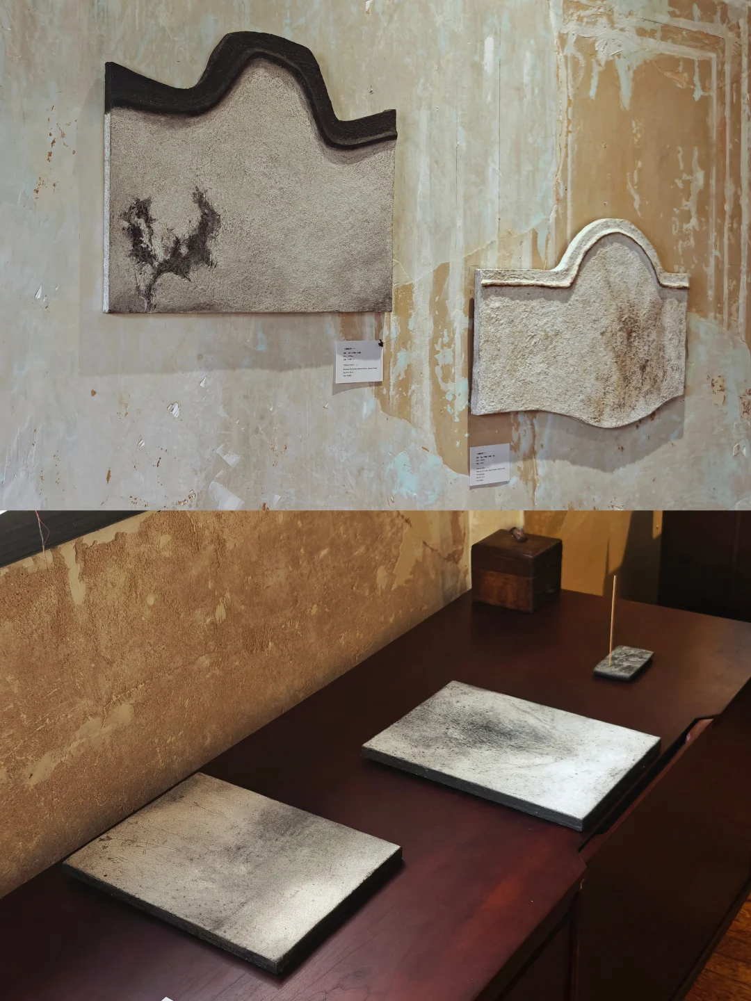 🌿她的灵感源于福州平潭的海岛故乡记忆,外婆家的石头厝、花岗岩火山岩、粗瓦灰和细瓦灰、空气中的盐粒、被海风侵蚀的岩石、肆意生长的野生植物,这些时光痕迹成为创作的质感基底。粗糙质感瓦灰、矿物为基底,草木以清晰痕迹或灰烬般的朦胧形态介入作品,呈现时光沉淀后的真实与温润。