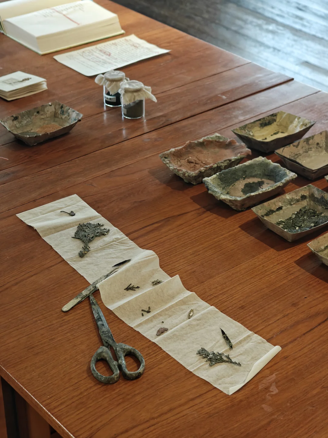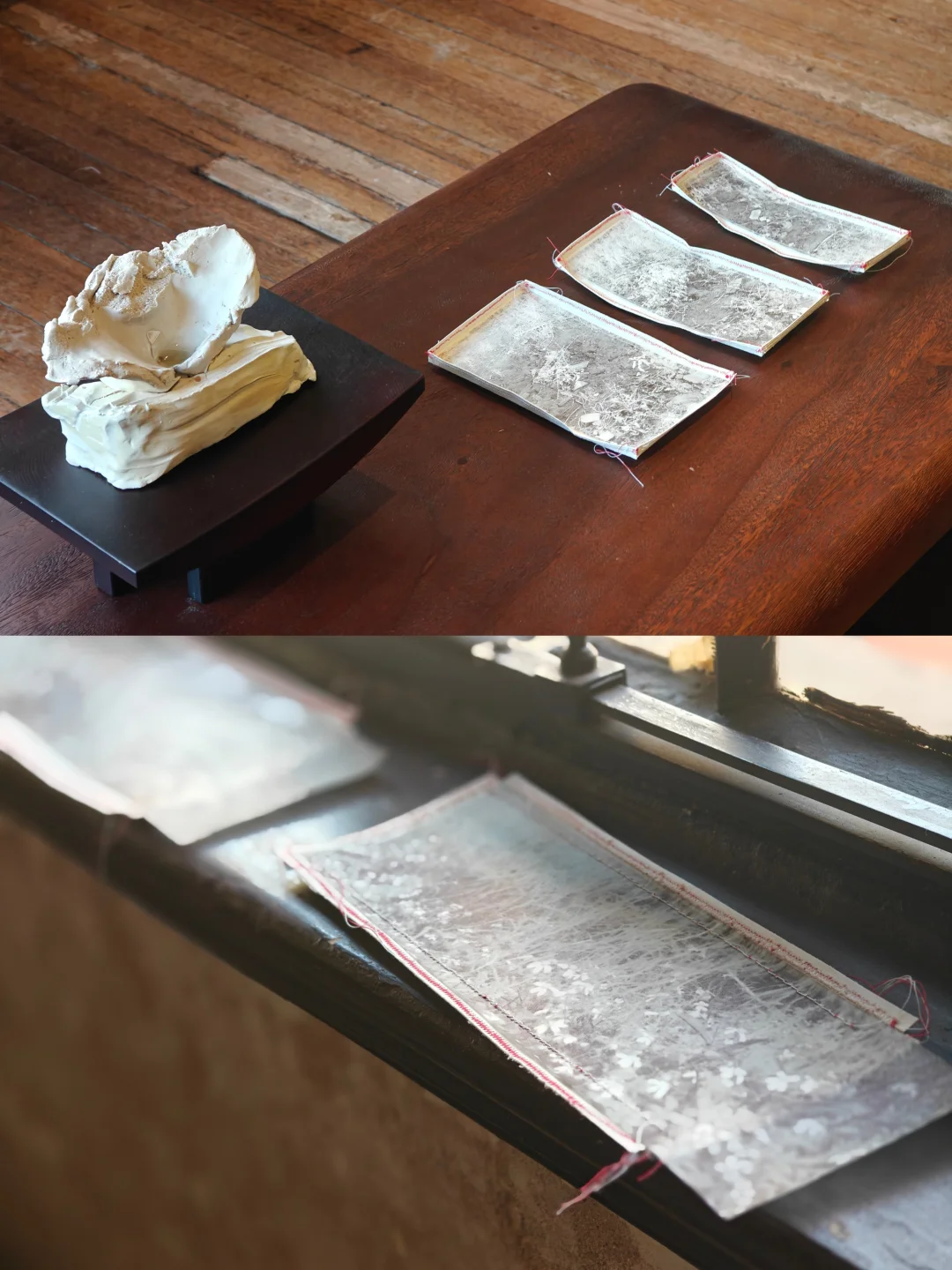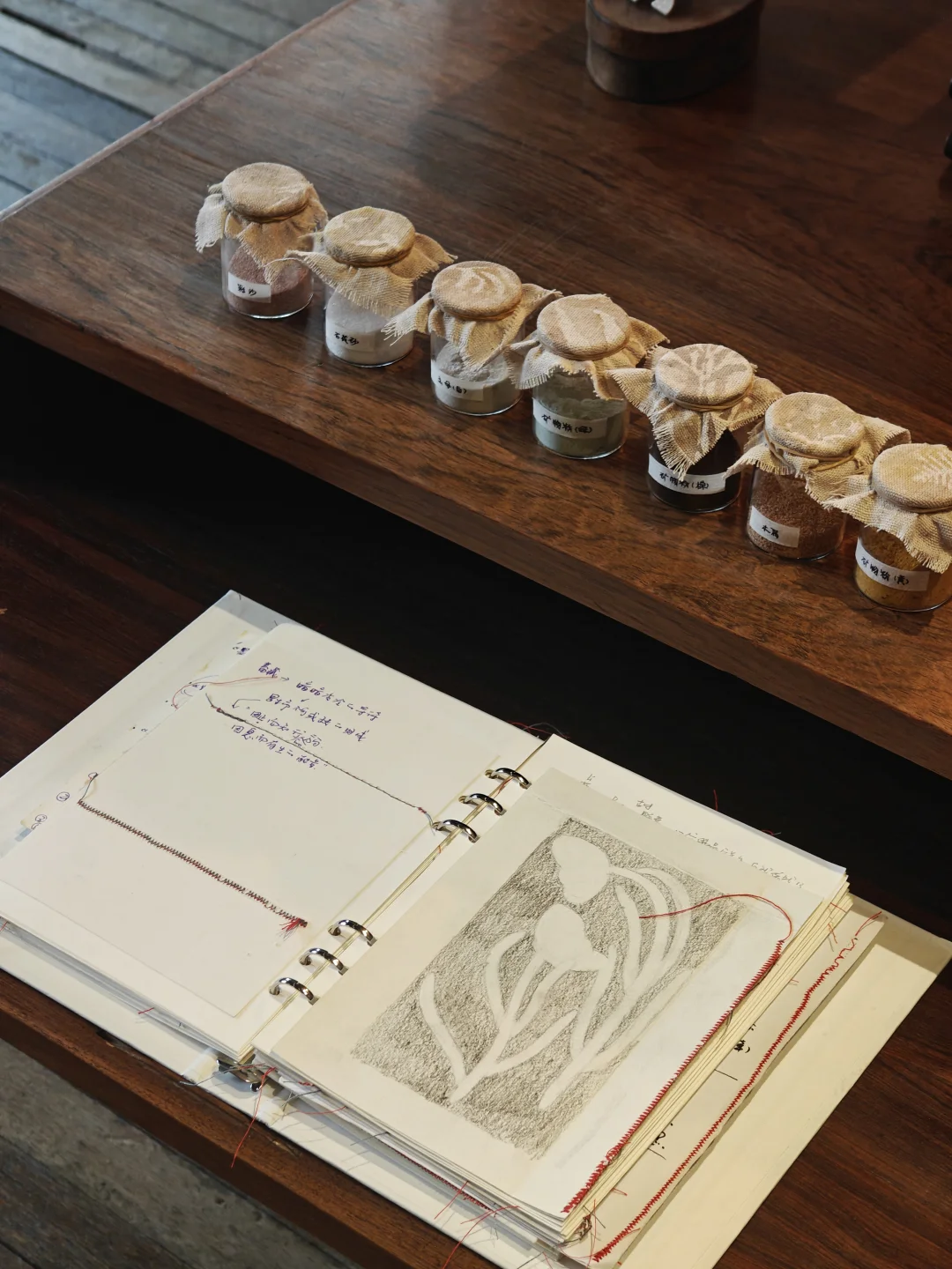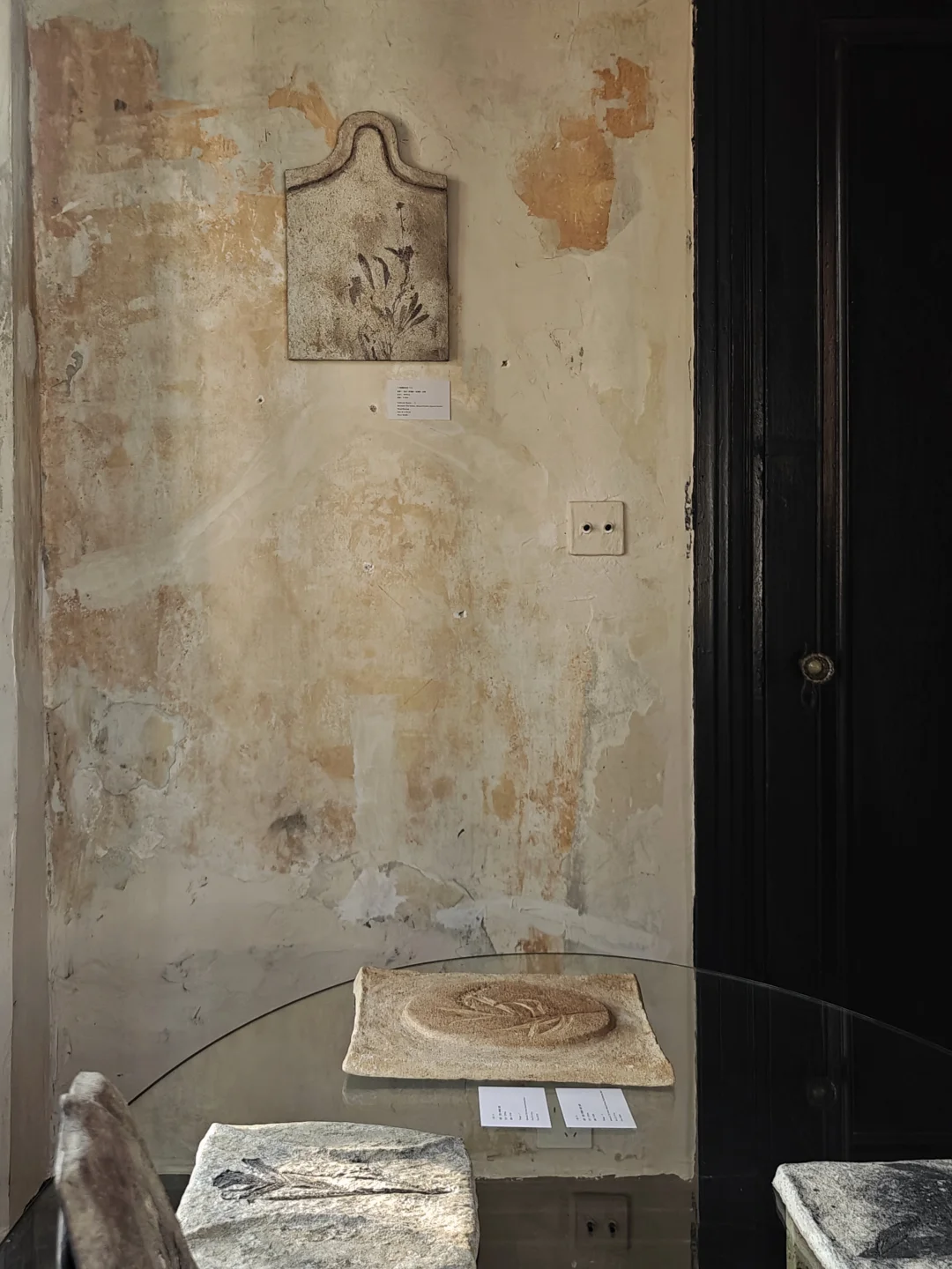 🌿她的灵感源于福州平潭的海岛故乡记忆,外婆家的石头厝、花岗岩火山岩、粗瓦灰和细瓦灰、空气中的盐粒、被海风侵蚀的岩石、肆意生长的野生植物,这些时光痕迹成为创作的质感基底。粗糙质感瓦灰、矿物为基底,草木以清晰痕迹或灰烬般的朦胧形态介入作品,呈现时光沉淀后的真实与温润。