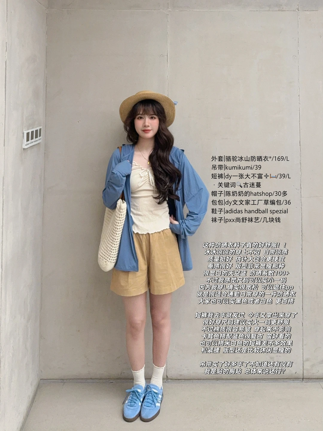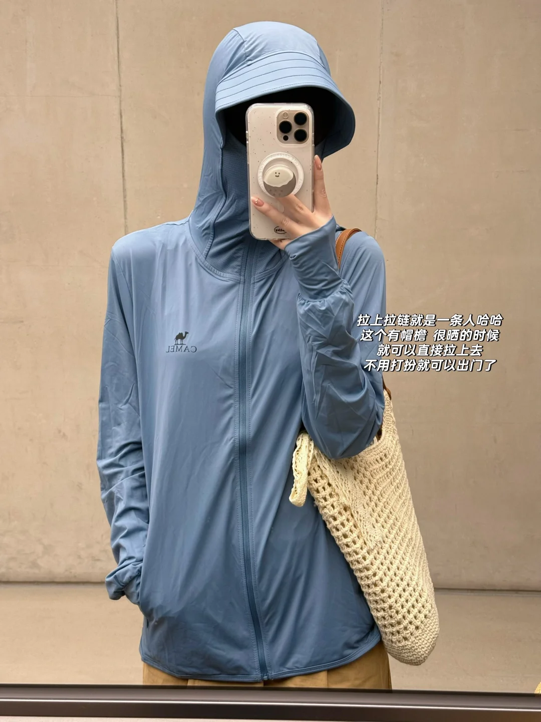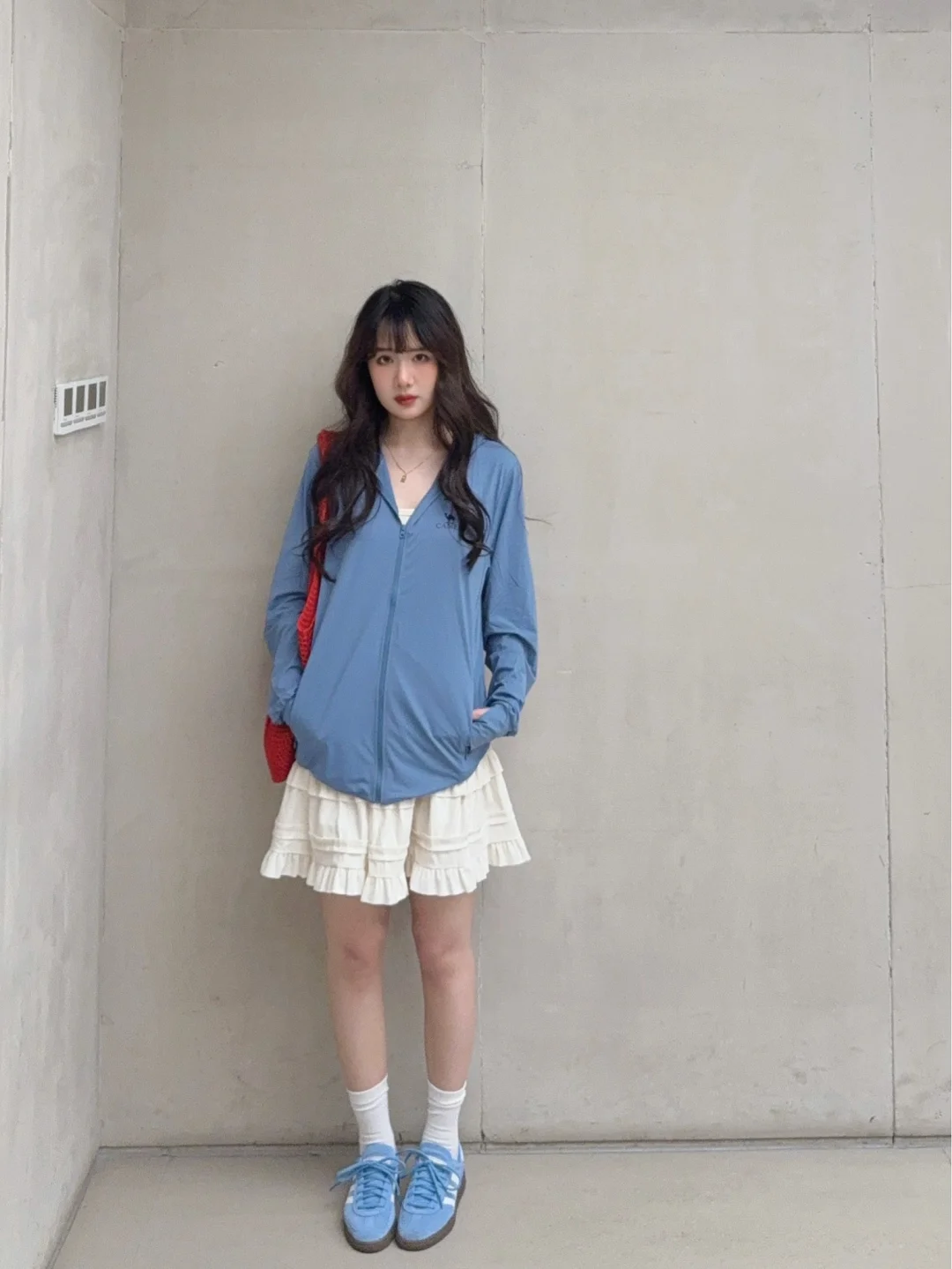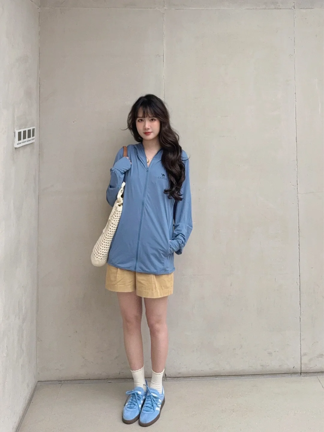 168/107 一期蓝色防晒衣的一衣多穿 白色或者米白色的防晒衣也可以参考哈 差不多类型 防晒衣很适合素颜穿 不用怎么打扮就很简单好看 这个拉链可以拉到脸颊的位置 而且帽檐也比较大 拉上上半身不会被晒到一点🫰🏻 不过穿防晒外套肯定比不穿要热哈 防晒第一步就是物理防晒 我一般夏天不拍照都会穿个外套遮一下 会比较有安全感哈哈哈