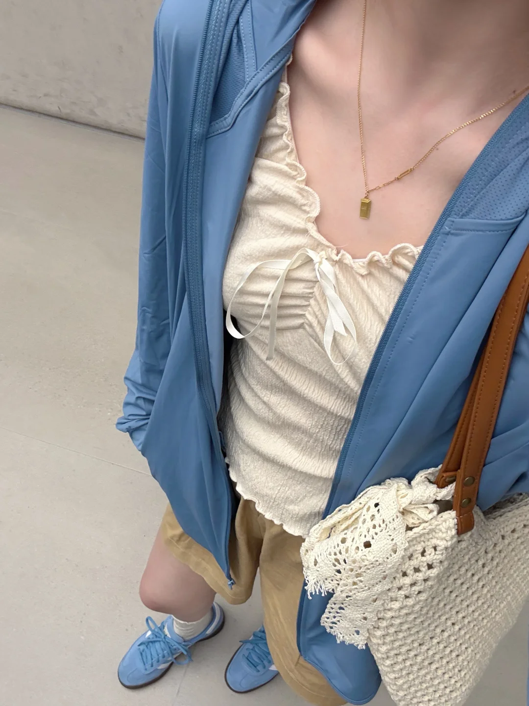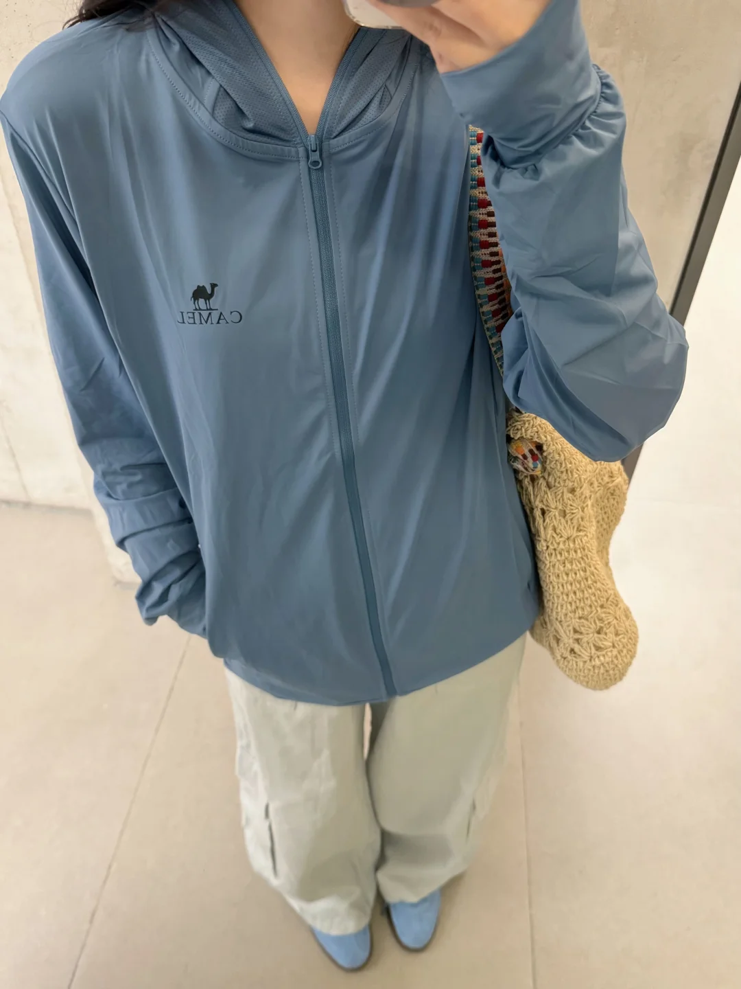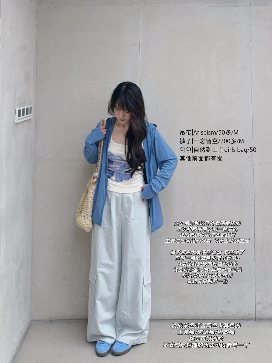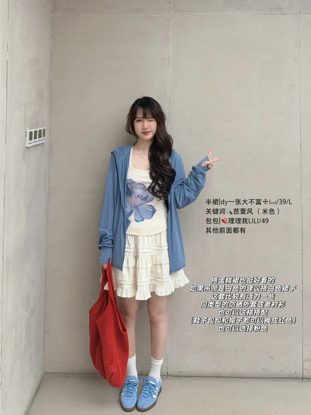168/107 一期蓝色防晒衣的一衣多穿 白色或者米白色的防晒衣也可以参考哈 差不多类型 防晒衣很适合素颜穿 不用怎么打扮就很简单好看 这个拉链可以拉到脸颊的位置 而且帽檐也比较大 拉上上半身不会被晒到一点🫰🏻 不过穿防晒外套肯定比不穿要热哈 防晒第一步就是物理防晒 我一般夏天不拍照都会穿个外套遮一下 会比较有安全感哈哈哈