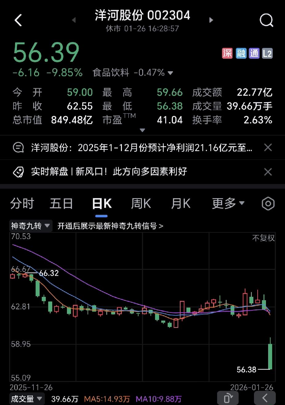 洋河股份跌惨了,朋友亏惨了! 洋河股份今天差点跌停,原来是净利润大跌。 一个月前,一个朋友说他在洋河股份买了二十万,我告诉他,白酒这段时间最好观望,不要买。 他却对白酒热情很高,这次洋河股份跌的那么惨,完全出乎他的意料。 再看他的另一只白酒股票五粮液,只差一步就破百了。 白酒至少过两个月后再说,不然真的跌的你怀疑人生不可。 现在的白酒绝不是入场的时候。 大家对此怎么看?洋河股份 洋河白酒 洋河酒水 洋河股份 洋河股票 洋河酒回收 洋河口粮酒
